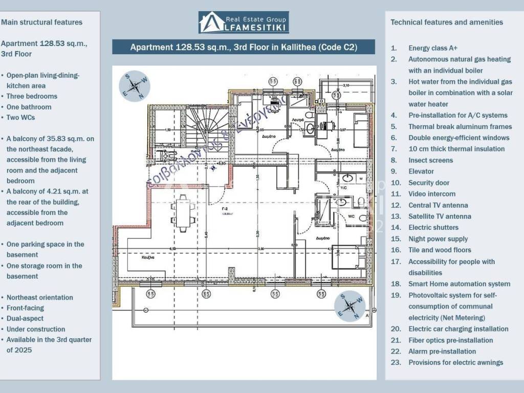 Available for sale Luxury Apartment 128.53 sq.m. on the 3rd Floor in Kallithea Discover a luxurious under-construction 128.53 sq.m. apartment on the 3rd floor of a modern six-story building in the heart of Kallithea. The contemporary design, energy efficiency, and high-quality materials make this apartment an ideal choice for families and professionals seeking comfort, functionality, and luxury. Space layout The apartment features an open-plan living, dining, and kitchen area that is bright and spacious, with large glass doors leading to a front balcony of 35.83 sq.m., perfect for relaxation or social gatherings. The three bedrooms are ergonomically designed, each with access to balconies that offer natural light and tranquility. The bathroom and two WC ensure convenience and functionality for all household members. The apartment also includes a basement storage room for additional needs and a parking space for vehicle security. Technical features and amenities It boasts an A+ energy rating with 10 cm thermal insulation and double-glazed energy-efficient windows, autonomous natural gas heating with an individual boiler, and a solar water heater. Pre-installed air conditioning, a Smart Home system, electric shutters, and provision for electric vehicle charging provide excellent comfort and modern living. A Net Metering photovoltaic system reduces energy costs for shared spaces. Location and advantages The apartment’s location in Kallithea combines the tranquility of a residential area with easy access to downtown Athens, Piraeus, and the Athenian Riviera. Schools, sports facilities, shops, and cultural venues are within close proximity. This residence blends luxury, functionality, and a prime location, offering an exceptional opportunity for a modern and high-quality lifestyle. ► For more details about the property, the building or the area as well as to visit the property you can visit the page - https://www.alfamesitiki.gr/pdetails?id=Α-146243&lng=en ► For opportunities in similar properties and in other areas visit our page at alfamesitiki.gr ► Last update 20/1/2026 ► Follow us on Facebook www.facebook.com/alfamesitiki.gr