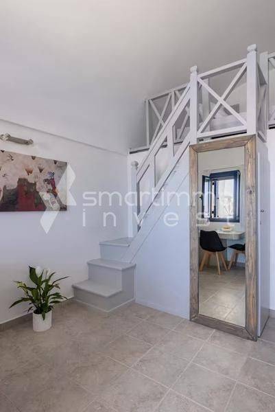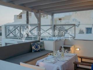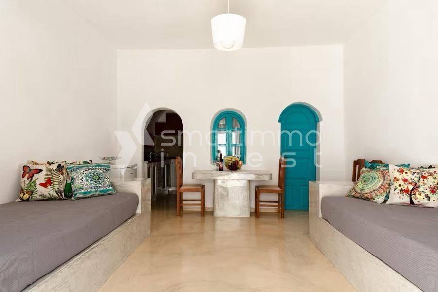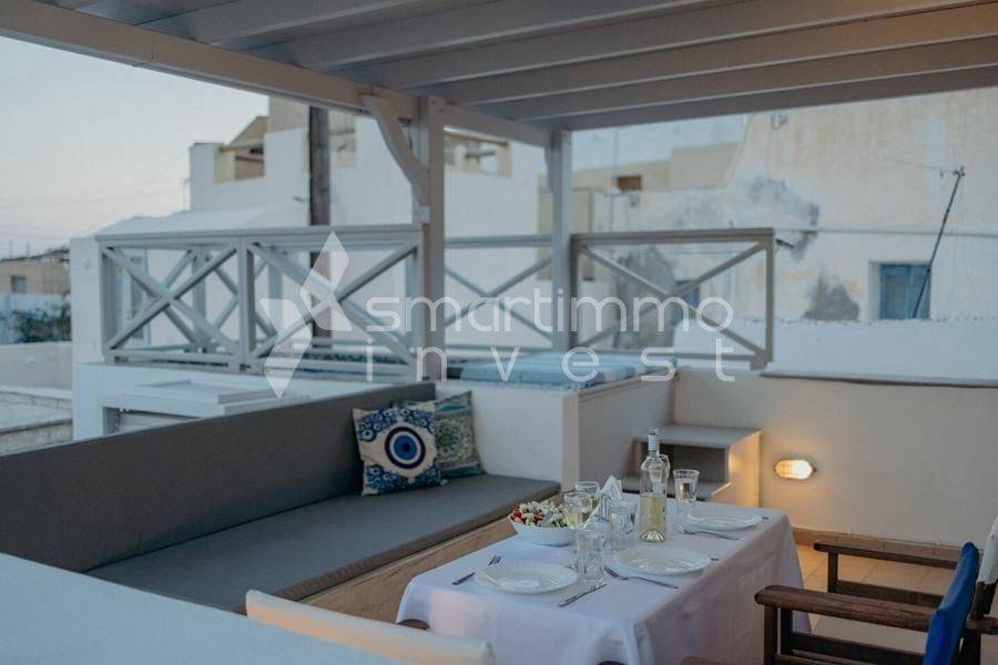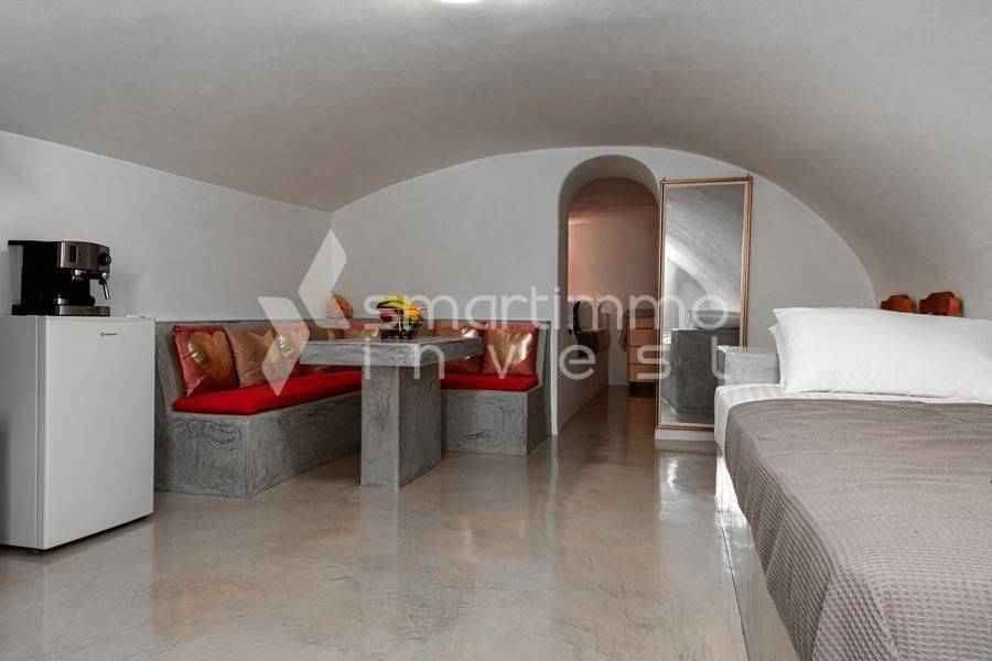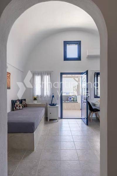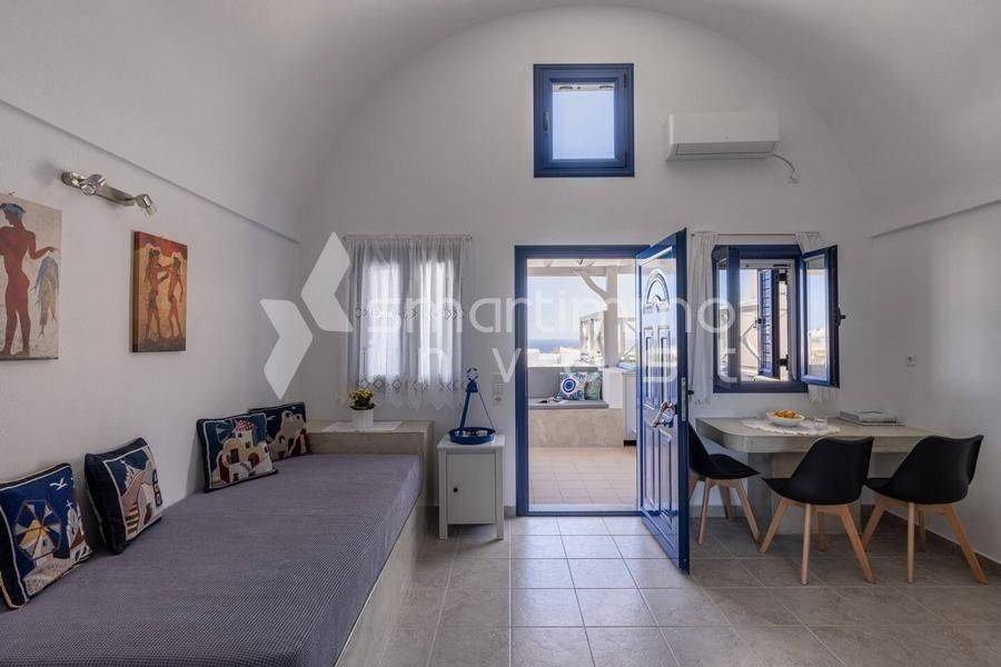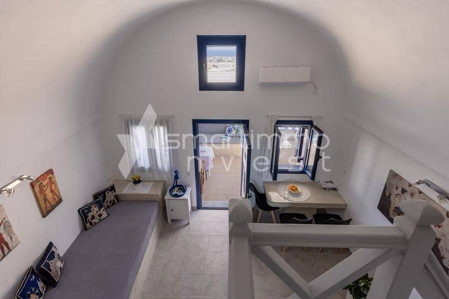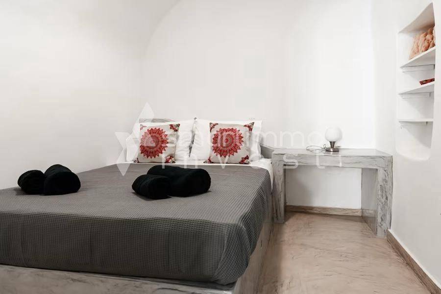 Located in the traditional village of Emporio in Santorini, at the lower part of the medieval Kastelli castle, this exceptional stone residence from the previous century is offered for sale, fully renovated in 2024 with absolute respect for Cycladic architecture and local heritage. This corner property enjoys a southeast orientation and extends over a total surface of 145 sq.m. across three independent levels, set on a 60 sq.m. plot, with accommodation capacity for up to ten guests. The property consists of three fully autonomous apartments, upper floor, ground floor and cave house, each featuring a private bedroom, kitchen and bathroom with shower, all constructed in traditional Cycladic polished cement technique. Built-in beds with storage spaces, full electrical appliances, washing machines, air conditioning or fans, smart TVs and Wi-Fi connectivity ensure comfort and functionality on every level. The upper floor, a striking traditional dome with a height of 4.7 meters, includes a mezzanine bedroom with sea view, a living area, kitchen, bathroom and access to a spacious 19 sq.m. terrace with pergola and a heated outdoor jacuzzi, offering uninterrupted views of the sea, Kastelli, Prophet Elias mountain and the traditional settlement. The ground floor apartment comfortably accommodates four guests and includes a bedroom, living area, kitchen, bathroom and a shaded courtyard, while the cave house apartment offers natural insulation, stable temperature year-round, a master bedroom, living area, kitchen, bathroom and dedicated ventilation system. Situated in one of the most vibrant and well-organized villages of Santorini, with immediate access to shops, services, public transport and free parking areas, this property represents an excellent investment opportunity or a high-quality private residence, combining authenticity, elegance and prime location.