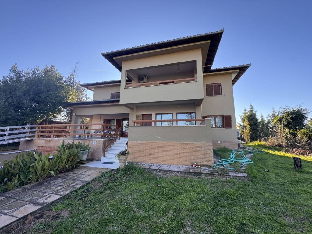 Villa Near Larissa This 350 sq.m., three-level villa was designed to create a warm and welcoming atmosphere with high standards of quality. It is situated on a 2.5-acre plot in Nikaia, Larissa. The property stands out for its functional layout, spacious and bright interiors, as well as its large terraces that offer views of the Thessalian plain, Mount Olympus, and Mount Kissavos, providing relaxation throughout all seasons of the year. A major advantage of the residence is its eastern orientation. Upon entering the luxury villa, one can enjoy the airy and spacious feeling of the interior, the large kitchen with a central island, the fireplace, and the relaxed lounge area. The villa is arranged over three levels. On the ground floor there is the kitchen, dining area, living room, office, bathroom, and one bedroom (guest room). The kitchen is fully equipped with all essential appliances and is ideal for families or friends who enjoy cooking together. The dining area is perfect for hosting large gatherings of friends and family. Also on the ground floor is the open-plan living room featuring a fireplace, LED satellite TV, and two large corner sofas made of leather and fabric. The house has German-made wooden window frames with double glazing and insulation. The first floor includes three large bedrooms, two auxiliary rooms (one of which can be used as a gym), and a bathroom. The master bedroom (king-size) features an en-suite bathroom with a shower and a private balcony overlooking the Thessalian plain, with views towards Mount Olympus and Mount Kissavos. The shared bathroom on this floor is spacious and includes a whirlpool bathtub. Each room is characterized by harmony, comfort, and a unique Mediterranean style. All bedrooms are bright, each with its own balcony, wooden flooring, and large built-in wooden wardrobes. Additional built-in wooden wardrobes are located in the hallways, offering maximum storage and organization. The floor is decorated with beautiful artworks, state-of-the-art electronic equipment, modern wooden furniture, and impressive lighting—all made from natural materials. The first floor is connected to the ground floor via a concrete staircase clad in wood with wooden railings. The basement features an independent and fully equipped 55 sq.m. guest apartment, including its own bathroom, a large kitchen, one bedroom, and a very spacious living room with bathroom. It also has autonomous heating. The remaining basement area includes a pantry, boiler room, and a parking space. The outdoor area of the property is exceptionally well maintained and landscaped with trees, olive trees for family olive oil production, lawn, ornamental plants, and a designated planting area. The exterior also includes three covered parking spaces. The villa has pre-installed infrastructure for an 80 sq.m. swimming pool. There is also an external storage room for property needs (lawn tractor, tools, etc.). Heating is provided by an oil boiler, and there is already an installation for natural gas. The house was built with internal thermal insulation, ensuring warmth in winter and coolness in summer. Its unique location, impressive views, and the high quality of materials and construction are the main features of this residence, making it an excellent investment opportunity. Nikaia, Larissa is located close to the city of Larissa, just 9 kilometers from the city center, and is well connected by public transportation.