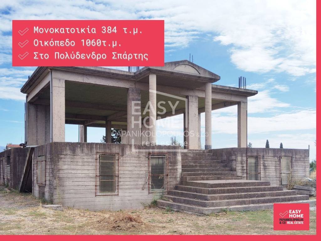 Detached House 384 sq.m. in Polydendro, Sparta This is an unfinished detached house located on a 1,060 sq.m. plot. The spaces are undeveloped on all levels, allowing for free customization according to your own taste and needs. More specifically, the semi-basement is 244 sq.m., which allows for integration with the upper floor to create a stunning maisonette and/or the creation of one or more independent apartments. The elevated ground floor is an additional 140 sq.m. and is designed to include a spacious living room, dining room, kitchen, 3 bedrooms, 2 bathrooms, and 3 large terraces. There is also the possibility for additional construction. AREA Polydendro, Sparta, is a small, quiet settlement just 2 km from Sparta, ideal for those seeking peace and connection with nature while having easy access to the city, making it suitable for purchasing a home or a vacation residence. It is close to significant archaeological sites, such as the Sanctuary of Orthia Artemis and the ruins of ancient Sparta, offering the opportunity for cultural visits in a historical environment. For more information, please contact us. EASYHOME - Papanikolopoulos & Co Real estate agency Tel. +30 27210 22122 / +30 210 220 2962 E-mail: hello@easyhome.com.gr In order to find more properties, visit our website www.easyhome.com.gr At EASYHOME Real Estate, we are a real estate agency that provides comprehensive property management services. With a strong team of real estate consultants, engineers, architects, lawyers, and notaries, we inform, advise, and handle every matter concerning your unique property or help you acquire your own. We operate in Messinia, Attica, and selected locations across Greece. - The information of the listed properties has been taken from documents given to us or by declaration of the owners and our company bears no responsibility for any wrong information. - In order to indicate the property, documents and certificates, it is necessary to indicate the police ID and the A.F.M. according to Law 4072/11-4-2012 Official Gazette 86 A. - The location of the property shown on the map is for reference only. - Republishing, copying, reproducing, or sharing the advertisements and photos is strictly prohibited without the written consent of EASYHOME Real Estate.