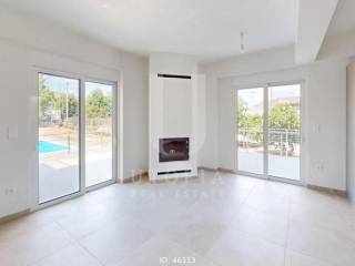Marathonas - Apartment 100sqm plot 600sqm, unfurnished, bedrooms 3, master bedroom, levels 3, ground floor - 1st - attic, excellent condition, year built 2025, energy class A+, living room, hall, kitchen, 2 bathrooms, wc, heating type: autonomous (natural gas), air condition, parking open space, quiet, dual aspect apartment, luminous, unobstructed view view, frontage, storage space, solar heater, fireplace, balconies, large balconies, elevator, aluminum frames, double glazed windows, door screen, ceramic tiles floors, separate kitchen, secure door, swimming pool, private pool, residential zone, access from asphalt, close to market (up to 1000m).
