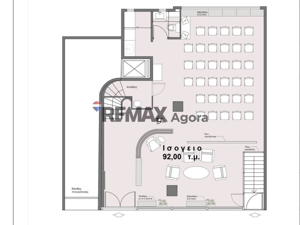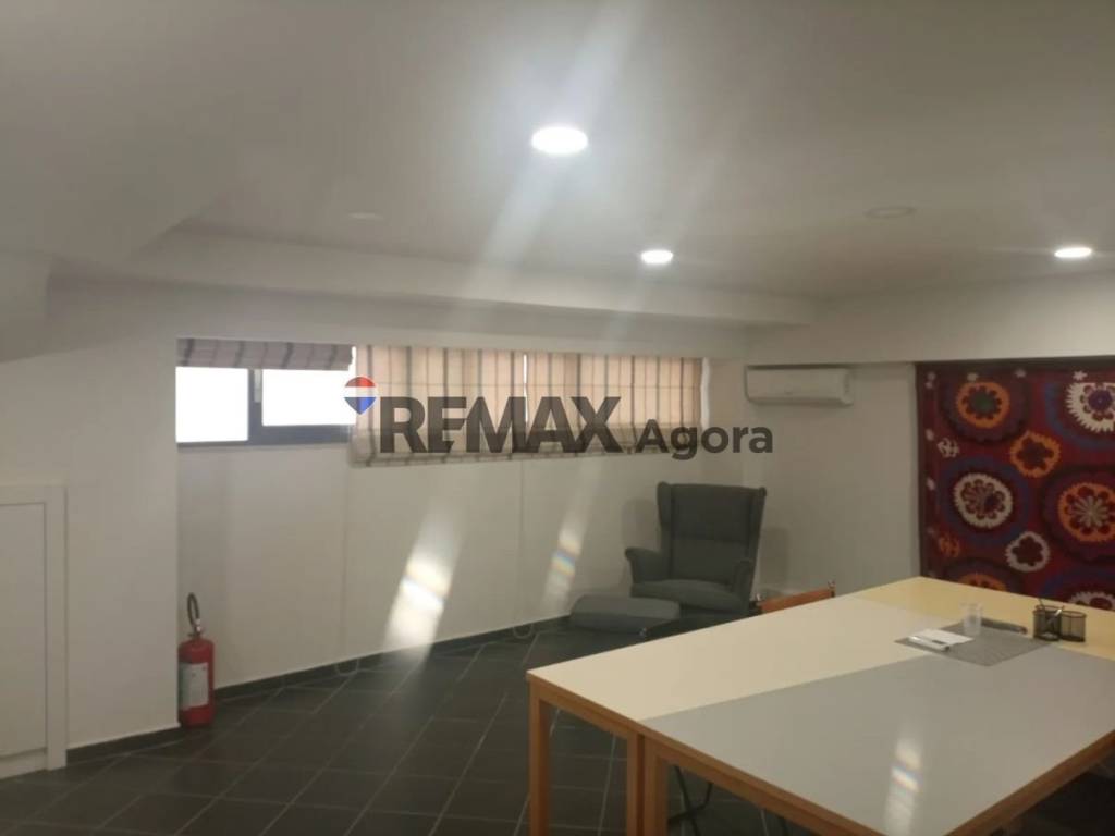 Ισογειο 92τ.μ. διαθετει W.C. και μικρο κουζινακι. Ο χωρος φερει ψευδοροφες από ορ. Ινες 600/600 χιλ, με φωτιστικα φθορισμου και εχει υψος 2,70 μ.