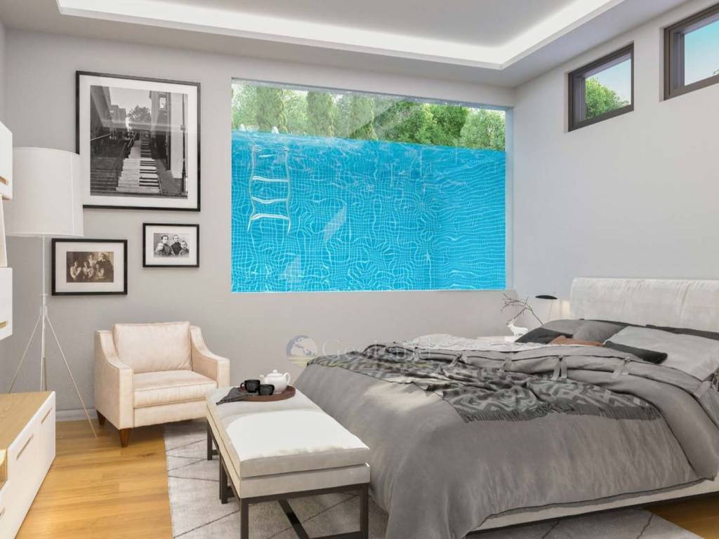 The tour of the residence begins on the lower level (raised basement), which has been designed exclusively as a relaxation area for the family. Here we find two spacious bedrooms, each with its own en-suite bathroom, designed to offer complete tranquility. A key advantage of this floor is the unique view that the bedrooms offer towards the pool level and the natural environment of the garden, creating a sense of relaxation.
