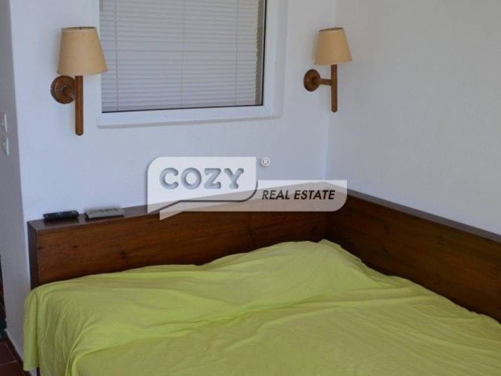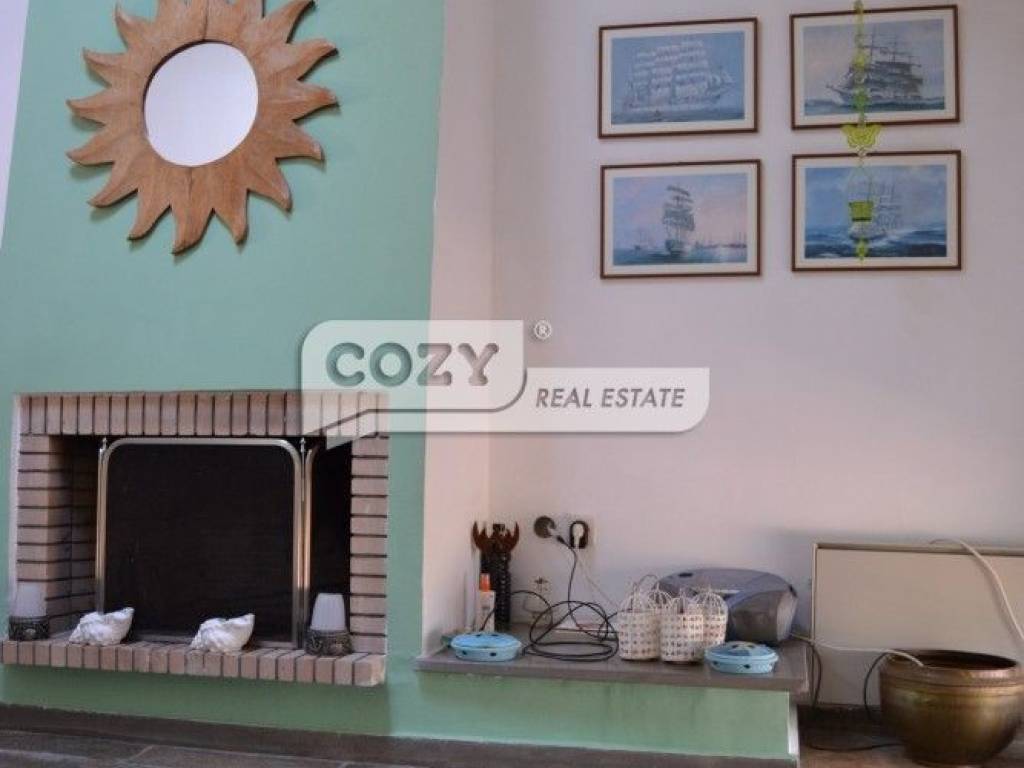 It consists of three bedrooms, a spacious living room with fireplace, a functional kitchen, and two bathrooms. It is equipped with air conditioning, storage heaters, stone flooring, aluminum window frames, a security door, reinforced frames with metal constructions for enhanced security, and an outdoor parking space. The complex also offers a shared swimming pool.