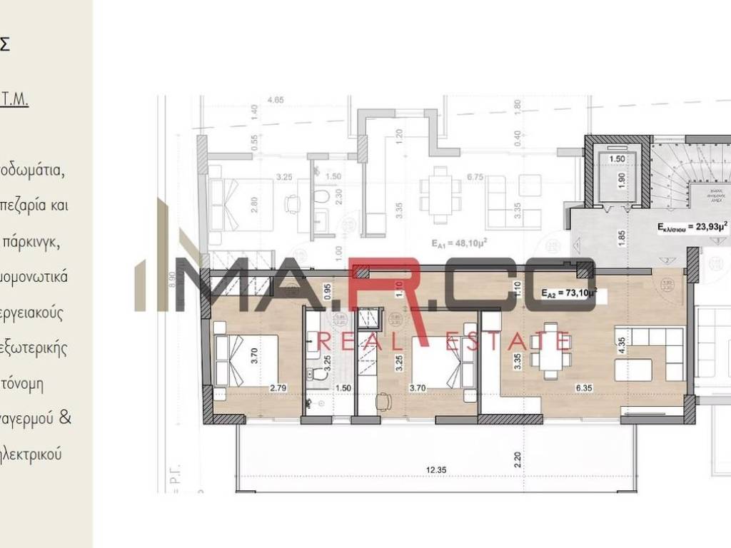 Apartment For sale, floor: 1st, in Peristeri - Agios Antonios. The Apartment is 73 sq.m.. It consists of: 2 bedrooms, 1 bathrooms and it also has 1 parkings (1 Pilotis space). The property was built in 2025. Its heating is Personal with Heat pump, it has Alluminum, Thermal brake frames with Double glazed - Energy Efficient windows, the energy certificate is: A+ and its floors are Tiles, Wooden. The property's status is: Under construction, it is close to Metro, School, Super Market, City Center, 600 Meters from metro and it has NorthEast orientation, Storage, Security door, No shared expences, Night stream, Three phase current, Electric shutters, Car charger. Price: €215.000. MA.R.CO REALESTATE & CONSTRUCTION, contact phone: 6944855335, 2109650870, email: info@marco-realestate.gr, website: