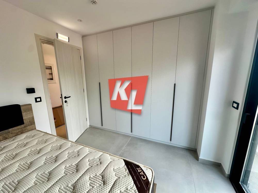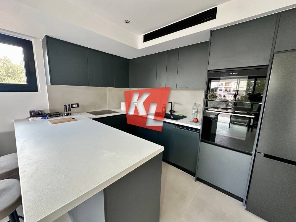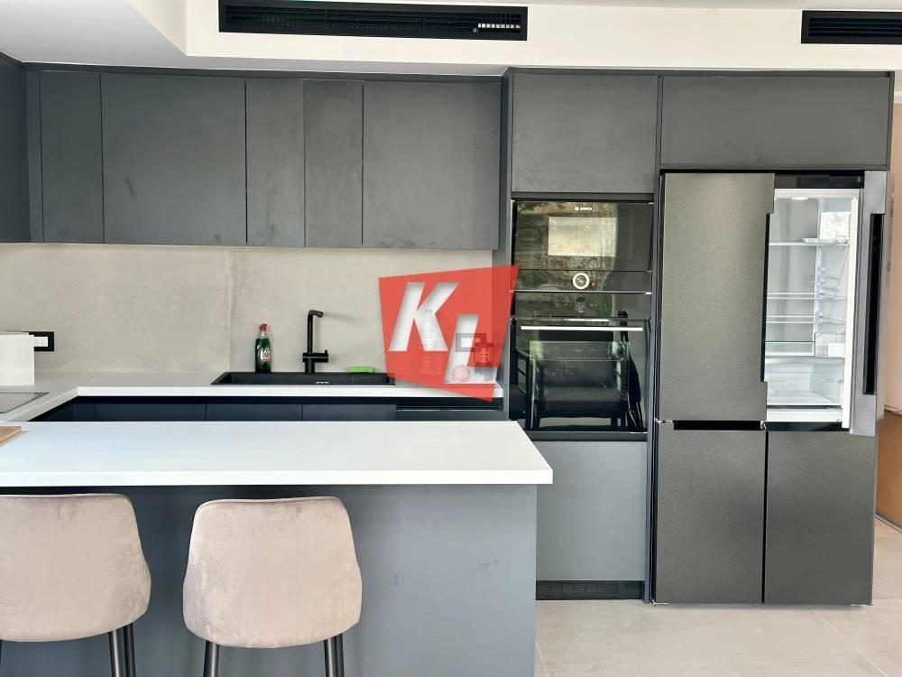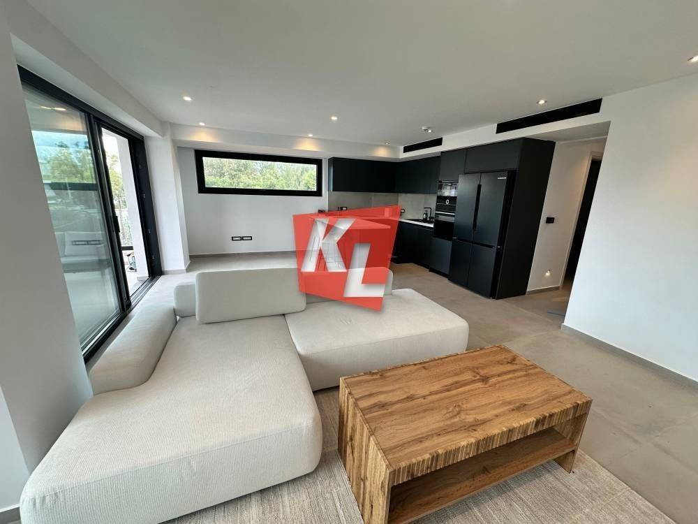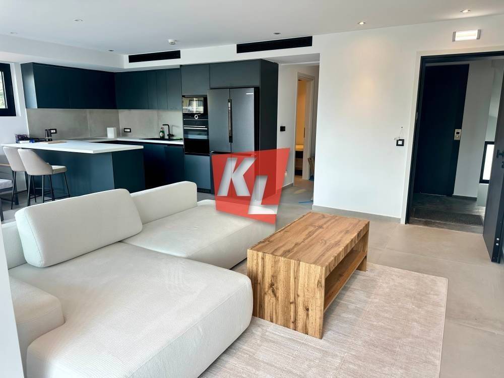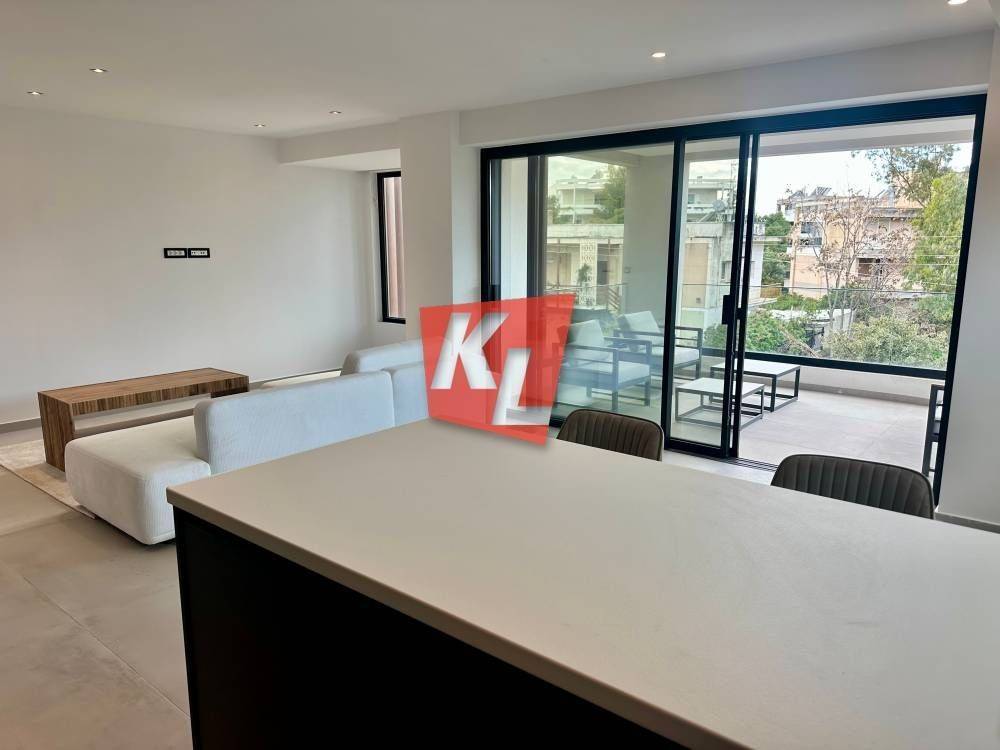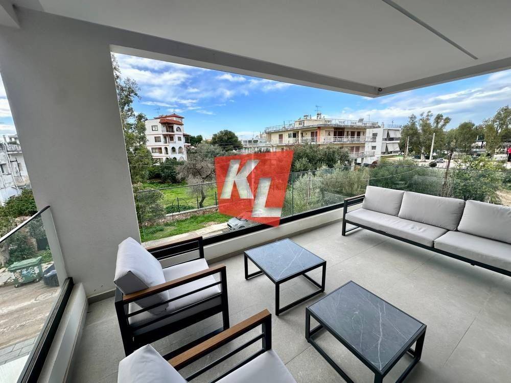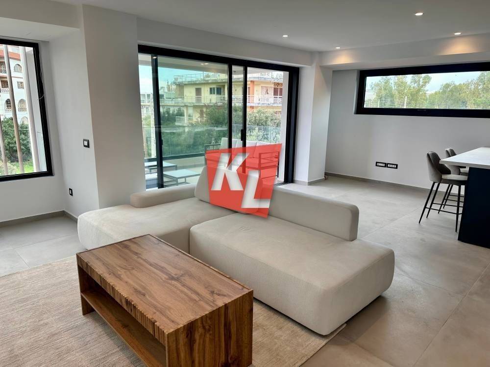Voula, near the Asklipieio Hospital: For rent is a bright, corner, luxurious 1st-floor apartment of 89 sq.m., fully furnished, with wrap-around terraces, 2 bedrooms including 1 ensuite, 2 bathrooms, and an open-plan kitchen integrated with the living room.