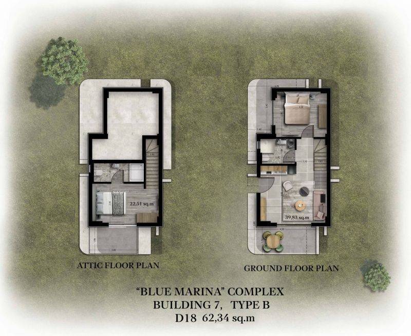 • 5 Two-story Maisonettes with an attic of 62.34 sq.m., consisting of a living room-kitchen, two bedrooms, and two bathrooms.