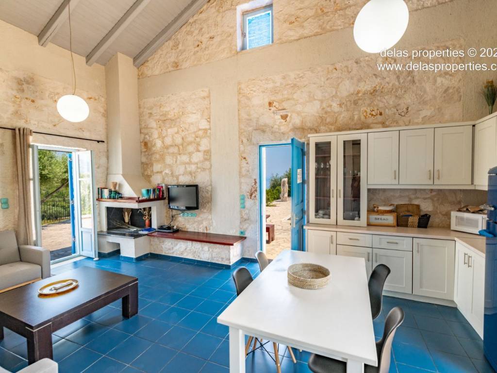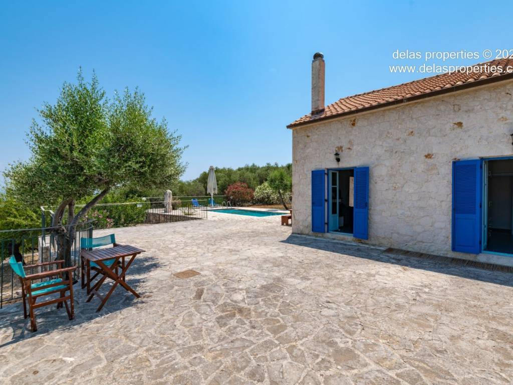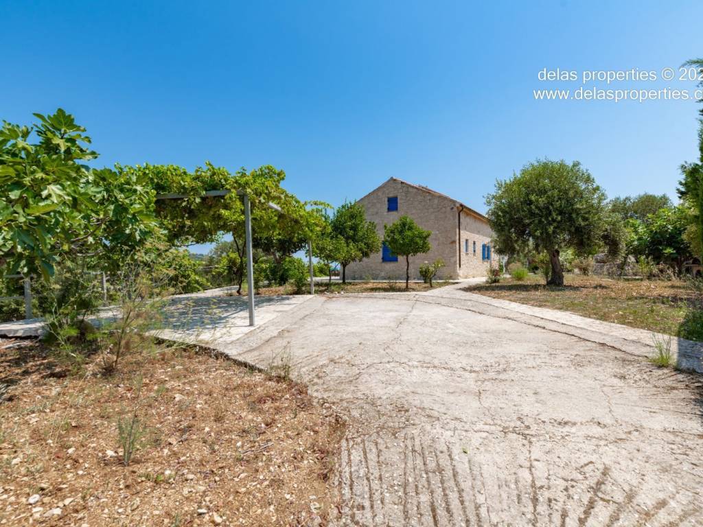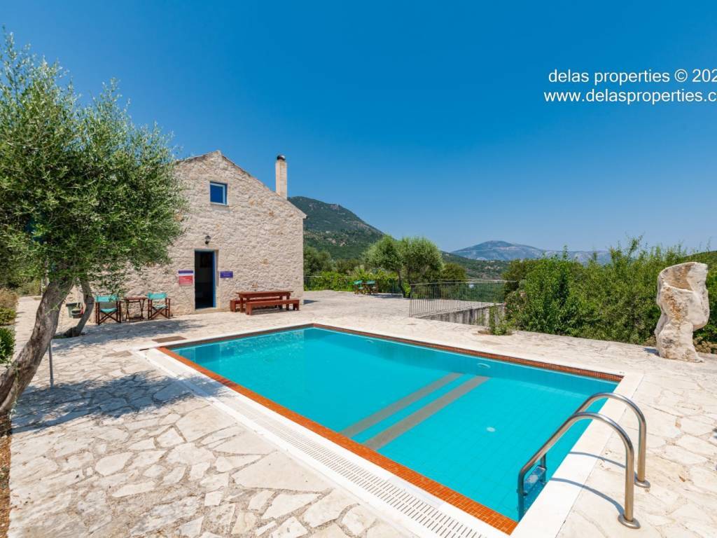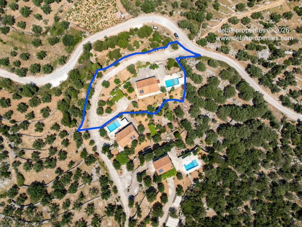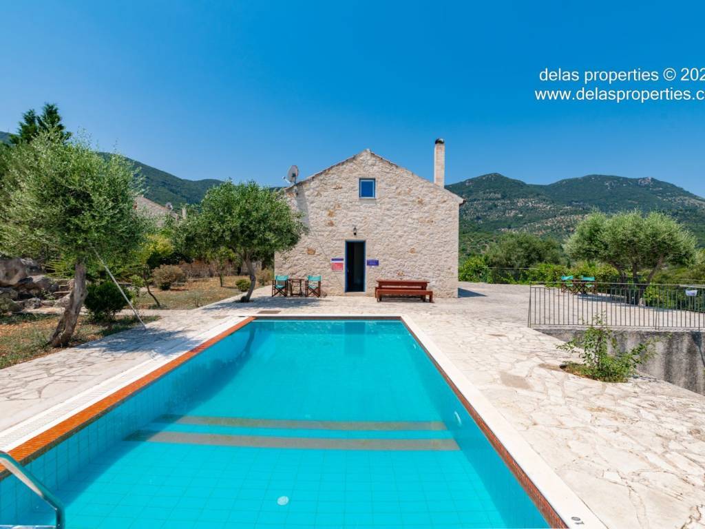 Set in the peaceful hillside area of Anavrytikes, south of Vathy, this stone-built villa offers a rare combination of privacy, open views, natural surroundings and easy access to the sea. Surrounded by olive trees and positioned on its own independent section of land, it feels calm, discreet and genuinely connected to the Ithacan landscape. The villa stands on a private vertical ownership of 2,045.09 sq.m. and includes a 76.63 sq.m. main residence, a 29.80 sq.m. private swimming pool, 38.13 sq.m. storage space, a 29.31 sq.m. water tank, and a 34.38 sq.m. pergola. It is located approximately 1.5 km from Kaminia Beach and only 3.2 km from the centre and port of Vathy, making it highly practical without losing its sense of seclusion. Externally, the property opens beautifully to the landscape. The large stone-paved terrace extends naturally from the house to the pool area, creating a generous outdoor living environment with light, openness and privacy. Olive trees, low stone walls, gentle landscaping and a subtle sea reference give the property a setting that feels authentic rather than staged. There is also a BBQ area and private parking shaded by a natural planted pergola, making everyday use both comfortable and elegant. Inside, the villa has a bright and relaxed atmosphere. The main living area combines sitting room, dining space and kitchen under a high timber roof, with exposed stone walls, a fireplace and direct access to the terrace. The overall feel is fresh, simple and quietly refined, with a distinctly Mediterranean character. The house offers 2 bedrooms and 2 bathrooms, making it ideal as a private holiday home, an easy-to-manage second residence, or a high-quality property for seasonal use. It is the kind of home that appeals to buyers who value peace, beauty, practicality and the long-term strength of owning a well-positioned villa on Ithaca. This is not an oversized or ostentatious property. Its value lies elsewhere: in its proportions, its setting, its privacy, and the ease with which it can be enjoyed from the first day. For buyers looking for a stone villa near the sea, with its own pool, its own outdoor life, and a strong sense of place, this is a compelling opportunity. For more information or a viewing: Stavros Dellaportas – +30 6977683147 (WhatsApp & Viber) delas@otenet.gr www.delasproperties.com