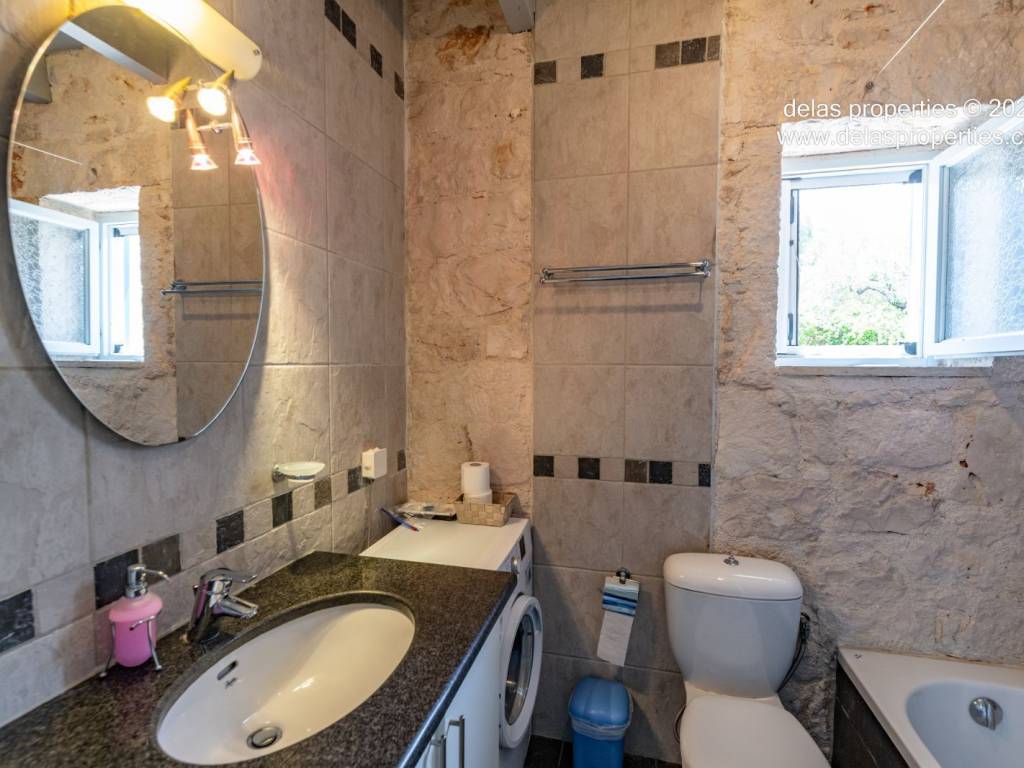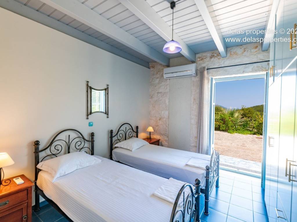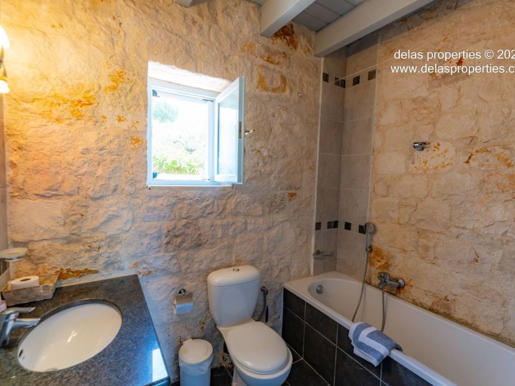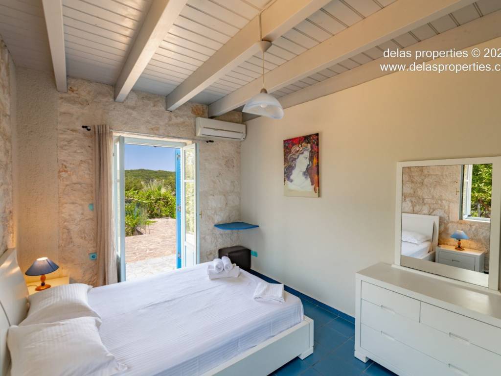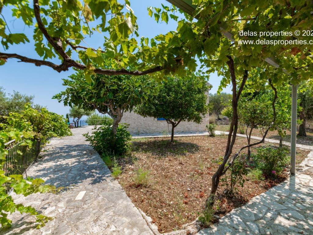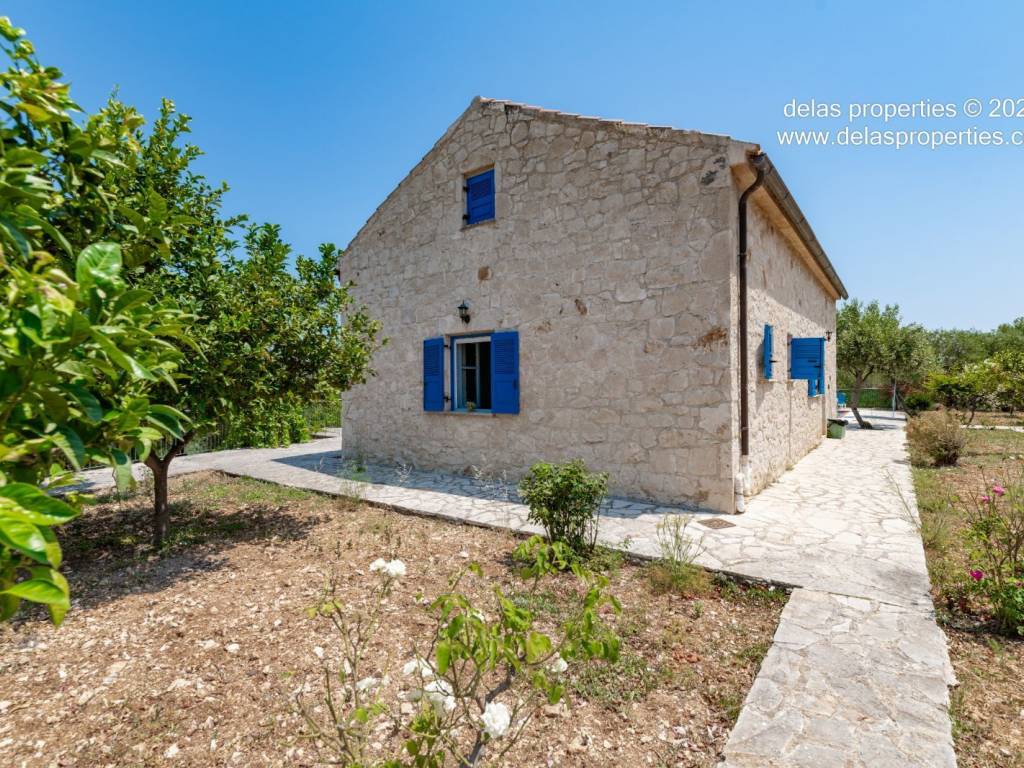 Set in the peaceful hillside area of Anavrytikes, south of Vathy, this stone-built villa offers a rare combination of privacy, open views, natural surroundings and easy access to the sea. Surrounded by olive trees and positioned on its own independent section of land, it feels calm, discreet and genuinely connected to the Ithacan landscape. The villa stands on a private vertical ownership of 2,045.09 sq.m. and includes a 76.63 sq.m. main residence, a 29.80 sq.m. private swimming pool, 38.13 sq.m. storage space, a 29.31 sq.m. water tank, and a 34.38 sq.m. pergola. It is located approximately 1.5 km from Kaminia Beach and only 3.2 km from the centre and port of Vathy, making it highly practical without losing its sense of seclusion. Externally, the property opens beautifully to the landscape. The large stone-paved terrace extends naturally from the house to the pool area, creating a generous outdoor living environment with light, openness and privacy. Olive trees, low stone walls, gentle landscaping and a subtle sea reference give the property a setting that feels authentic rather than staged. There is also a BBQ area and private parking shaded by a natural planted pergola, making everyday use both comfortable and elegant. Inside, the villa has a bright and relaxed atmosphere. The main living area combines sitting room, dining space and kitchen under a high timber roof, with exposed stone walls, a fireplace and direct access to the terrace. The overall feel is fresh, simple and quietly refined, with a distinctly Mediterranean character. The house offers 2 bedrooms and 2 bathrooms, making it ideal as a private holiday home, an easy-to-manage second residence, or a high-quality property for seasonal use. It is the kind of home that appeals to buyers who value peace, beauty, practicality and the long-term strength of owning a well-positioned villa on Ithaca. This is not an oversized or ostentatious property. Its value lies elsewhere: in its proportions, its setting, its privacy, and the ease with which it can be enjoyed from the first day. For buyers looking for a stone villa near the sea, with its own pool, its own outdoor life, and a strong sense of place, this is a compelling opportunity. For more information or a viewing: Stavros Dellaportas – +30 6977683147 (WhatsApp & Viber) delas@otenet.gr www.delasproperties.com