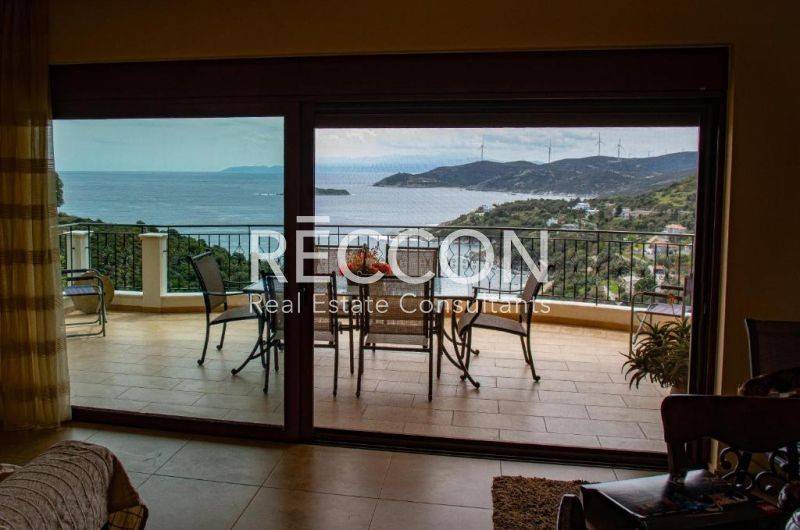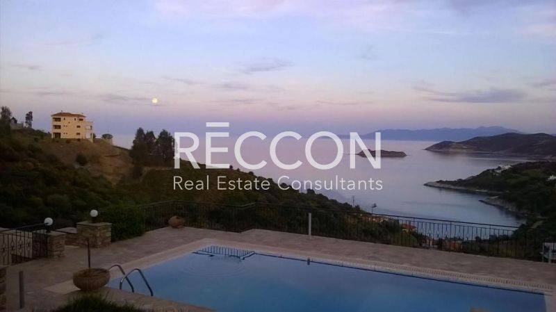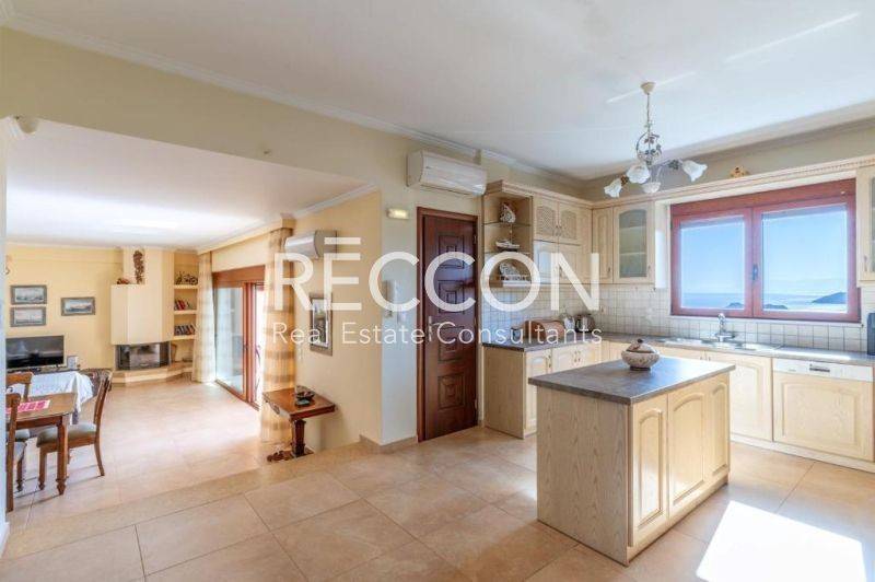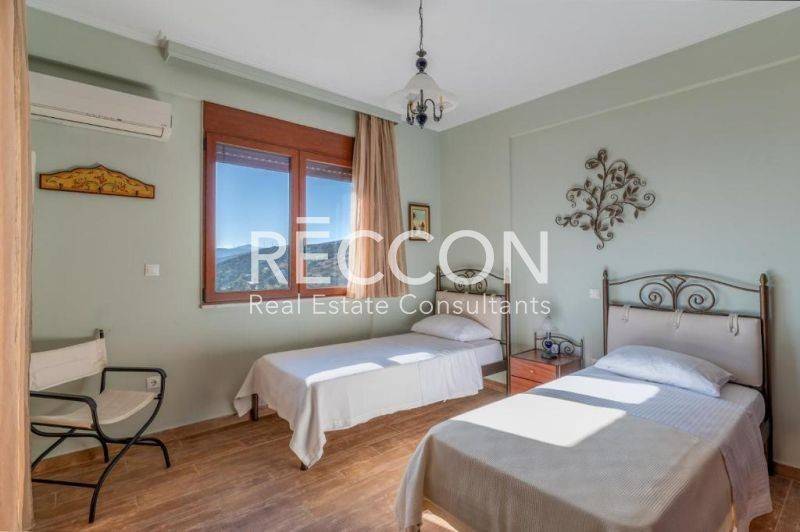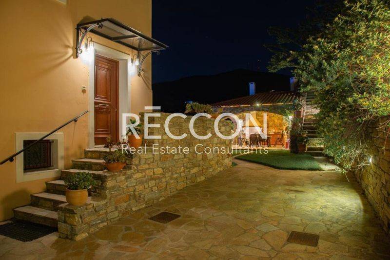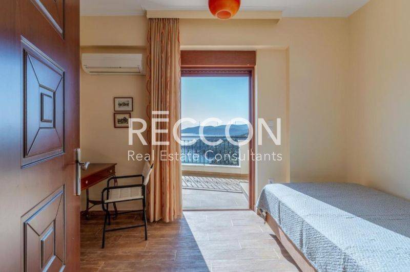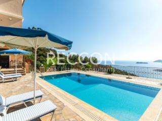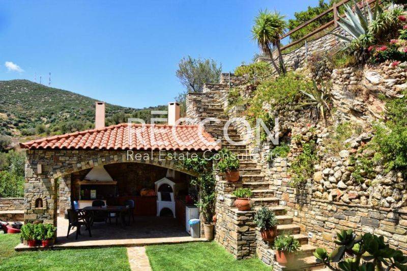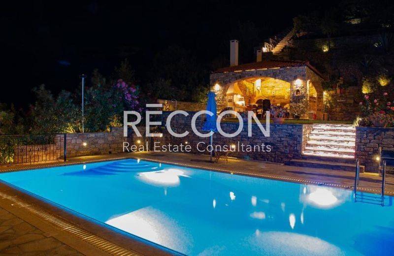 Property Code: 3597 - Dystos Klimaki FOR SALE Amazing furnished luxurious detached house on 5 levels with a total area of 445.00 sq.m. on a plot of 4100 sq.m. With unlimited sea and mountain views. Built with excellent aesthetics, it consists of 2 maisonettes, the lower one has 2 levels and has 3 bedrooms, 1 living room, 1 kitchen, 4 bathrooms and 1 WC. The upper one has 2 levels plus the attic and has 3 bedrooms, 1 living room, 1 kitchen, 2 bathrooms, 1 WC and laundry room. With a beautifully landscaped garden that has an infinity pool of 40 sq.m. and a stone covered barbecue. It was built in 2010 and has individual heating - electric, aluminum frames, tiled floors, security door, built-in wardrobes, parking for 10 cars, 40 sq m storage rooms, fireplace, A/C, heating per level, alarm, electrical appliances, awnings, screens, double glazing, solar water heater, entrance stairs, tiled roof, satellite antenna, internal staircase. There is a radiator installation and a well to install an elevator. Distance from the sea 500 meters, distance from the village 1500 meters. - Price: €1,050,000