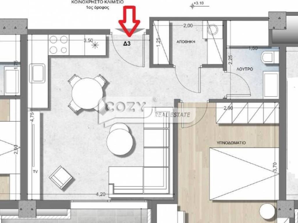 Thessaloniki, Thermi: In a complex of 2 independent buildings, For sale is a front-facing apartment of 50.85 sq m. on the 1nd floor. It consists of a living room with kitchen, bedroom, a bathroom and an internal storage room. Underfloor heating with individual natural gas. Energy class A+. It has a parking space and a storage room of 2.55 sq m in the attic.