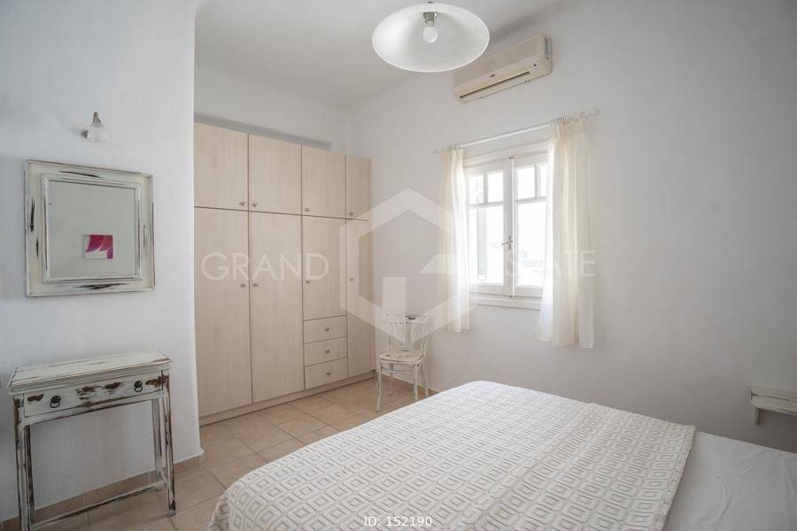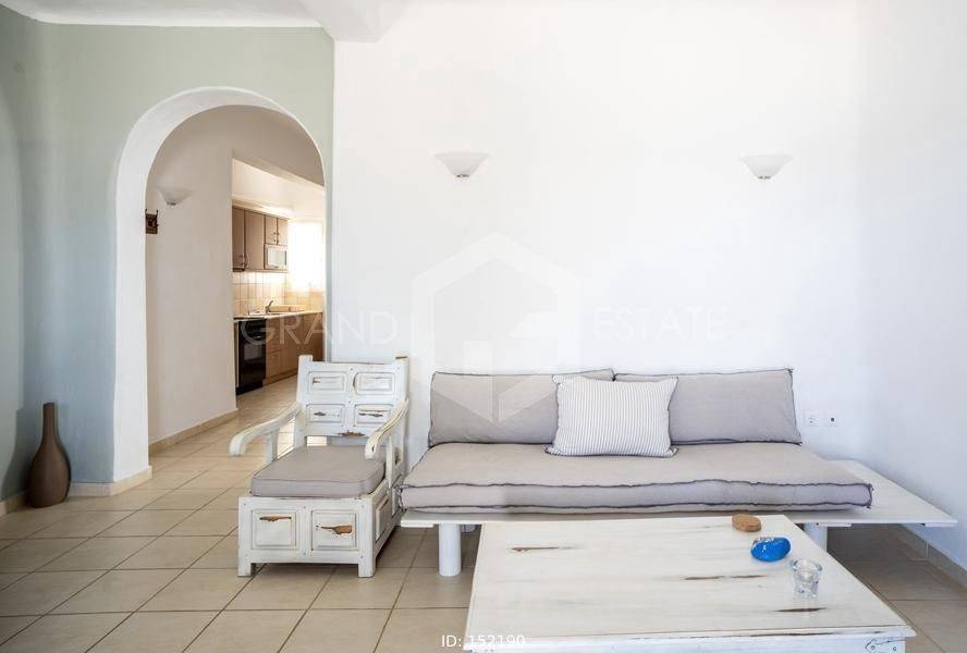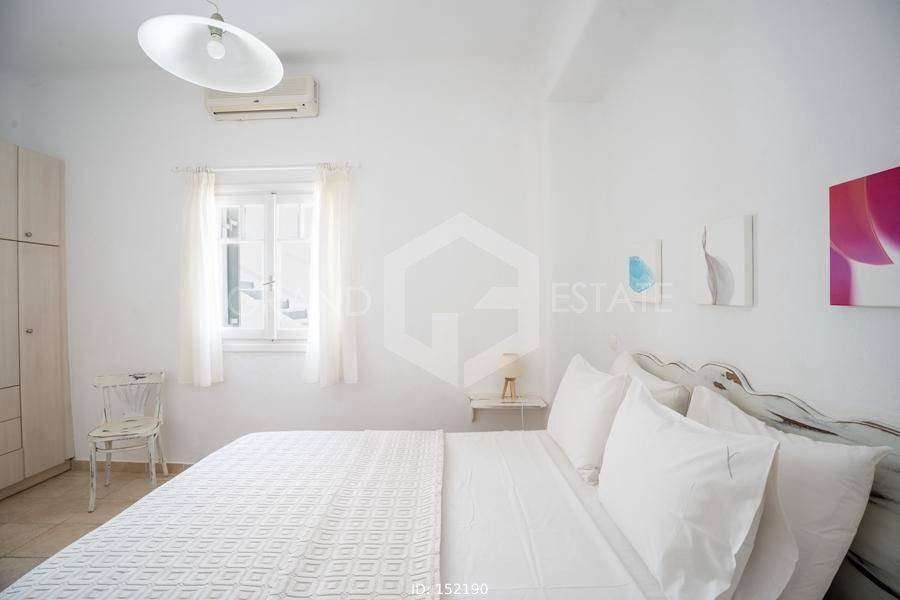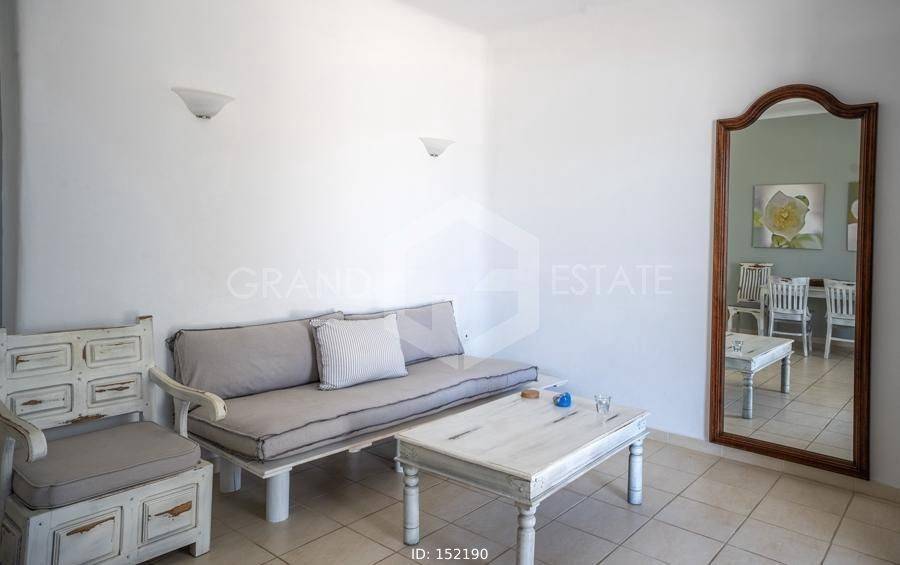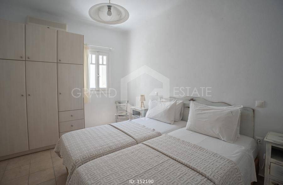 Mykonos, Panormos - Apartment 72sqm, plot 4050sqm, fully furnished, 2 bedrooms, ground floor, excellent condition, year built 2006, energy class D, living room, kitchen, bathroom, heating type: autonomous (electricity), air condition, a/c type vrv, quiet, luminous, sea view, frontage, painted, boiler, balconies, large balconies, tents, garden, built in appliances, wooden frames, double glazed windows, door screen, ceramic tiles floors, parking, surveillance cameras, luxurious, swimming pool, barbeque, satellite, internet, residential zone, access from asphalt, investment property. Wonderful apartment 78m2 in a complex of 12 residences, with a large mature shared garden with a chapel, a large usable swimming pool, shared bbq, outdoor bathrooms & showers. The apartment has a large terrace with a view of the pool and the sea, an open-plan living room, dining area and kitchen, 2 bedrooms and one bathroom with bathtub . It has air conditioning, a boiler for hot water, is fully furnished and equipped with electrical appliances (flat screen TV, iron, kitchenette, small fridge, hairdryer, coffee maker. It is located in the beautiful bay of Panormos, in the northeastern part of the island, just 10 minutes by car (or motorbike) from Mykonos town or the airport and 15 minutes from the famous beaches of Elia and Super Paradise. Panormos beach, just a 10 minute walk away, named after the bay, is one of the few beaches on the island that remains truly unspoilt. It has a nice long strip of white sand with crystal blue waters and enjoys a little more protection from the winds. The property is tidy, ready for installation or exploitation. Ideal for a holiday home and high yield investment. Viewings will be realised after the 20th of March.