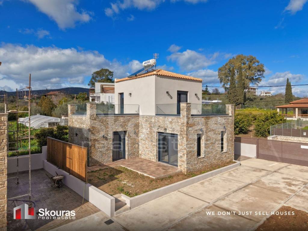 In a beautiful newly built residential complex currently under construction, an exceptional two-level detached house is offered for sale. The property combines contemporary architecture with traditional elements, offering comfort and elegance. The ground floor, which occupies the largest area of the residence, features a spacious and bright living room, ideal for relaxation and entertaining, a fully functional kitchen, an airy bedroom filled with natural light, and a stylish bathroom. Ascending to the upper floor, we find a large bedroom that offers additional privacy, accompanied by its own bathroom, creating a perfect space for tranquility and seclusion. The architecture harmoniously integrates the outdoor environment through a balanced combination of stone-built elements and plaster finishes, resulting in a natural and environmentally friendly aesthetic. Beyond its design, the residence stands out for its energy-efficient features, as it is classified as Energy Class A. It is equipped with state-of-the-art aluminum frames for maximum energy performance, while a heat pump system with fan coil units ensures comfort and efficiency in both heating and cooling. The outdoor courtyard area is minimally landscaped, offering the possibility of constructing a swimming pool for those who wish to add an extra touch of luxury. The location of the complex is highly privileged, with easy and direct access, while the beautiful beaches of the area are only 7 minutes away, making the property ideal both for permanent residence and holiday use. Skouras Real Estate #1 Greek Real Estate Agency in the Peloponnese 4 Offices: Nafplio | Kalamata | Corinth | Porto Heli 3000+ Properties | 18+ Years of Experience | Support in 5 Languages Marketing & Website – European Property Awards 2020 Marketing Techniques & Development – EPPA 2022 & 2024 Call Center: +30 27520-29529 Mobile: +30 6974144346 Email: zax@skourasrealestate.gr Property Manager: Zacharakis Dimitrios Over 3,000 properties available at: www.skourasrealestate.gr Note: The property information is based on data provided by the owners. Skouras Real Estate bears no responsibility for any inaccuracies. ID card or passport required for property visits. Map locations are approximate.