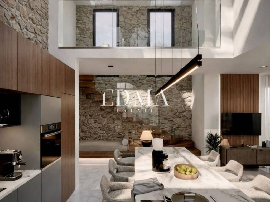 Indoors, high ceilings and large window openings enhance the sense of volume, while stone elements continue into the interior, adding warmth and texture to the modern design.