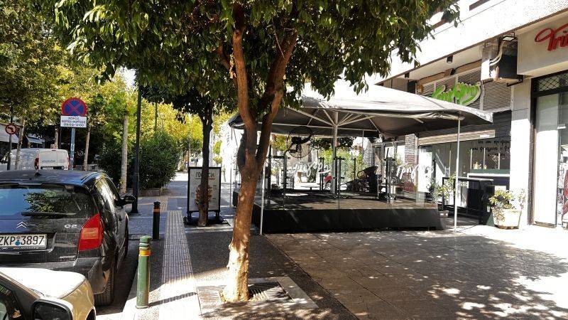 Υπάρχει δυνατότητα χρήσης πεζοδρομίου για τραπεζοκαθίσματα κατόπιν αδειοδότησης από το Δήμο. Μπορεί να φιλοξενήσει στον εξωτερικό χώρο, εφόσον διαμορφωθεί, γύρω στα 25 άτομα, καθήμενους και όρθιους σε ψηλό πάσο.