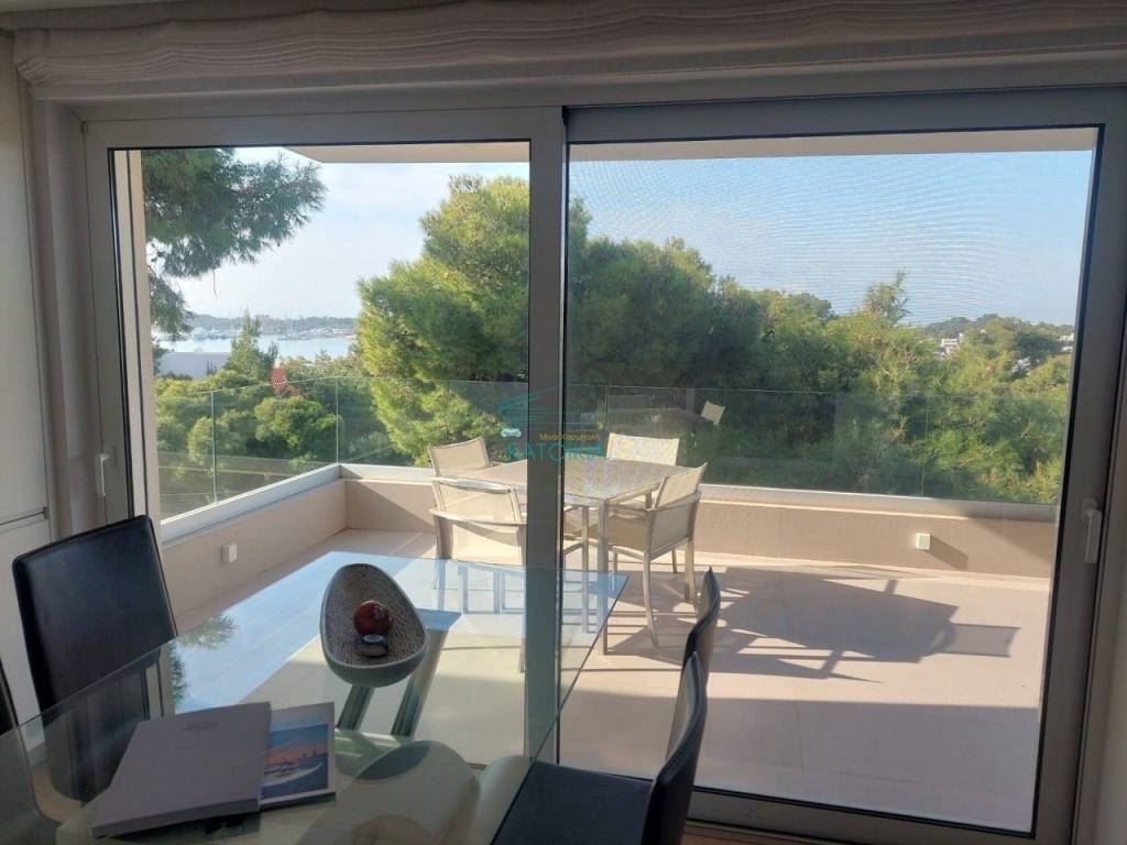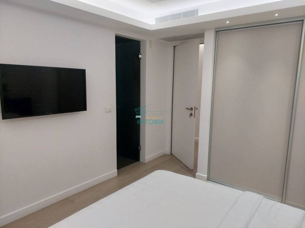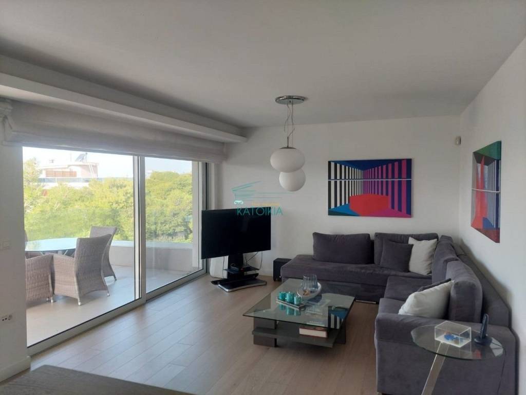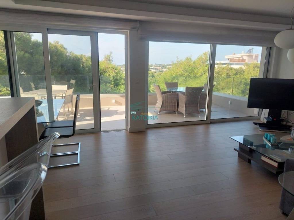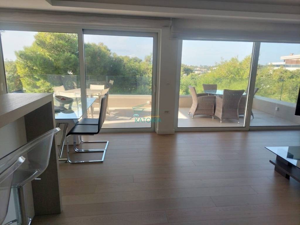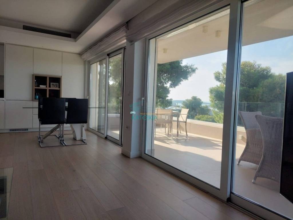 Vouliagmeni center luxurious apartment 98 sq meters uper 2nd floor, very bright, fully renovated 2022, overlooking greenery and partly sea view. Offers living room with open plan kitchen, electrical appliances, beautiful balcony at the frontage, 2 master bedrooms, 2 bathrooms, 1 wc, laundry, autonomous heating and cooling system, solar panel, aluminum frames, double glazing, net, electrical shutters, security alarm system and door. Immediately available, code 58440