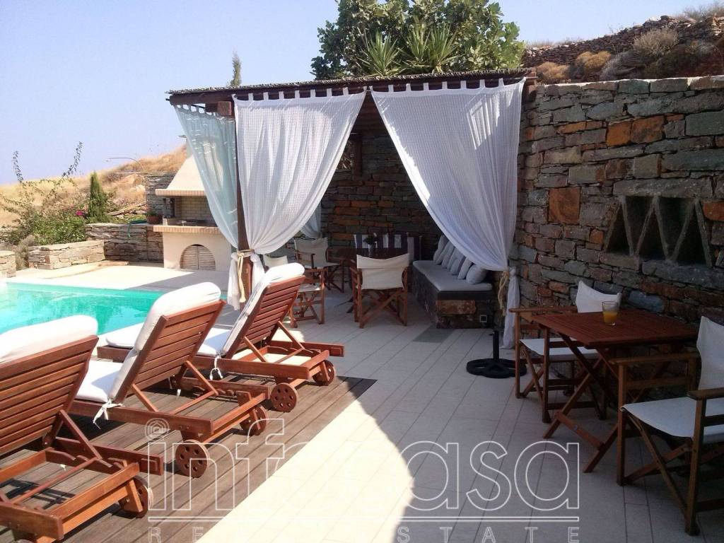 Villa 145 sq.m., on a plot of 1400 sq.m., fully furnished with pool and views of the port of Tzia and the endless blue. Located in Fotimari and consists of 3 levels: bright basement with 2 bedrooms, bathroom and large wardrobes, ground floor with spacious living room with fireplace, kitchen and w / c and 1st floor with large bedroom, bathroom and large wardrobe. It has wooden floors and frames, air conditioners, alarm system, solar water heater, autonomous heating, boiler, fully independent water supply and sewerage system, large terraces with views, internal staircase, storage 15 sq.m., 3 parking spaces with pilot bar, beautiful and pool 40 sq.m. with stunning sea views. On the same plot there is an independent guest house with bathroom. Tel: +30 210 7255 653, email: info2@infocasa.gr