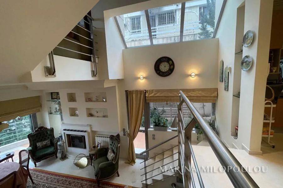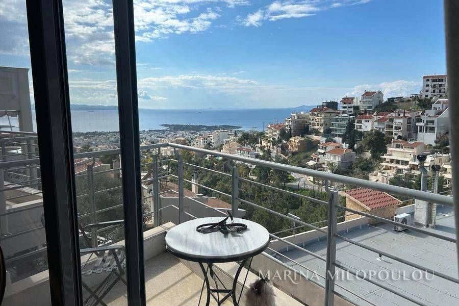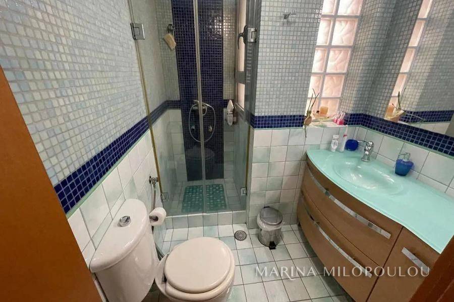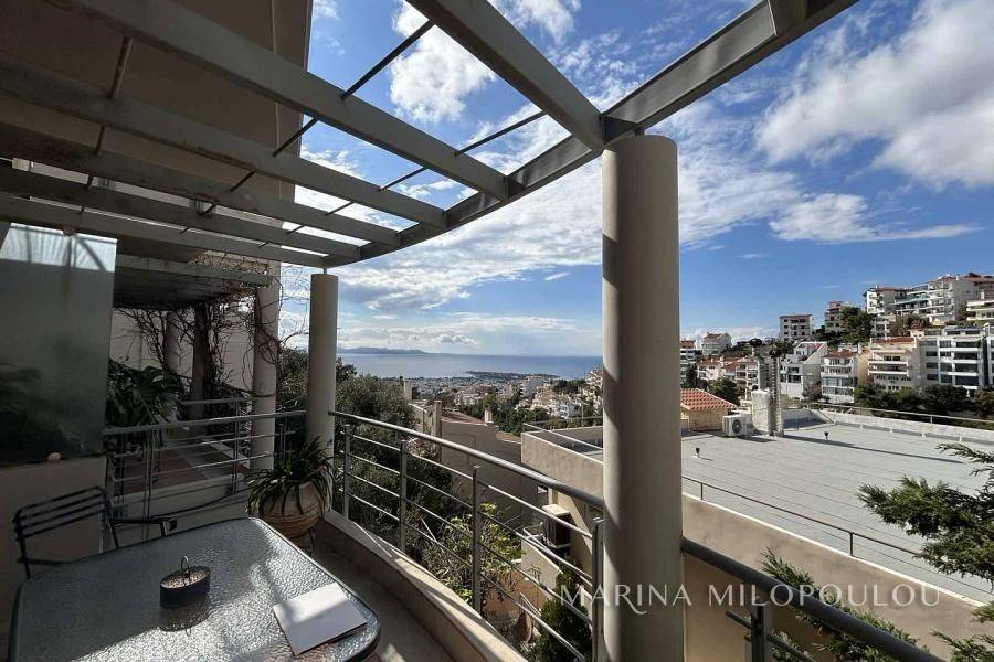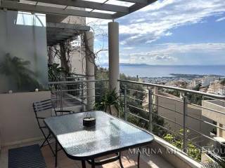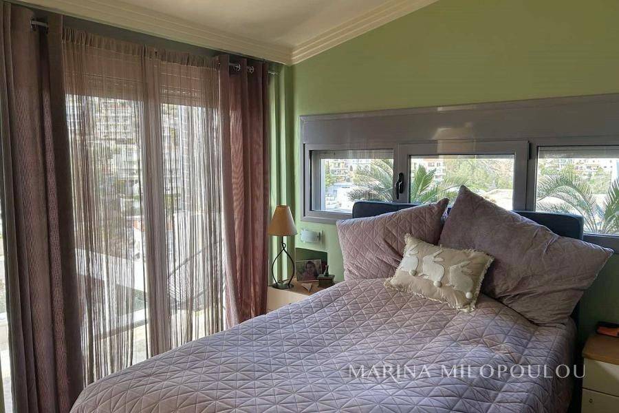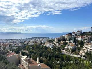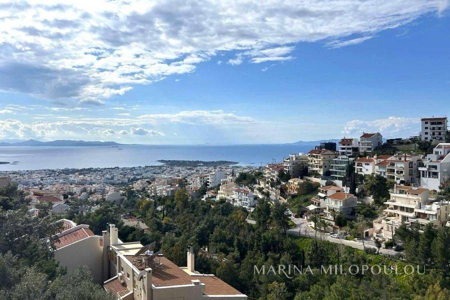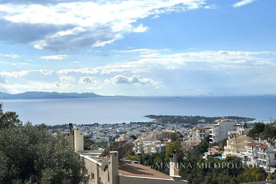 VOULA-Panorama, 5-level maisonette, with elevator, total area 225sqm, with unlimited sea view, northwest orientation. -Ground floor reception-living room in an uneven layout. -1st level downstairs, open kitchen fully equipped and exit to garden with BBQ. Going down a few steps is the 2nd living-dining room. -2nd floor below, office, 1 bathroom and laundry room and a 7 sq.m. warehouse. Going down a few steps you will find the play room, 1 toilet and an exit to the garden. -1st level up 2 bedrooms and 1 bathroom. -2nd level up 1 master bedroom with walk-in closet. It has balconies with sea view on all levels, security door, independent oil heating, fireplace, 2 A/Cs, boiler, double glazing with screens, electric shutters, oak floors in all main areas, marble staircase, alarm, open parking space. In a quiet street in Panorama, 700m from the square of Agios Nektarios with a mini market and cafe, 3 km from the center of Voula, 4 km from the second beach of Voula.