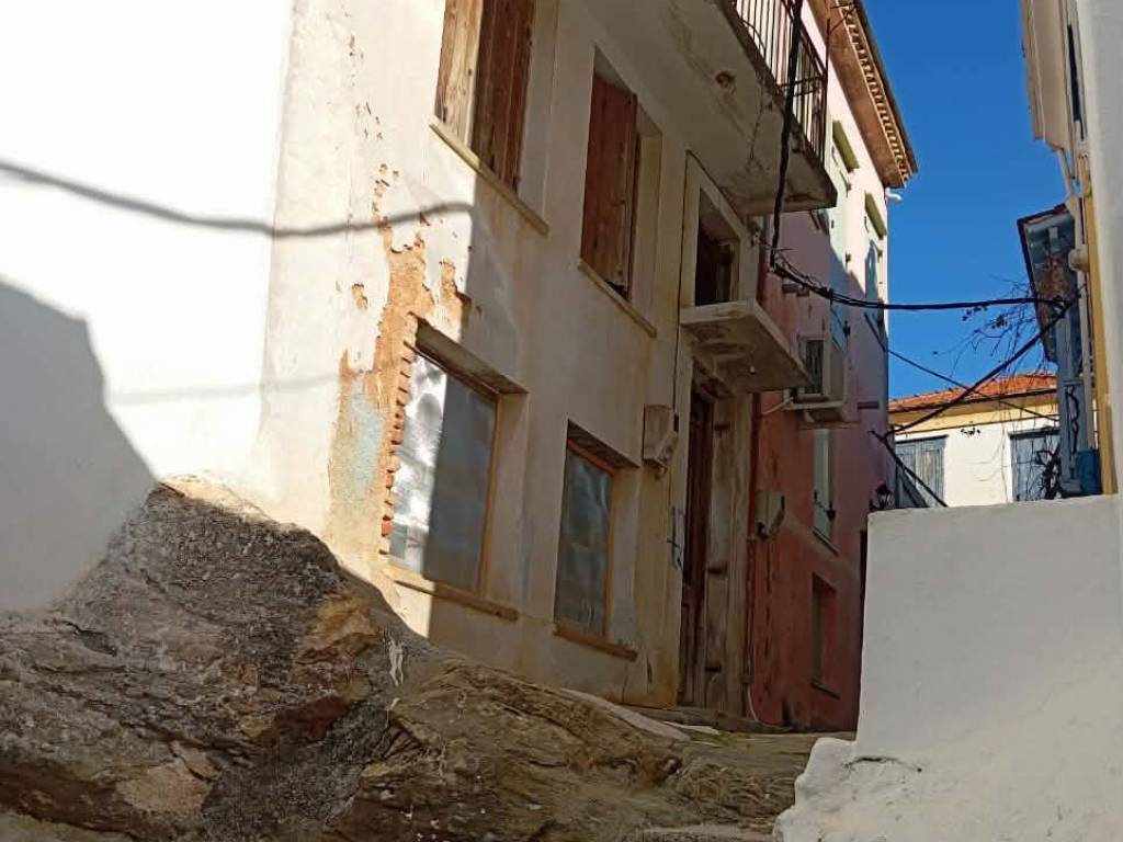 A three-story traditional stone house located within the historic village of Skopelos, in the Agios Panteleimonas area near the castle parking lot. On the ground floor is the kitchen and an old grape press with its original mechanisms, old patterned tiles, an old mosaic kitchen sink, and a traditional fireplace. Except from the kitchen and dining space, a bathroom can easily be created on that floor. An internal staircase leads up to the first floor, which has two bedrooms separated by a wooden partition and an interior window. The floor has two large windows overlooking the cobblestone street. Via the internal staircase, we ascend to the second floor, which is open-plan, featuring one bathroom, two windows, a balcony door, and a balcony offering a panoramic view of the village of Skopelos. The roof is exposed and wooden. The house requires significant renovation, it cannot be inhabited in its present condition. However, it has features that make it a particularly interesting renovation project. The owners will undertake the renovation (or restoration) at a price to be discussed with those interested in purchasing the property.