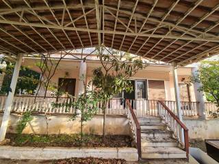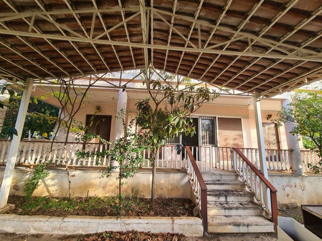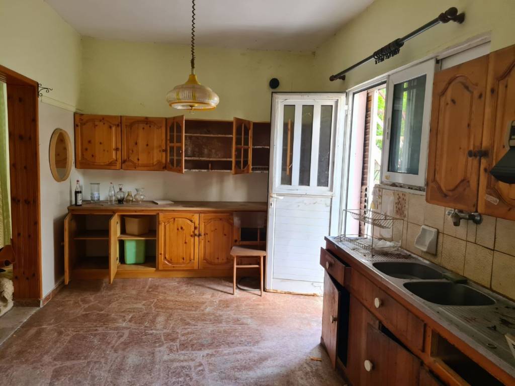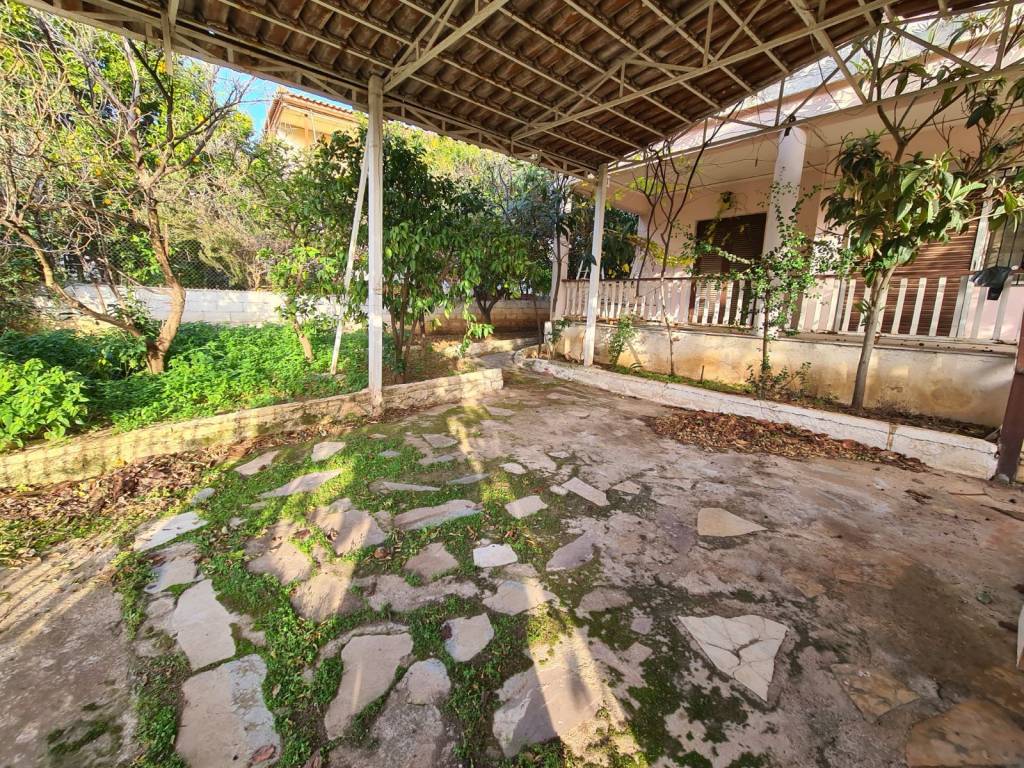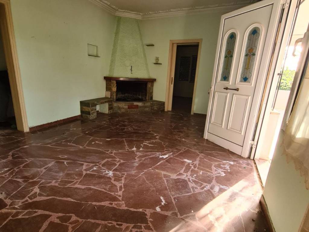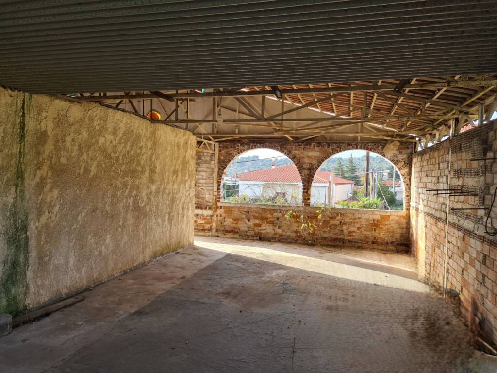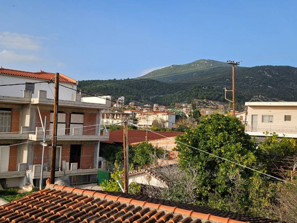 Detached house with a total area of 131 sq.m. on a plot of 395 sq.m., featuring two grand balconies and a covered rooftop terrace. Built in 1977, it requires renovation except for the bedroom windows, which have aluminum frames. From the terrace, there are views of the sea and the mountain, and it is located 800 meters from Politika beach and 450 meters from the central square. The property consists of 3 bedrooms, 1 large living room with a fireplace and dining area, 1 kitchen, and 1 bathroom. It also offers autonomous oil heating, a covered space for 2 parking spots, and a landscape garden.