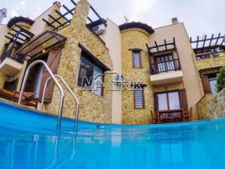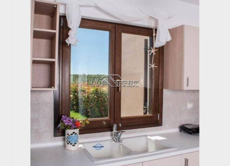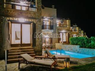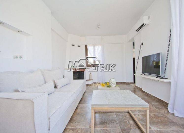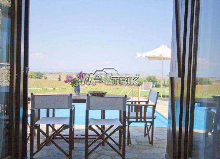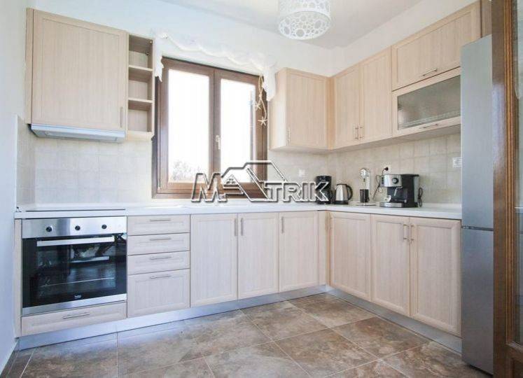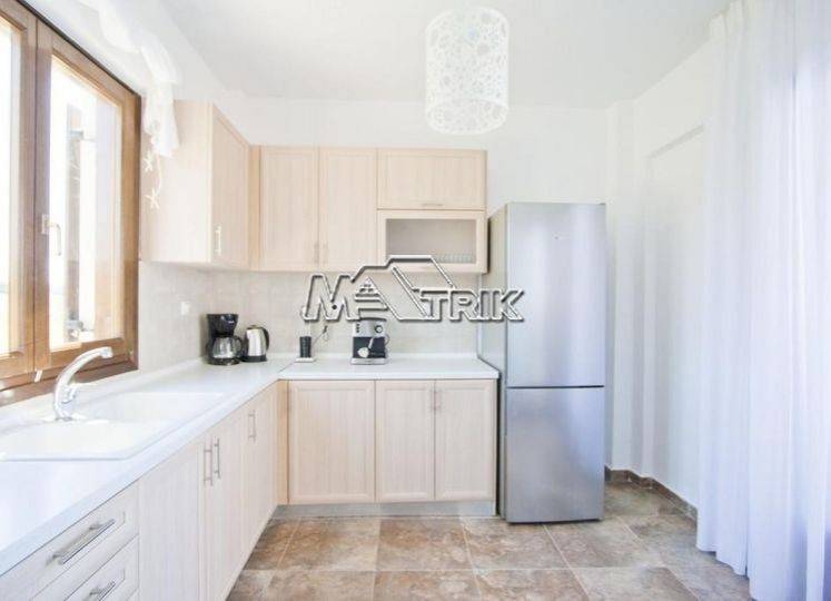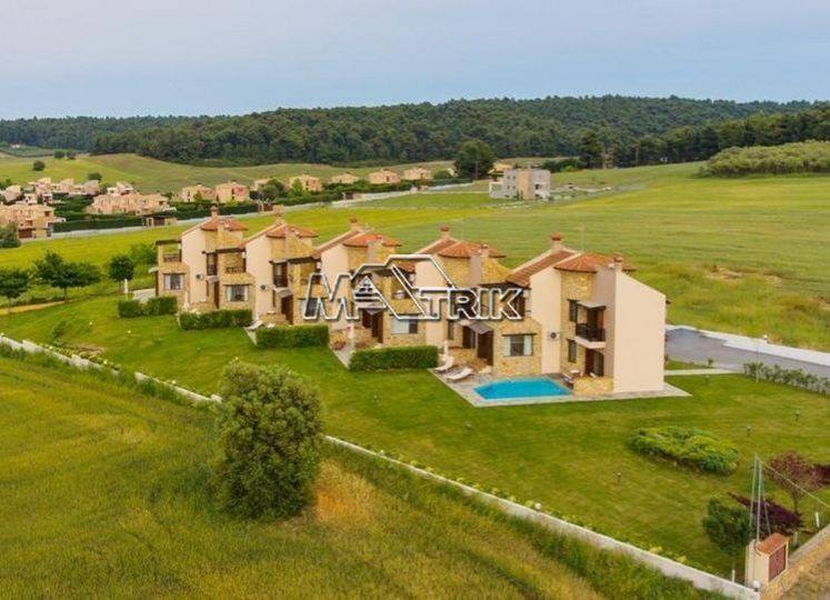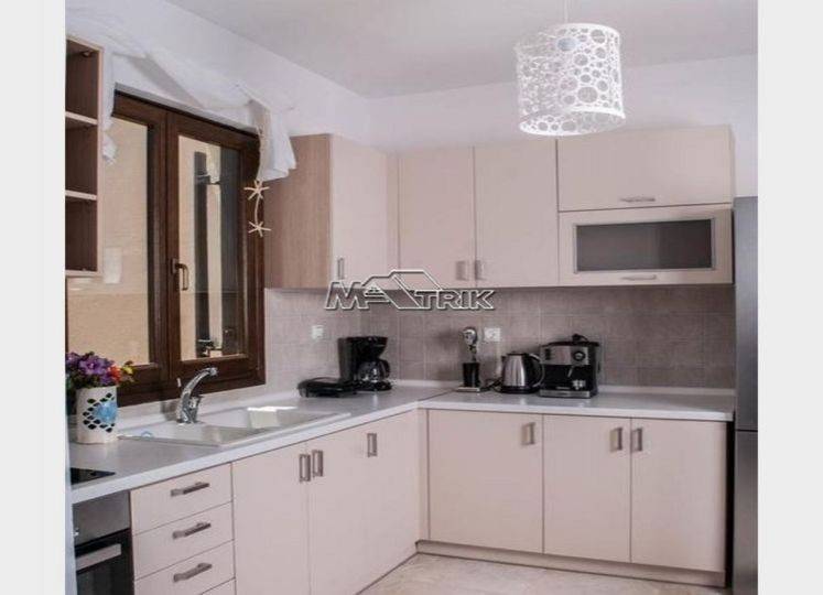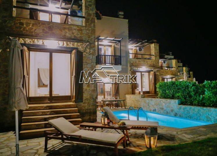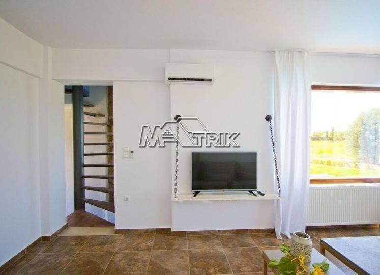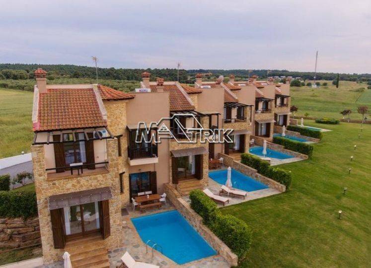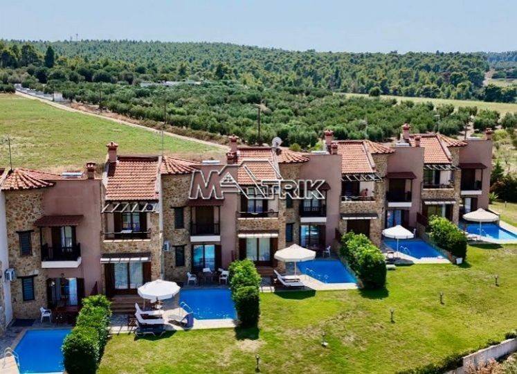 Chalkidiki, Sani, 120sqm maisonette in a residential complex with swimming pool. It consists of three bedrooms, a living room-kitchen, one bathroom and a wc. It has aluminum window frames with double glazing, recoil and nets, tiled floor, armorized door, three a/c, fireplace, individual oil heating system, solar water heater, storage, private pool of 20 sqm, exclusive garden of 50 sqm, one parking space for exclusive use with shelter as it is fully furnished and equipped with all electrical appliances. This is a maisonette of excellent construction and architecture, it is located in a particularly peaceful location and its distance from Sani beach is 1.5km.