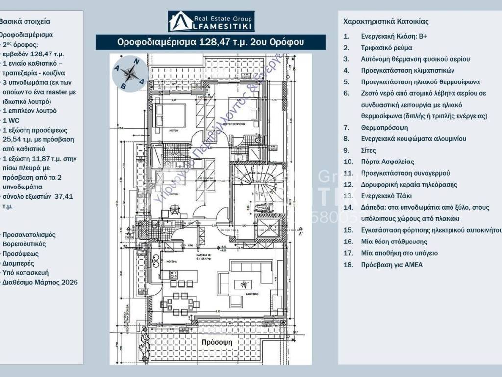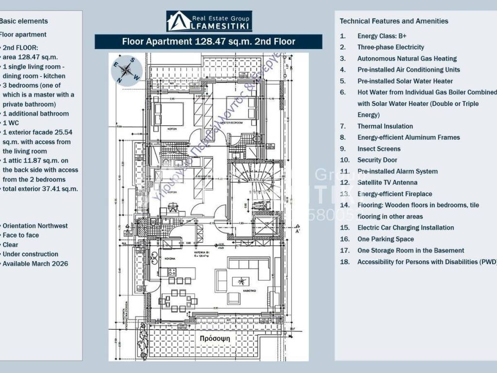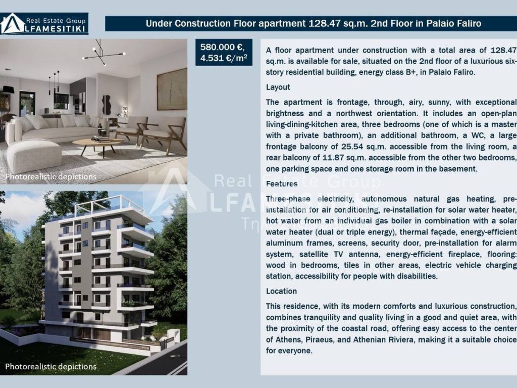 Under Construction Floor Apartment 128.47 sq.m. 2nd Floor in Palaio Faliro A floor apartment under construction with a total area of 128.47 sq.m. is available for sale, situated on the 2nd floor of a luxurious six-story residential building, energy class B+, in Palaio Faliro. Layout The apartment is frontage, through, airy, sunny, with exceptional brightness and a northwest orientation. It includes an open-plan living-dining-kitchen area, three bedrooms (one of which is a master with a private bathroom), an additional bathroom, a WC, a large frontage balcony of 25.54 sq.m. accessible from the living room, a rear balcony of 11.87 sq.m. accessible from the other two bedrooms, one underground or Pilotis parking space, and one storage room in the basement. Features Three-phase electricity, autonomous natural gas heating, pre-installation for air conditioning, re-installation for solar water heater, hot water from an individual gas boiler in combination with a solar water heater (dual or triple energy), thermal façade, energy-efficient aluminum frames, screens, security door, pre-installation for alarm system, satellite TV antenna, energy-efficient fireplace, flooring: wood in bedrooms, tiles in other areas, electric vehicle charging station, accessibility for people with disabilities. Location This residence, with its modern comforts and luxurious construction, combines tranquility and quality living in a good and quiet area, with the proximity of the coastal road, offering easy access to the center of Athens, Piraeus, and Athenian Riviera, making it a suitable choice for everyone ► For more details about the property, the building or the area as well as to visit the property you can visit the page - https://www.alfamesitiki.gr/pdetails?id=Α-146253&lng=en ► For opportunities in similar properties and in other areas visit our page at alfamesitiki.gr ► Last update 31/3/2026 ► Follow us on Facebook www.facebook.com/alfamesitiki.gr