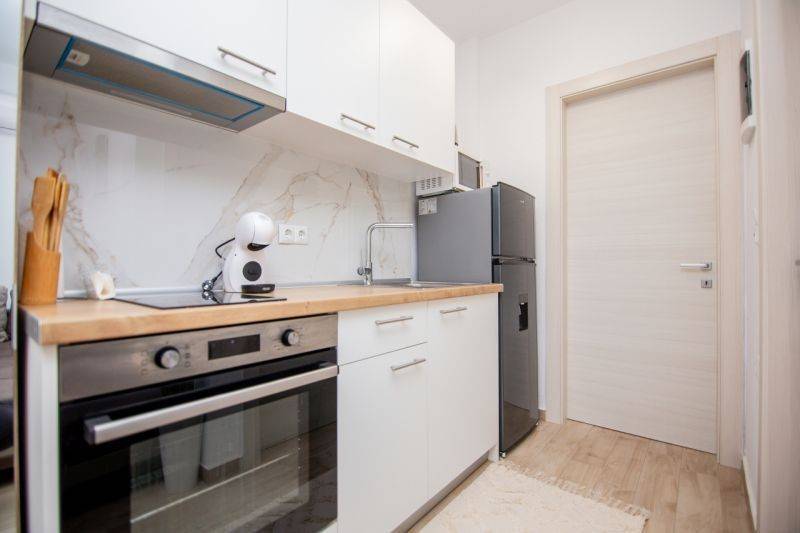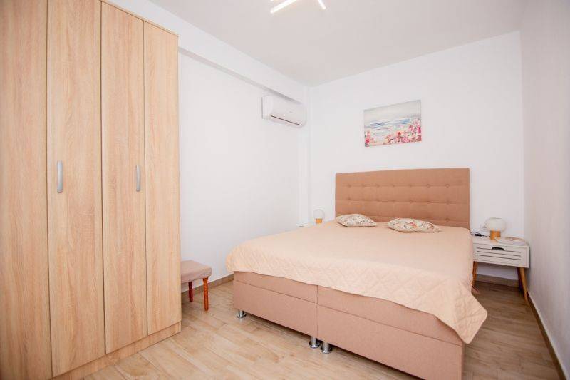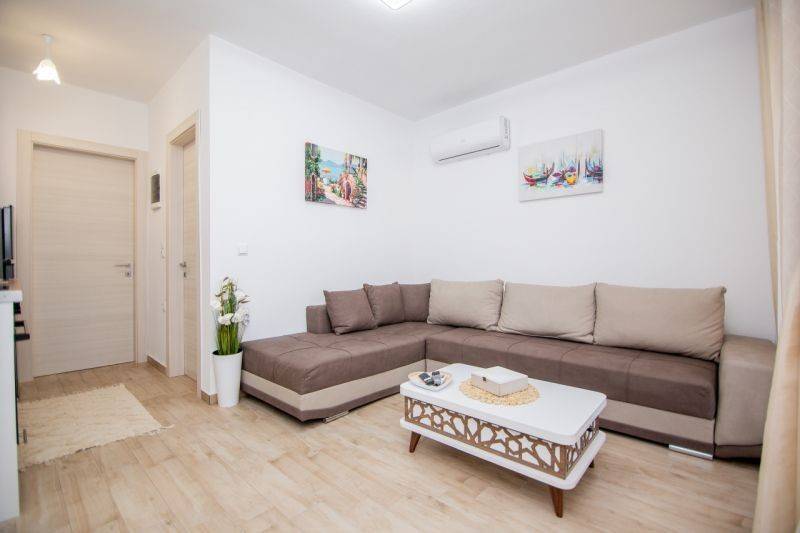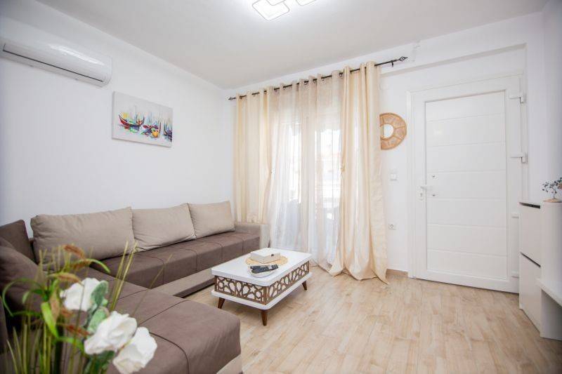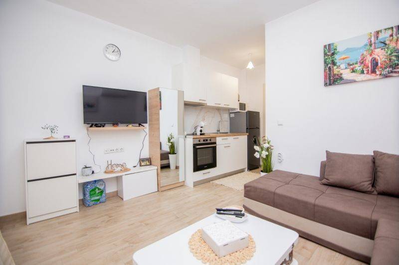 The apartment consists of a living room with kitchen and balcony, one bedroom with balcony, and a bathroom. Additional features of the property include synthetic window frames, sieves, tiled floors, solar water heater, air conditioning in all rooms, and a security door. Outside, the complex has a lawn, ornamental plants, and small trees that are watered by an automatic irrigation system, as well as a communal swimming pool for all the residents. The property is sold with the existing furniture and electrical appliances and is located just 300 meters from the main pedestrian street and faces west.