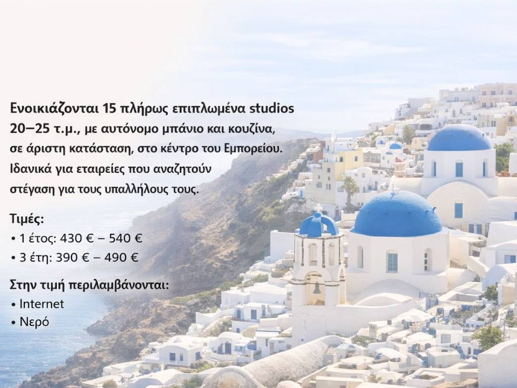 Ενοικιάζονται 15 στούντιο πλήρως επιπλωμένα 20–25 τ.μ., με αυτόνομο μπάνιο και κουζίνα, σε άριστη κατάσταση, στο κέντρο του Εμπορείου. Ιδανικά για εταιρείες που αναζητούν στέγαση για τους υπαλλήλους τους. Τιμές: • 1 έτος: 430 € – 540 € • 2 έτη: 410 € – 510 € • 3 έτη: 390 € – 490 € Στην τιμή περιλαμβάνονται: • Internet • Νερό Όλες οι μισθώσεις γίνονται μόνο με νόμιμο μισθωτήριο.