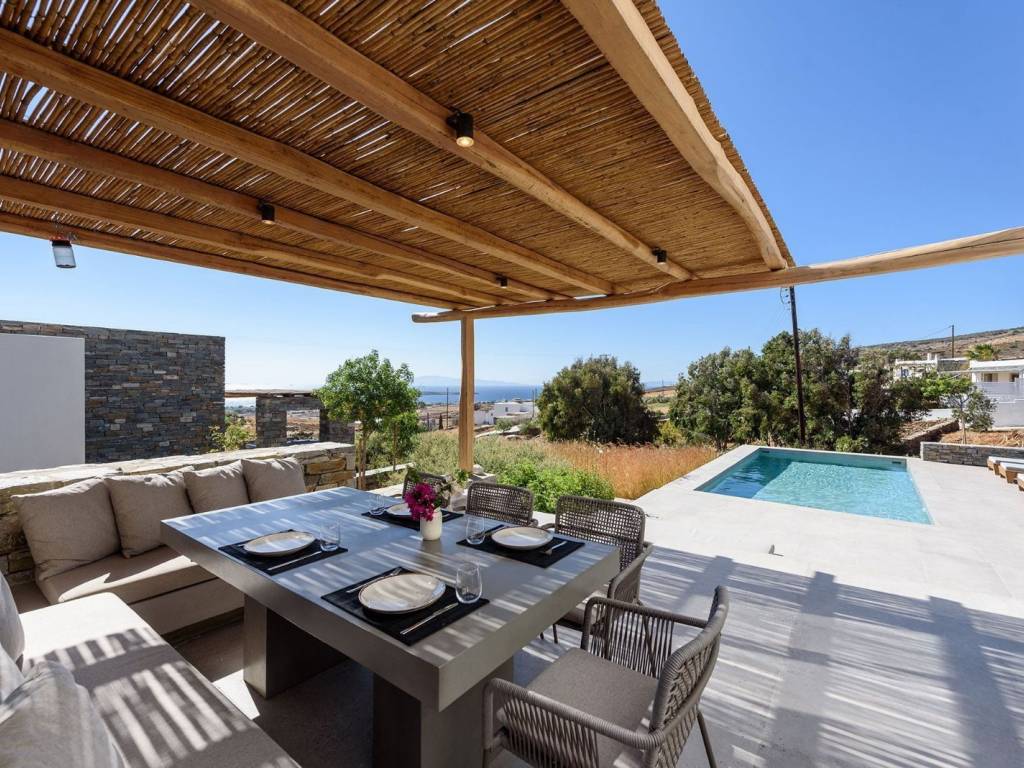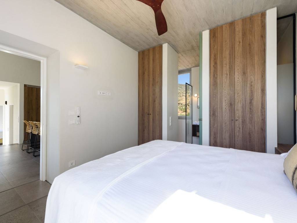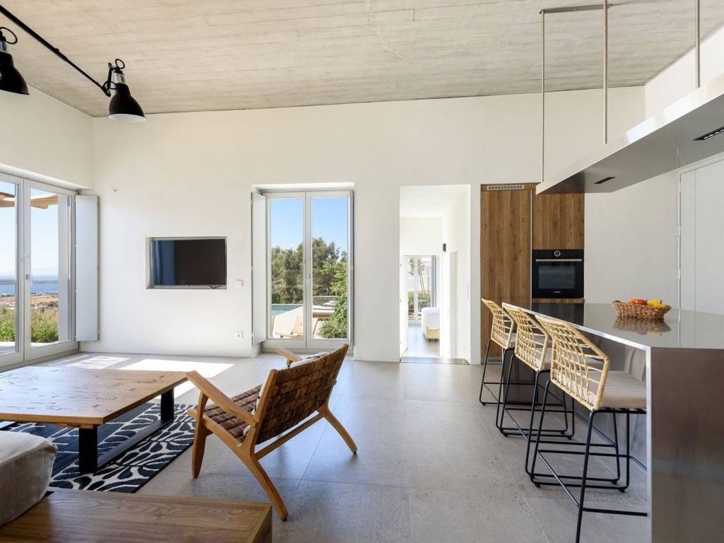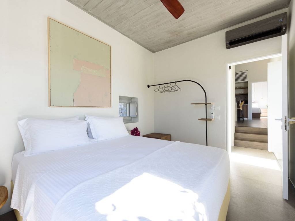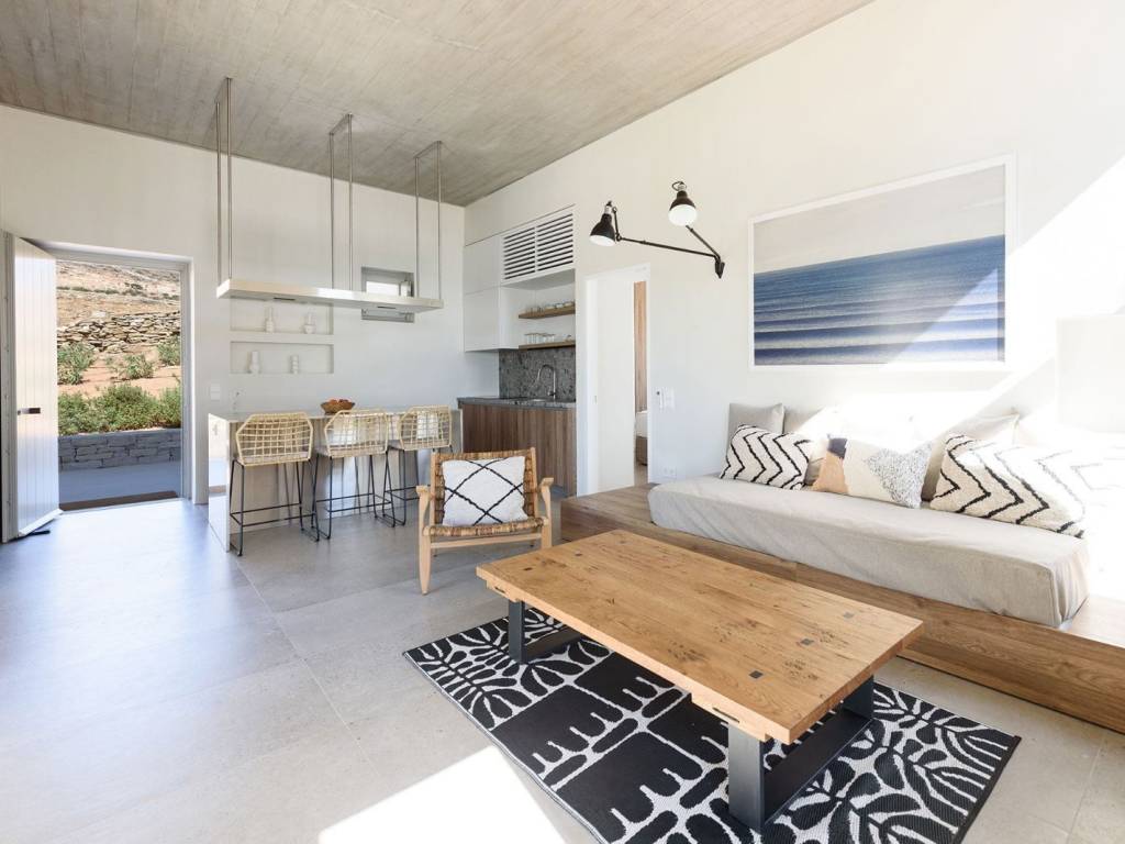 This luxurious villa is a modern, newly constructed villa from 2021, offering 90 sqm of elegant living space on a 4,000 sqm independent plot with two other villas nearby and a private pool. It features two master bedrooms, a spacious living area with an open-plan kitchen, and contemporary design elements that blend seamlessly with the landscape. The villa provides a private and serene setting, perfect for relaxing island getaways, with ample outdoor space for enjoyment and privacy. The villa offers a private and peaceful setting, ideal for relaxing getaways on the island, with plenty of outdoor space for entertainment and privacy. It is situated on a 4000-square-meter plot, facing south and offering easy access to all the island’s main attractions, while boasting views of Naxos and the Aegean Sea. Villa Malva, with a floor area of 95 sq. m., is the ideal place to enjoy a relaxed island lifestyle with your family or friends. The sunny outdoor areas feature a dining area with a pergola, as well as a coffee corner. The 3.7m x 8m pool is the highlight of the apartment, surrounded by a low garden and decorated with boho-chic elements on gray concrete surfaces. The contemporary feel, both inside and out, defines the overall atmosphere you’ll experience. An open-concept, fully equipped kitchen with a large stainless steel island, located right next to the living room as you enter the home. Decorated with large cushions in shades of sand, it welcomes you for a break indoors, with a view through the large windows onto the terrace.