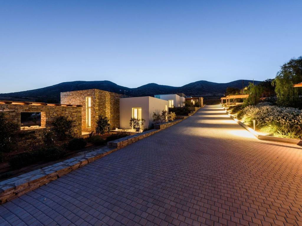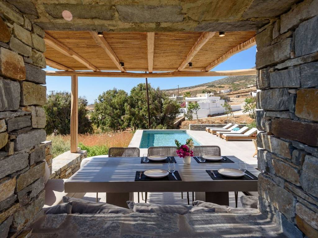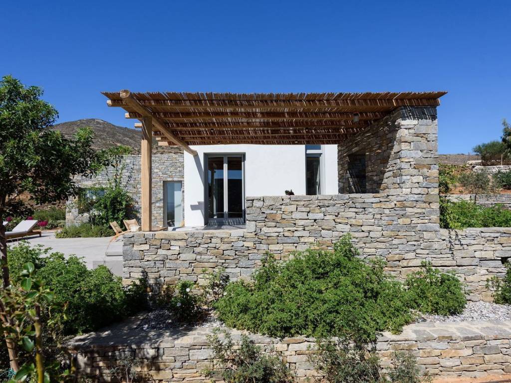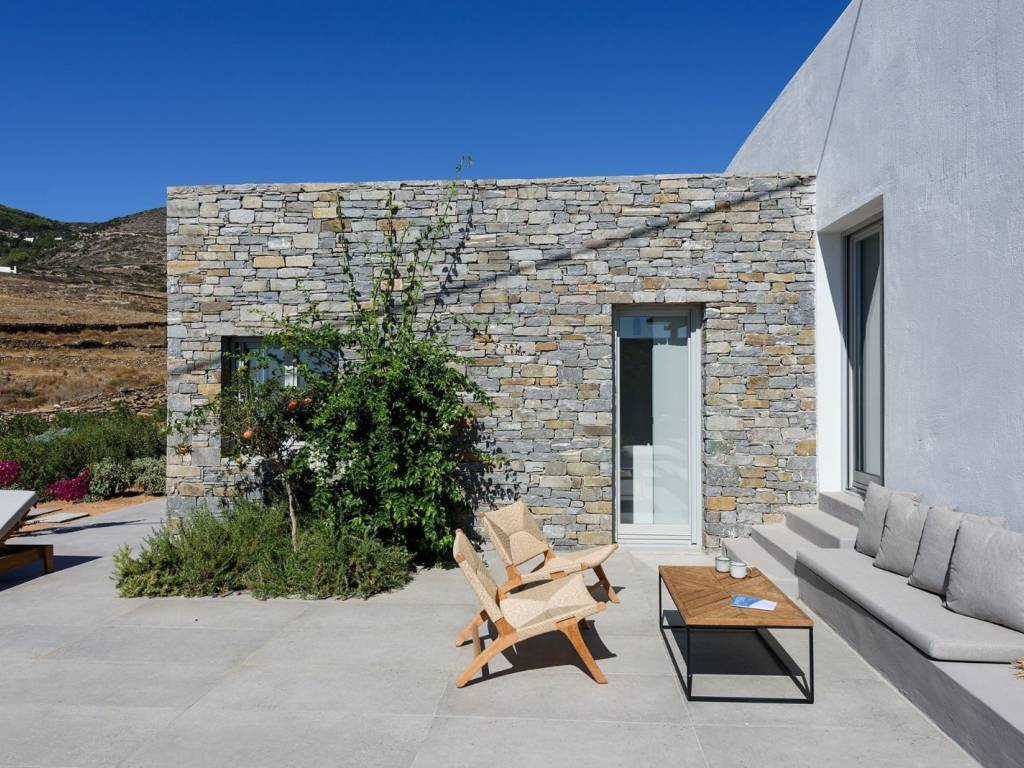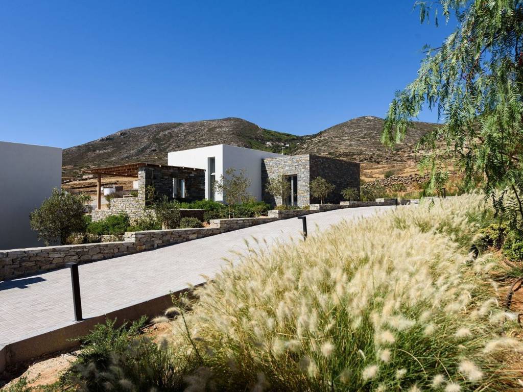 This luxurious villa is a modern, newly constructed villa from 2021, offering 90 sqm of elegant living space on a 4,000 sqm independent plot with two other villas nearby and a private pool. It features two master bedrooms, a spacious living area with an open-plan kitchen, and contemporary design elements that blend seamlessly with the landscape. The villa provides a private and serene setting, perfect for relaxing island getaways, with ample outdoor space for enjoyment and privacy. The villa offers a private and peaceful setting, ideal for relaxing getaways on the island, with plenty of outdoor space for entertainment and privacy. It is situated on a 4000-square-meter plot, facing south and offering easy access to all the island’s main attractions, while boasting views of Naxos and the Aegean Sea. Villa Malva, with a floor area of 95 sq. m., is the ideal place to enjoy a relaxed island lifestyle with your family or friends. The sunny outdoor areas feature a dining area with a pergola, as well as a coffee corner. The 3.7m x 8m pool is the highlight of the apartment, surrounded by a low garden and decorated with boho-chic elements on gray concrete surfaces. The contemporary feel, both inside and out, defines the overall atmosphere you’ll experience. An open-concept, fully equipped kitchen with a large stainless steel island, located right next to the living room as you enter the home. Decorated with large cushions in shades of sand, it welcomes you for a break indoors, with a view through the large windows onto the terrace.