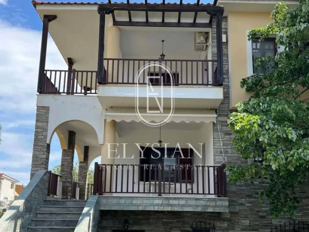 Property Code: ELS1544 - House FOR SALE in Sithonia Paralia Nikitis for € 520.000 . This 150.00 sq. m. House consists of 3 levels and features 3 Bedrooms, 2 Livingrooms, 2 Kitchens, 3 bathrooms . The property also boasts Heating system: Autonomous heating - Oil, tiled floor, unobstructed view, Window frames: Wooden, Armourplated door, parking, a storage unit sqm, garden, fireplace, A/C, open space. The building was constructed in 1997 . Building Energy Rating: B+