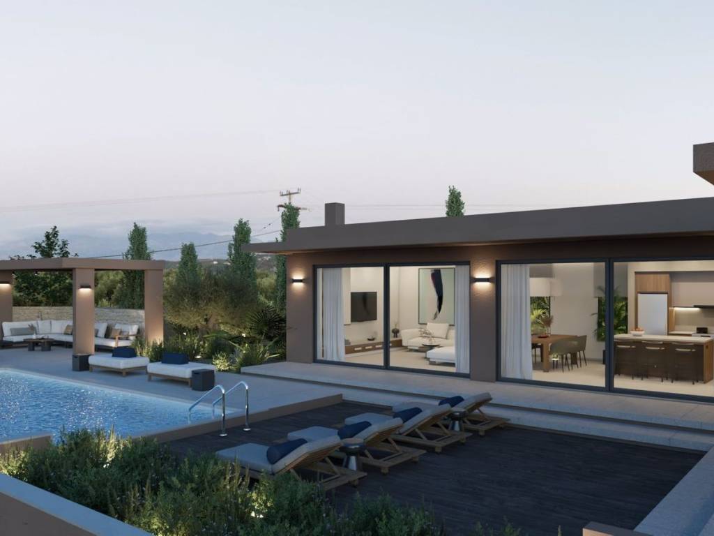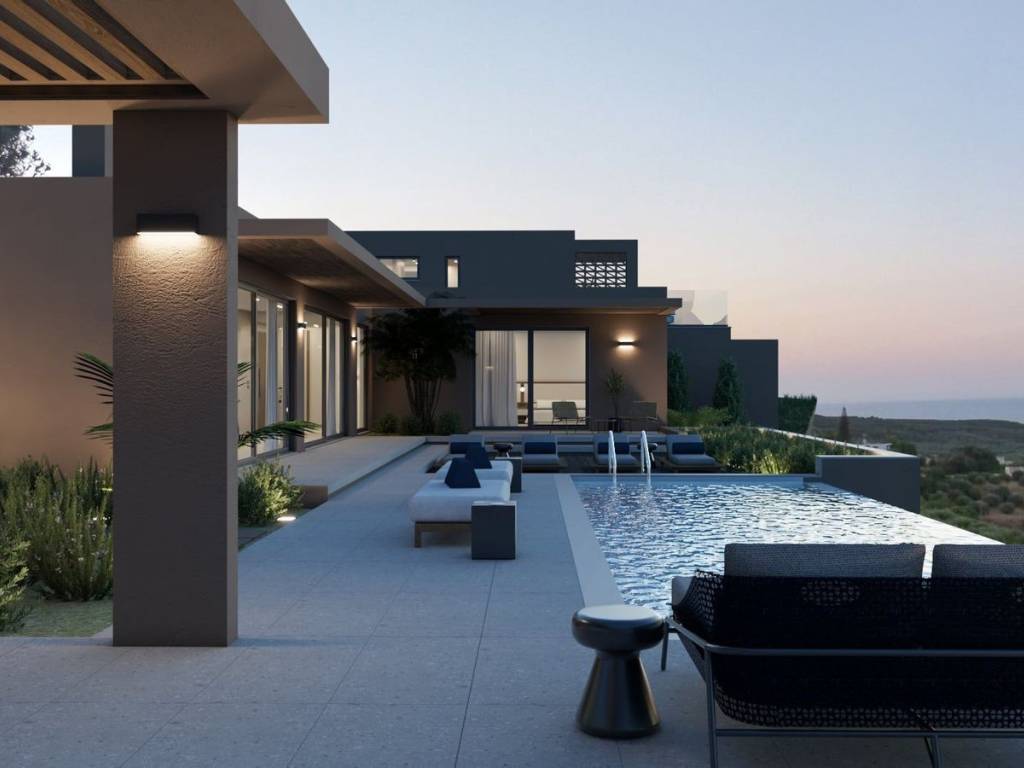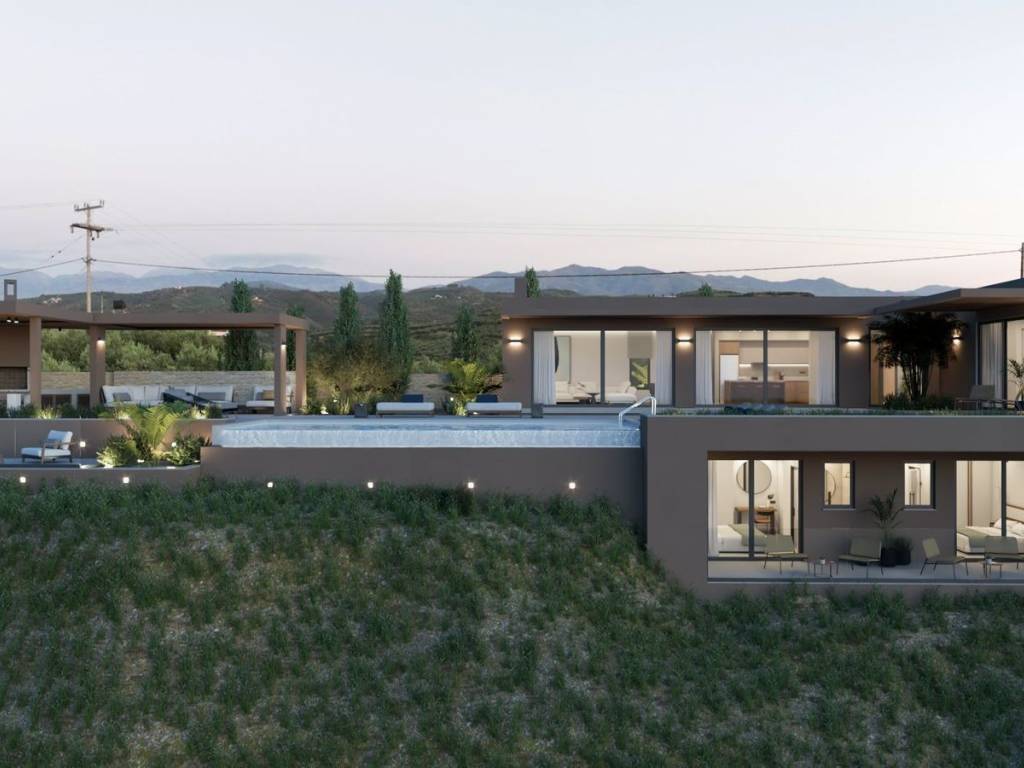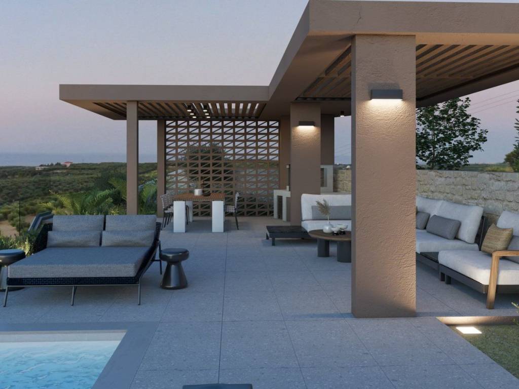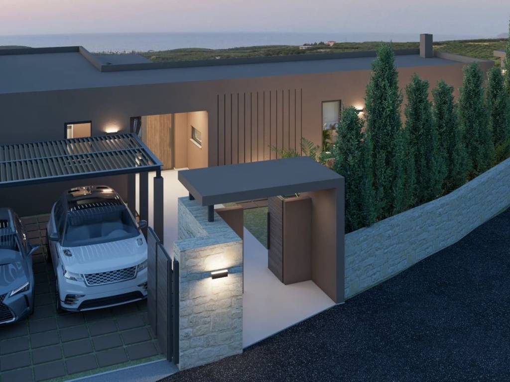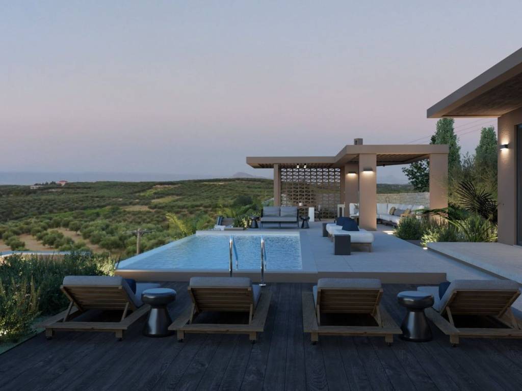 A true landmark of high aesthetic, privacy and breathtaking vistas to the endless blue, nestled among Crete's endless olive groves.As the site has unobstructed views to the sea, the intention is to create a residence which maximises the visual connection to the sea. Along the whole villa, towards the north, stretches the open-air landscaped area, divided into two levels. In front of the common areas is the covered outdoor seating area and the swimming pool; canopies offer protection from sun during the summer.The villa's interior areas are L-shaped, literally embracing the outdoor area as a central point. It's also taking the pool experience to a whole new level. Enjoy the panorama while seated at the specially designed outdoor lounges or catch the sun on the wooden deck.The living areas are designed and developed along the view line, making full use of its potential. Large openings allow natural light to penetrate the interior, adding thermal efficiency during the winter period. The domination of earthy tones and its combination with contemporary materials highlight the form and the simplicity of the design.The villa covers a total of 229 sqm, on a plot of 983 sqm. It enjoys an open plan kitchen with high-end finishes and a stylish bar-stand which becomes the focal point. This area connects seamlessly with the dining area and the living room. This level is also flanked by an en-suite bedroom, oriented towards east. A stairway links the two levels. Downstairs, there are two secluded bedrooms with fitted wardrobes and en-suite bathrooms as well as a storeroom. Both bedrooms lead out to a shared verandah with breathtaking views to the coastline of Platanias and the Mediterranean Sea.A sleek wooden carport provides shelter for two cars and a nicely done pathway serves the accessibility to the villa.