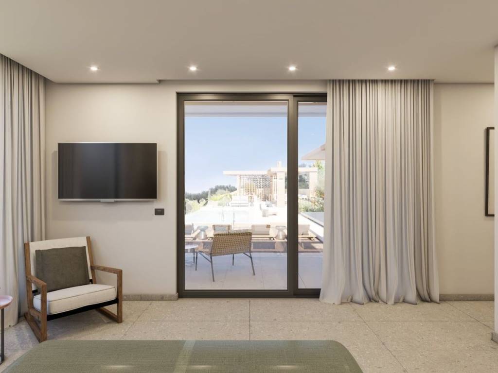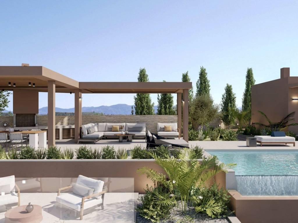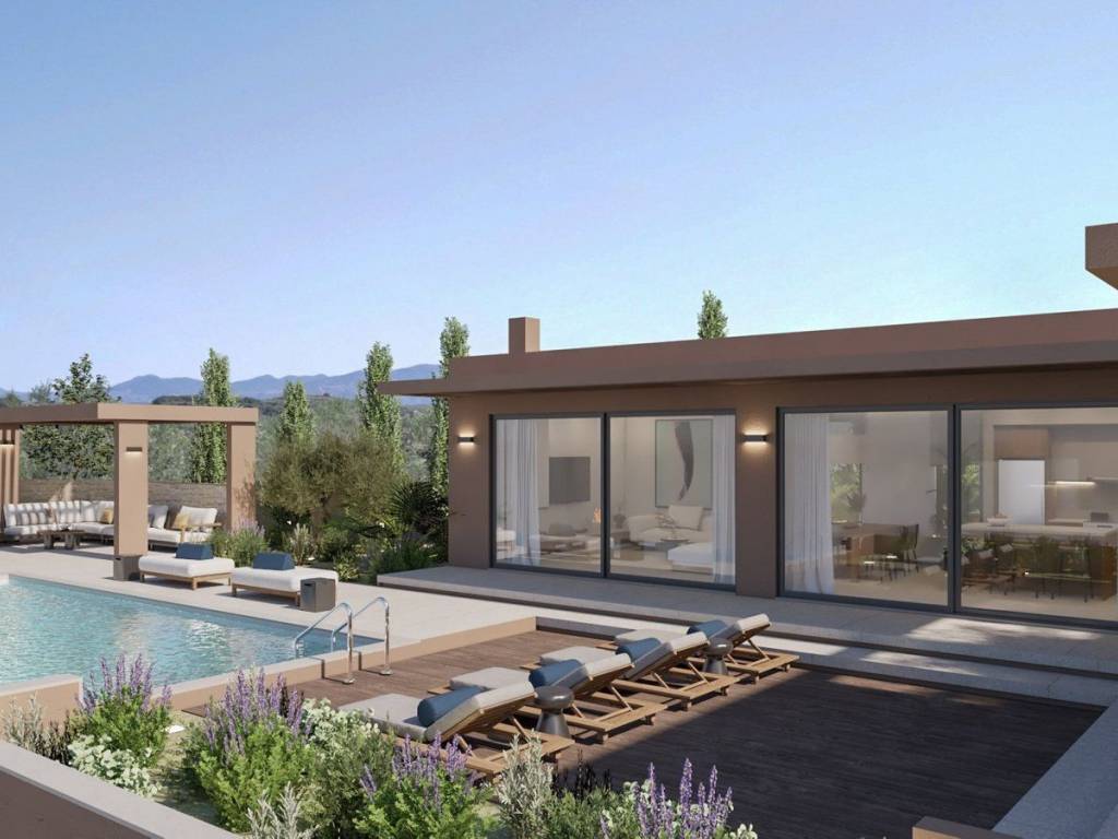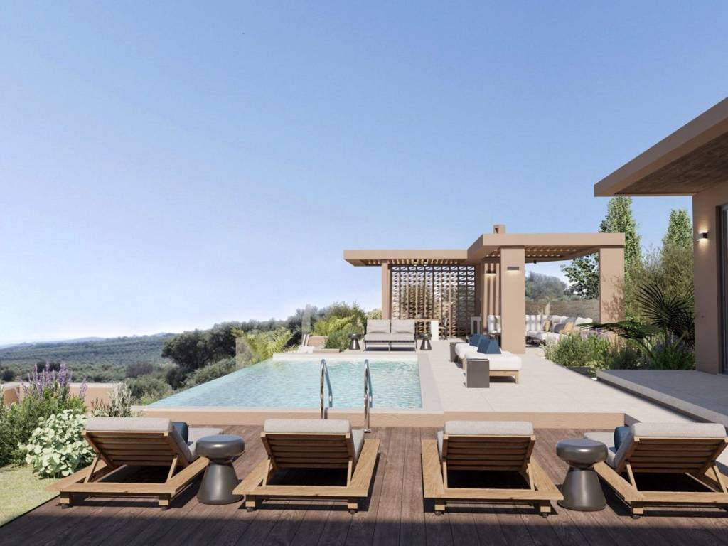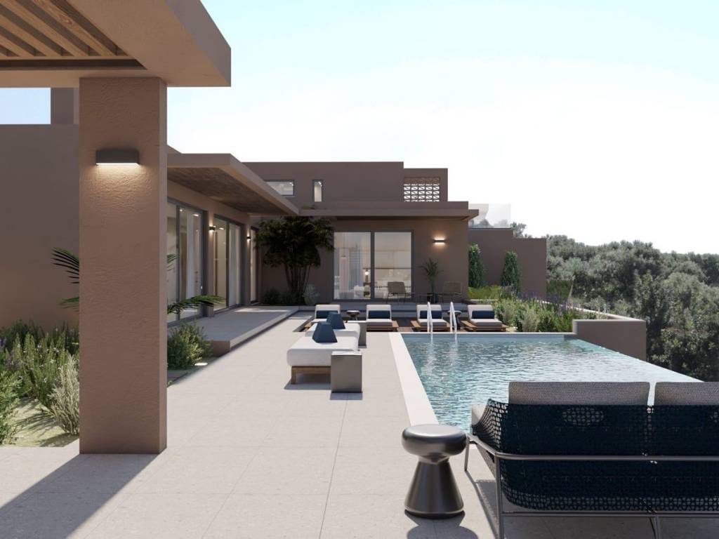 A true landmark of high aesthetic, privacy and breathtaking vistas to the endless blue, nestled among Crete's endless olive groves.As the site has unobstructed views to the sea, the intention is to create a residence which maximises the visual connection to the sea. Along the whole villa, towards the north, stretches the open-air landscaped area, divided into two levels. In front of the common areas is the covered outdoor seating area and the swimming pool; canopies offer protection from sun during the summer.The villa's interior areas are L-shaped, literally embracing the outdoor area as a central point. It's also taking the pool experience to a whole new level. Enjoy the panorama while seated at the specially designed outdoor lounges or catch the sun on the wooden deck.The living areas are designed and developed along the view line, making full use of its potential. Large openings allow natural light to penetrate the interior, adding thermal efficiency during the winter period. The domination of earthy tones and its combination with contemporary materials highlight the form and the simplicity of the design.The villa covers a total of 229 sqm, on a plot of 983 sqm. It enjoys an open plan kitchen with high-end finishes and a stylish bar-stand which becomes the focal point. This area connects seamlessly with the dining area and the living room. This level is also flanked by an en-suite bedroom, oriented towards east. A stairway links the two levels. Downstairs, there are two secluded bedrooms with fitted wardrobes and en-suite bathrooms as well as a storeroom. Both bedrooms lead out to a shared verandah with breathtaking views to the coastline of Platanias and the Mediterranean Sea.A sleek wooden carport provides shelter for two cars and a nicely done pathway serves the accessibility to the villa.
