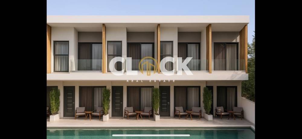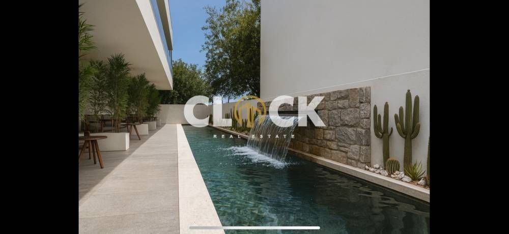At the heart of the shared space lies an impressive swimming pool with modern design and a cascading waterfall, offering moments of relaxation and luxury. The surrounding landscape will be thoughtfully arranged with low-maintenance plantings, including cacti and Mediterranean flora, reinforcing the minimal aesthetic and visual harmony of the complex.