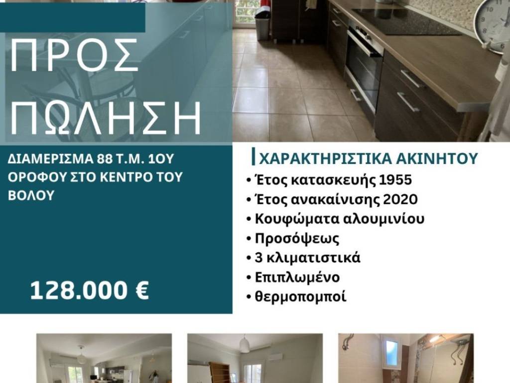 **RELAND** Apartment for sale, 88 sq.m., front-facing, on the 1st floor, located in the center of Volos. It consists of an open-plan living room and kitchen with a breakfast bar, 2 bedrooms, a bathroom, and 2 balconies. **PROPERTY FEATURES:** • Year of construction: 1955 • Year of renovation: 2020 • Aluminum window frames • 3 air conditioning units • Electric heaters • Bright and front-facing An ideal choice for owner-occupation or investment, as it is located in the city center. With immediate access to a bus stop, supermarket, commercial market, the Economics Department, etc. **AVAILABLE IMMEDIATELY!** *ALSO AVAILABLE FURNISHED* For more information or to schedule an appointment, please contact: 6970080280, 6971709192, 6972120941