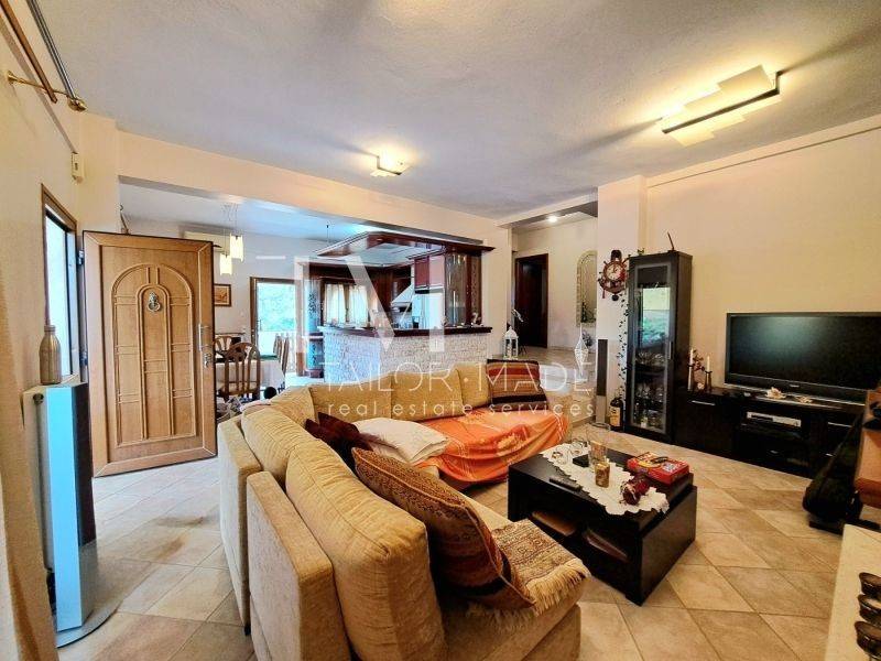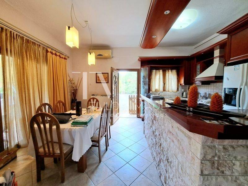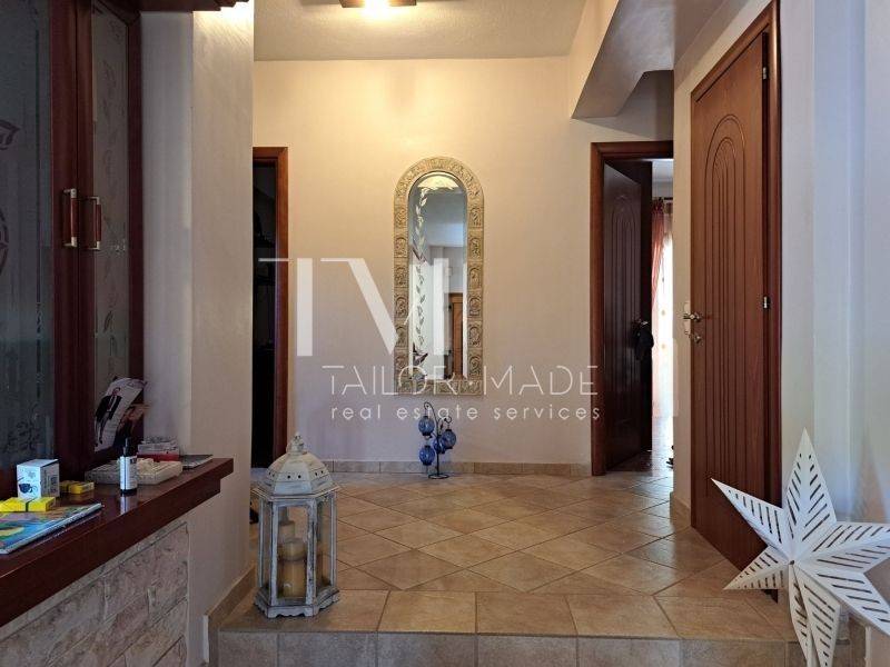 On the first floor lies a well-maintained, cross-ventilated apartment of 115.14 sq.m., featuring a functional layout. It consists of 3 bedrooms (one master), a bright open-plan living area with fireplace, 2 bathrooms with bathtub and natural ventilation, and a small utility/storage room with laundry space.