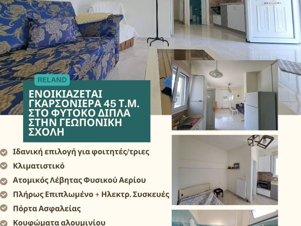 Studio Apartment for Rent 45 sq.m. | Fytoko, Volos ✨ A great choice for comfortable and affordable living in a quiet area close to the university **Ideal for students of the Agricultural University** – just a short distance away! Bright & functional layout Fully furnished + electrical appliances Air conditioning Autonomous natural gas heating Aluminum window frames Security door Location: Fytoko Quiet neighborhood Very close to the Agricultural University Easy access to shops & public transport Price: €350 / month Contact us for more information or to schedule a viewing
