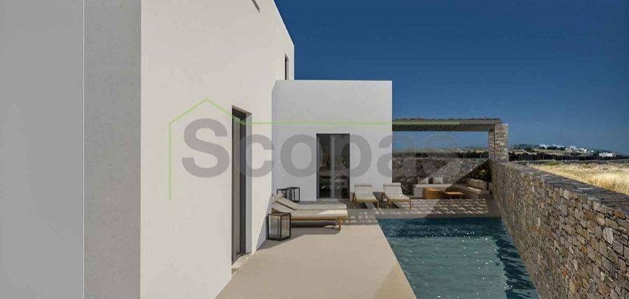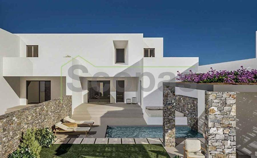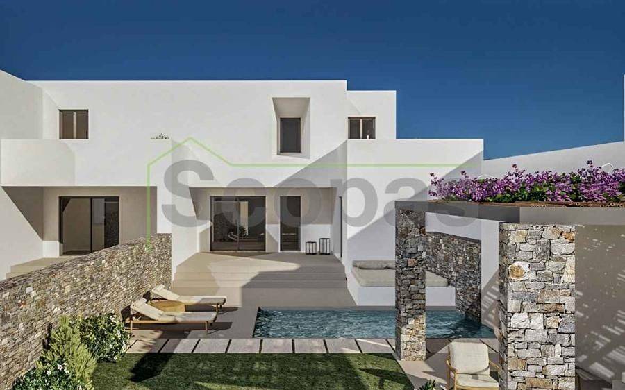 House of 120.80m2 for sale by SCOPAS REAL ESTATE & CONSTRUCTION. 2-level house of 120.80m2 (fully furnished), on a plot of 1006m2, on the south side of Paros, in the area of Agkairia. The property consists of 3 bedrooms, all with ensuite bathrooms, a living room area, a kitchen and a wc. It also has a beautiful outdoor area with a swimming pool, a yard, and parking. Western orientation with a unique view of the Aegean Sea and Antiparos Island. Suitable for permanent or holiday home in the idyllic Cycladic landscape. It is also an ideal choice for investment. Accessible by paved road. 1.9 km from the sea, 5 km from the airport, 13.3 km from the port.