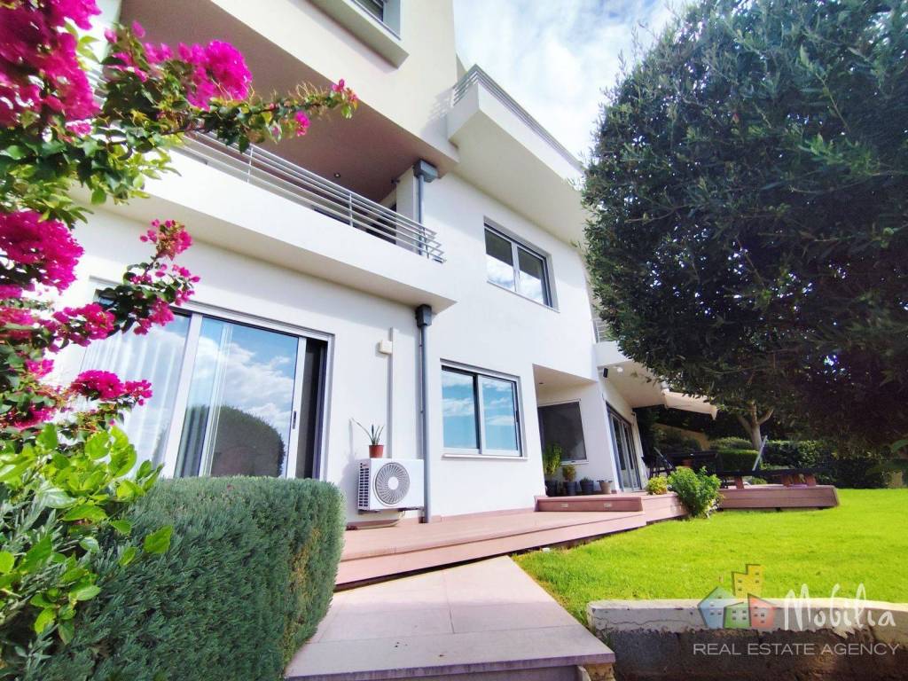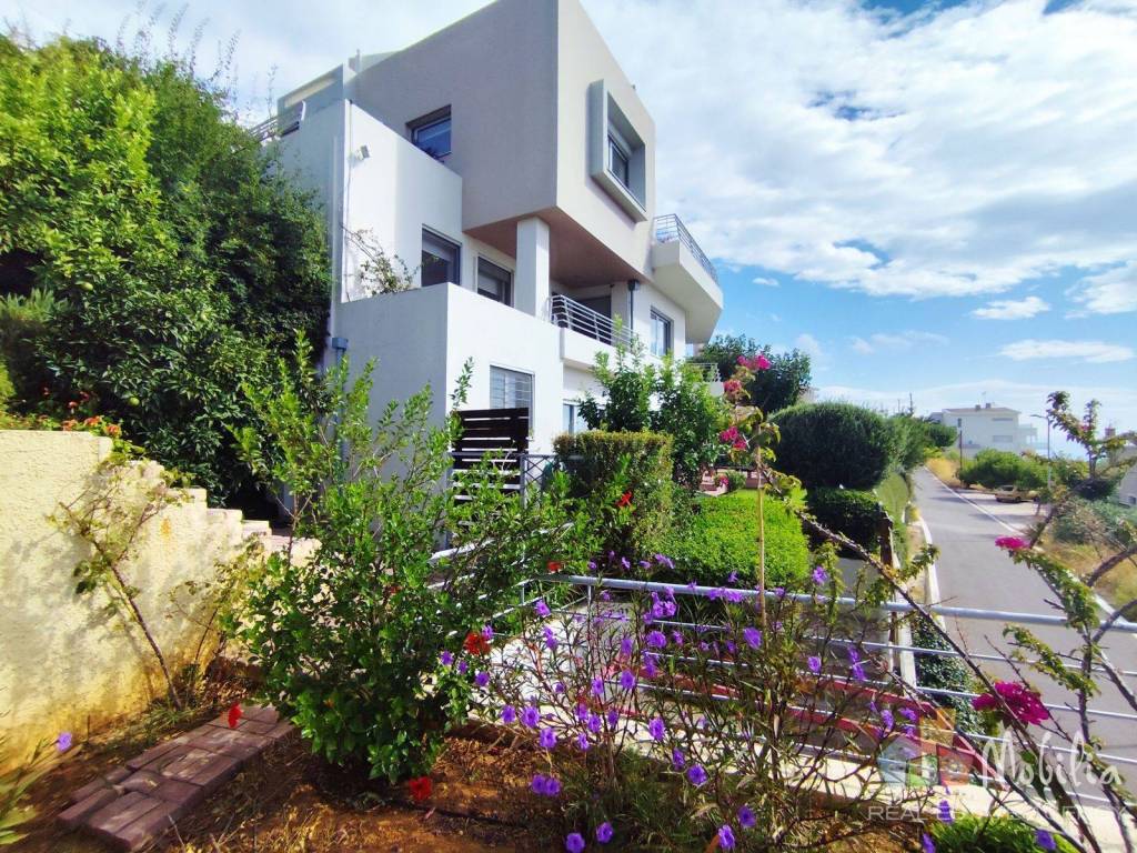For sale is a minimalist maisonette of 480 sq m. in Neo Voutzas, on a corner plot of 605 sq m., with an unobstructed view of the sea. The property is a creation of architects and engineers, with particular emphasis on aesthetics, functionality and quality of construction. It is a three-story building consisting of 2 independent apartments with exclusive use of their own garden and entrances from a different street on a sloping plot. (different levels) The ground floor of 112 sq m. includes an open space with kitchen, bathroom and an independent guest house of 17 sq m. with its own entrance and bathroom. The first floor of 130 sq m. includes a master bedroom, two additional bedrooms with a shared bathroom and storage room. There is also a bathroom and bedroom on the same floor, separated by plasterboard so that it can easily be converted into a 4floor house. On the third floor there is an open space with kitchen, dining room, living room with fireplace and wc. The internal staircase takes you to the fourth floor for multiple uses, currently as an office. All main rooms have large openings and panoramic breath taking sea views. The property includes a private closed parking space of 36 sq.m. for two vehicles with direct access from the road. This is a property of high aesthetics and a special architectural identity, ideal for a main or holiday home. Mobilia Real Estate, Contact Phone: 2107563200, email: info@mobilia.gr, website: www.mobilia.gr