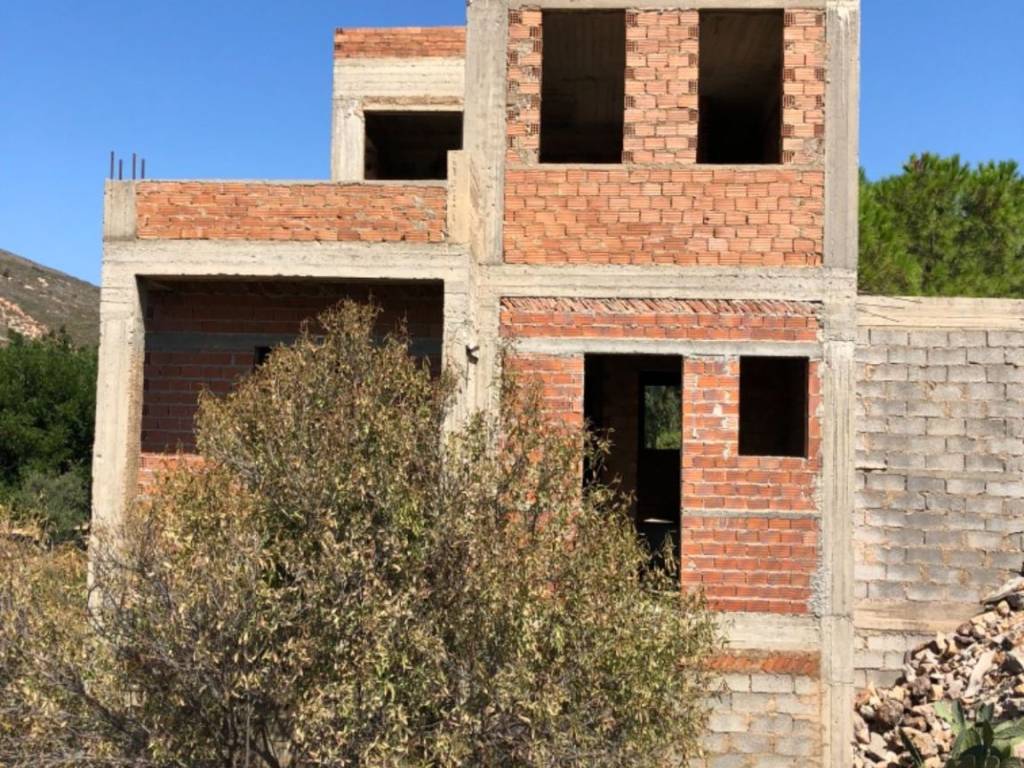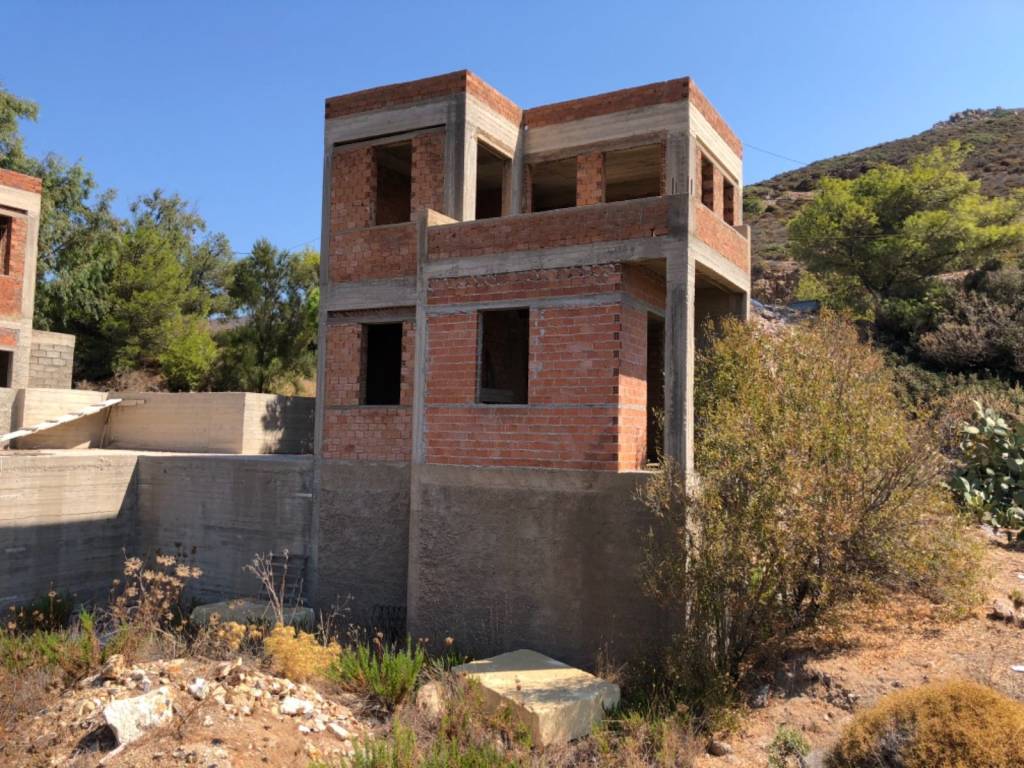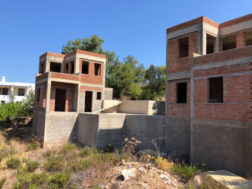 Two detached, unfinished, three storey houses for sale on the main road from Kampos to Lampi. Privileged location, 100m from Kampos beach.