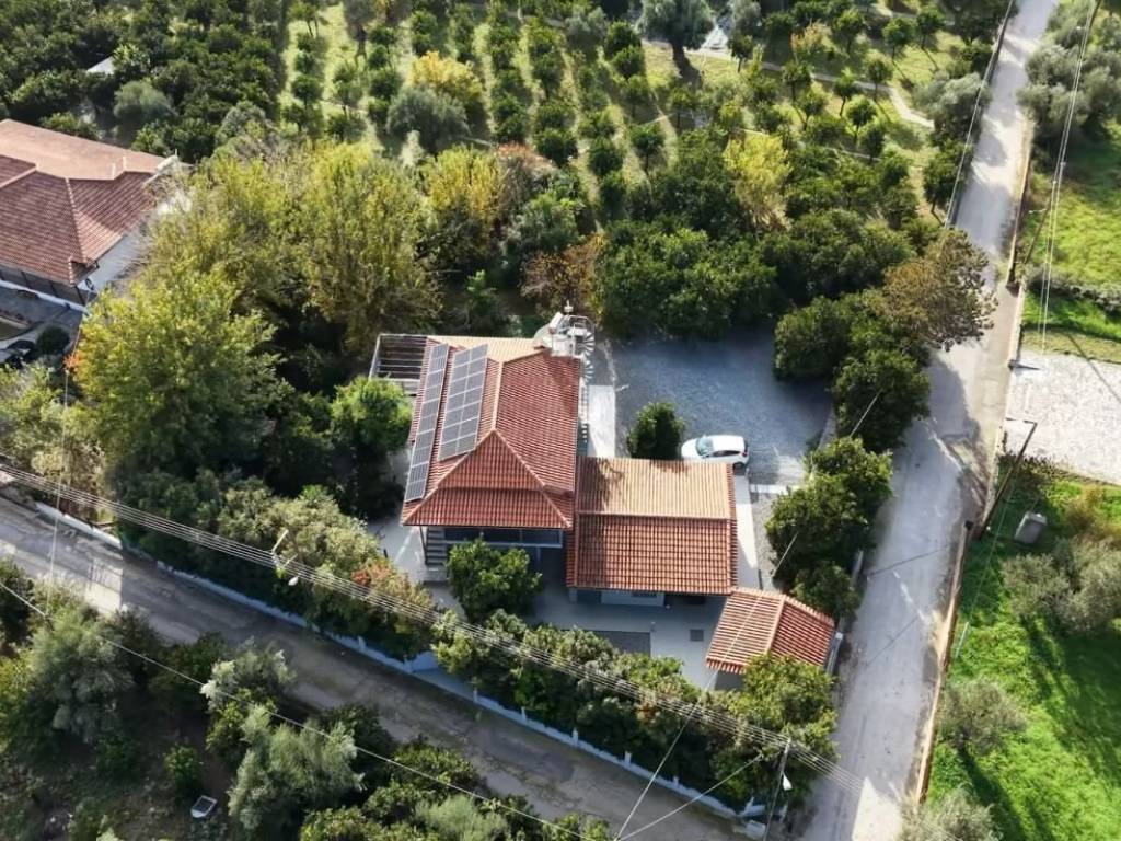 Detached house of 147 sq.m. with auxiliary rooms of 60 sq.m. on a plot of 5000 sq.m. (250 orange trees, 100 fruit and olive trees) . On the 3 plots that live, each plot builds a 400 sq m house. Underfloor heating-cooling with a heat pump, solar water heater, photovoltaic panels closed circuit cameras, perimeter alarm.