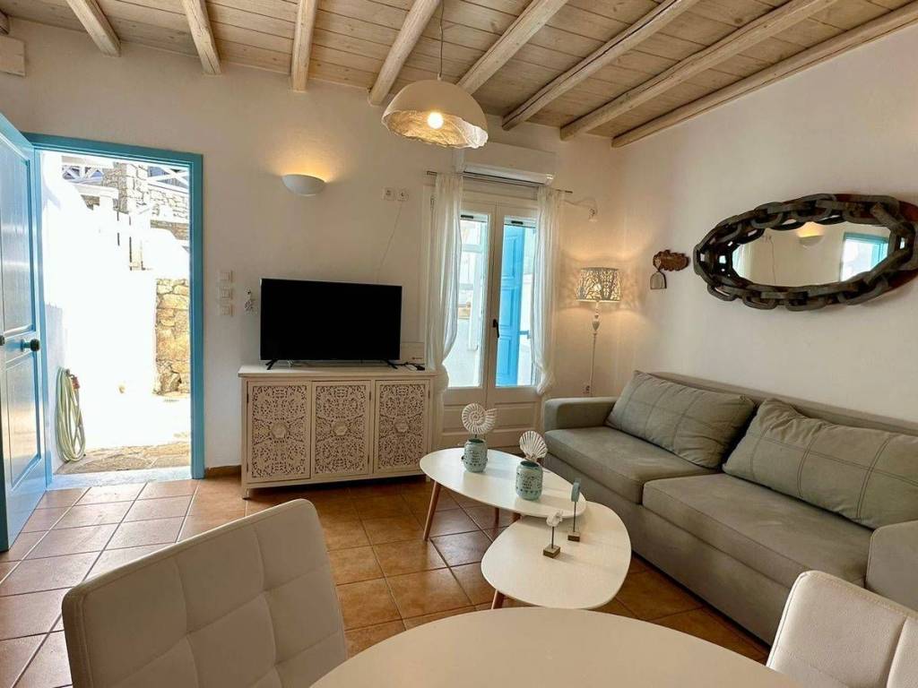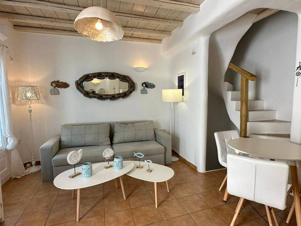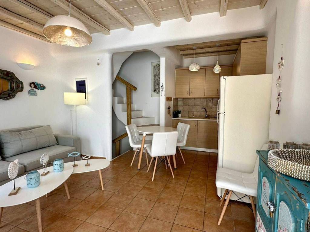 This charming townhouse in Mykonos boasts an exceptional location, just a stone’s throw away from the beach. It is the perfect choice for families seeking a comfortable and relaxing stay in one of the most popular areas of the island. Within a short walk, guests will find a stunning sandy beach with crystal-clear waters, ideal for swimming, sunbathing, and enjoying the Mediterranean sun. This family-friendly townhouse in Mykonos offers a delightful home away from home. This exquisite house features three floors, each accommodating two guests. In addition, there are two extra foldable beds available to accommodate two more guests. The kitchen is fully equipped, allowing guests to prepare their own meals. The cozy living room provides a perfect place to unwind and enjoy your favorite channels on our smart TV. Simply bring your positive energy, and you are guaranteed to have an unforgettable time. Facilities & Services Featuring a private entrance, this air-conditioned holiday home is consisted of of 1 living room, 2 separate bedrooms and 2 bathrooms with a shower and a hairdryer. The kitchen is fitted with a refrigerator, kitchenware and a tea and coffee maker. Boasting a terrace with garden views, this holiday home also offers a washing machine and a flat-screen TV. The unit offers 4 beds. House Facilities • Safe • Flat-screen TV • Sofa • Sitting area • Private entrance • Sofa bed • Heating • Washing machine • Cleaning products • Air conditioning Kitchen and dining • Kitchen • Refrigerator • Cooking basics • Dishes and silverware • Freezer • Oven • Hot water kettle • Coffee maker • Toaster Bathroom • Hair dryer • Cleaning products • Shampoo, Conditioner, Shower gel Bedroom and laundry • Free washer – In unit • Essentials • Extra pillows and blankets • Room-darkening shades • Iron