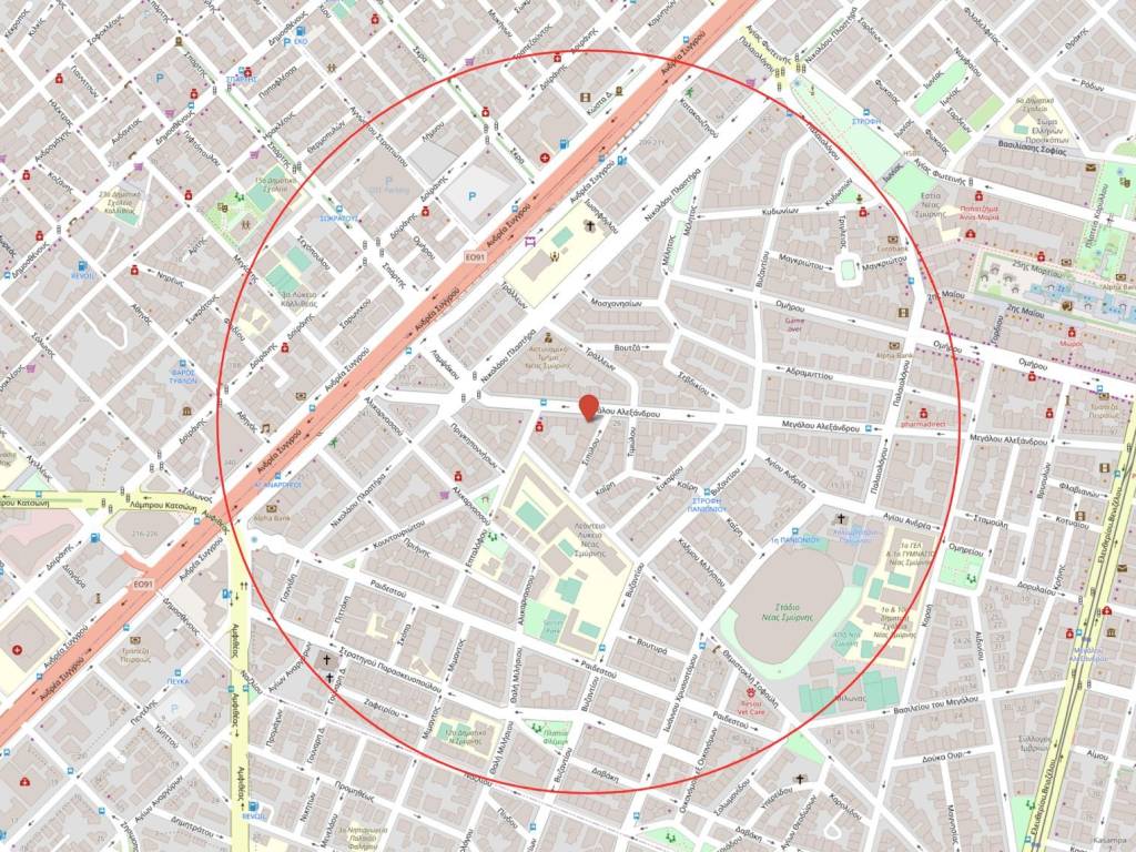 Chrysaki, Nea Smyrni (Athens - South Suburbs) - 24 Megalou Alexandrou Apartment available for rent €450 / month, 33 sq.m., built in 1980, consisting of 1 bedroom, 1 kitchen, 1 large bathroom, and a large reception area (hall). The apartment has a street façade on the elevated ground floor of the building and has a balcony overlooking the garden. It was renovated in 2017 (new electrical, plumbing, floor sanding, and painting). Fully furnished (fridge, washing machine, electric stove, oven, desk, bookcase, bed with mattress, kitchen table with chairs, sofa that becomes a bed, 2 coffee tables, lamps in every area). Characteristics: Excellent condition, has intercom, and wooden frames, in a quiet area with lots of greenery, large front yards, long sidewalks, and wide roads. It is 100m from Leonteio, 1.5 km from Harokopion University, 2km from Panteio School, 600m from Nea Smyrni square and the Nea Smyrni grove. Close to public transport (60m from a bus stop, 250m from Syngrou Avenue and 1.8 km from the Kallithea Electric Station stop). Close to basic services (70m from bakery, 30m from mini market and pharmacy) Green circle - 250m radius, Red circle - 500m radius, Blue circle - 1000m radius More information on the phones: 693 46 83 517 The apartment is leased and will be available from ***/*******.