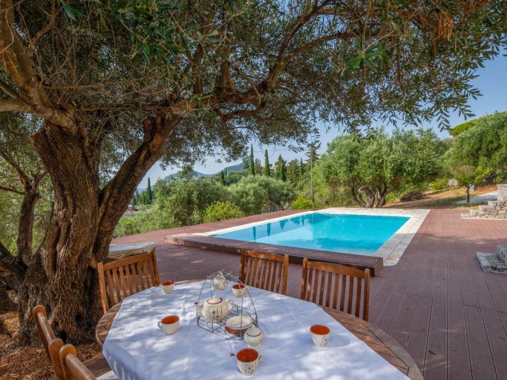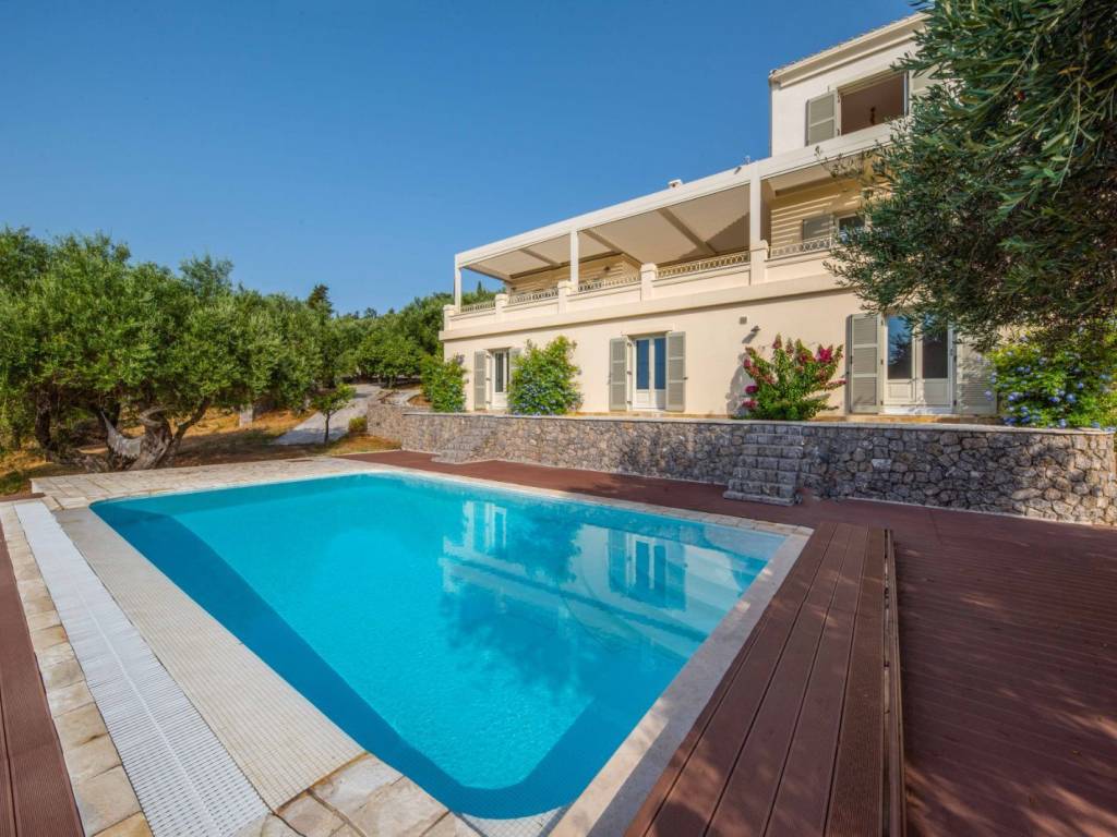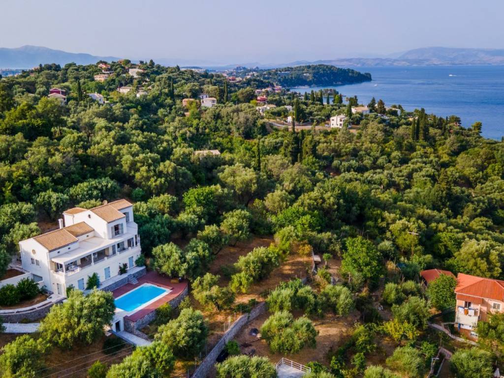 This expansive villa is nestled in the prestigious Gastouri area of Corfu, Greece, occupying a generous plot of 5,101 sq.m. Offering sweeping vistas of the Ionian Sea and Greece's mainland, this property exudes elegance and sophistication. The ground floor welcomes you with a bright and airy open-plan lounge/kitchen/diner, featuring a striking ceiling-mounted fireplace. Completing this level is a bedroom with an attached bathroom and shower, with large French doors leading to a covered balcony, perfect for unwinding while soaking in the breathtaking views. Notably, the property boasts a unique, automatic, bioclimatic pergola with rain sensors, offering customizable shade options. Ascending to the first floor, a hallway leads to two bedrooms, each with its own bathroom and shower, along with balcony doors offering sea views. Additionally, there's an extra room on this floor, ideal for use as a children's bedroom, office, or storage space. The basement comprises a bedroom, storage room, cellar, jacuzzi, and access to a spacious garage. Equipped with air conditioning, central heating, and an alarm system, the villa ensures comfort and security. Sold fully furnished (excluding personal belongings), the villa features an independent apartment at the pool level, complete with a living room, bedroom, and bathroom. The meticulously landscaped plot boasts approximately 60 olive trees and a decked pool area with sea views. Fenced and gated for privacy and security, the property offers tranquility and seclusion. The nearby Perama Beach is approximately 4km away, while Corfu town and the airport are approximately 7km away.
