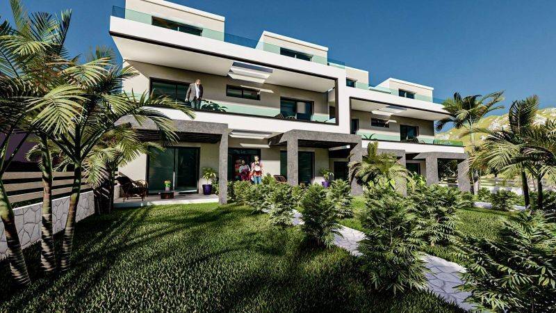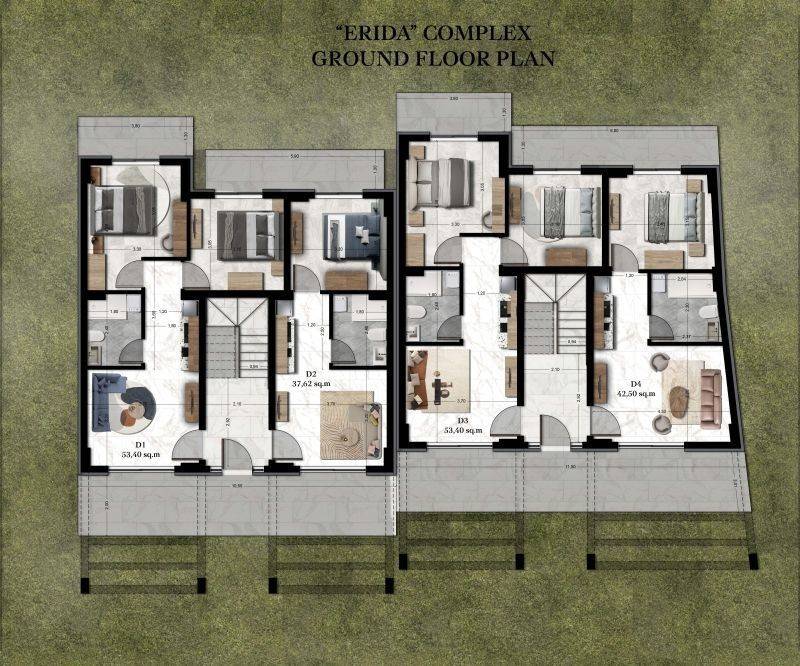 • 2 Ground floor apartments of 53,4sq.m, consisting of a living room with kitchen, 2 bedrooms, 1 bathroom.
