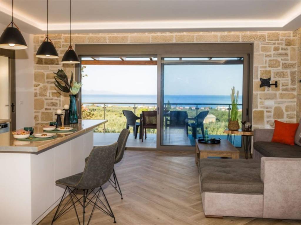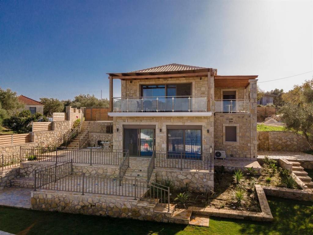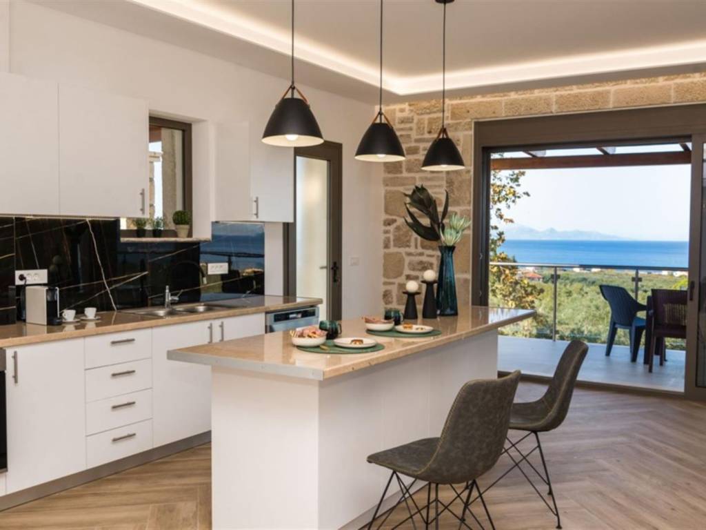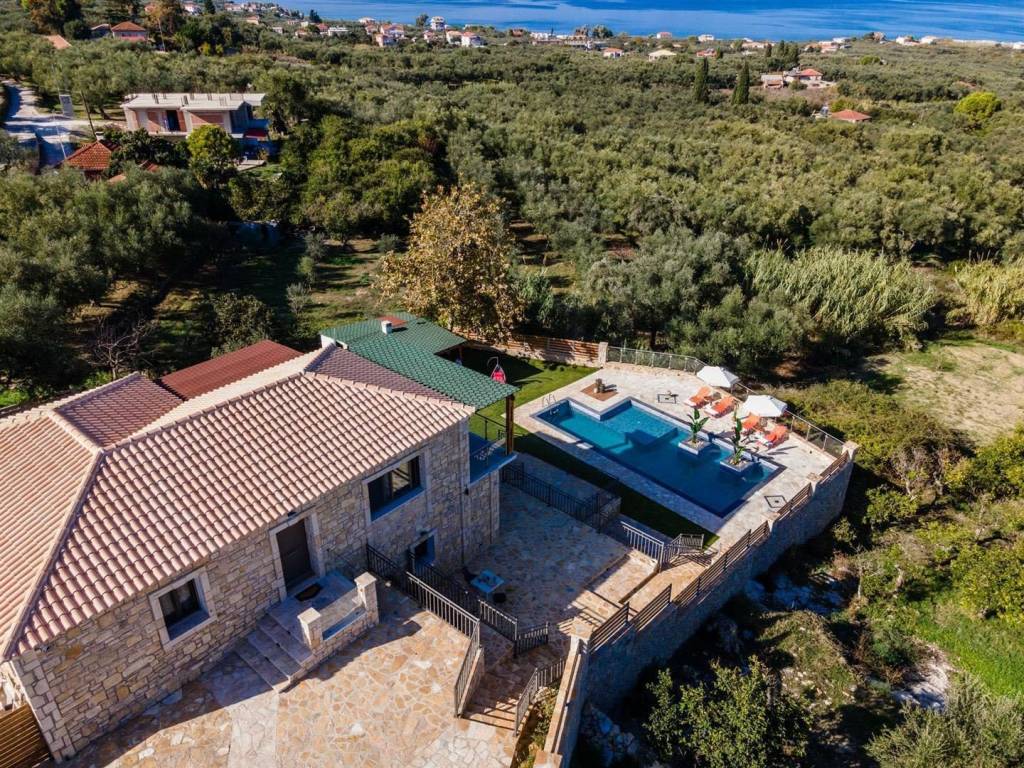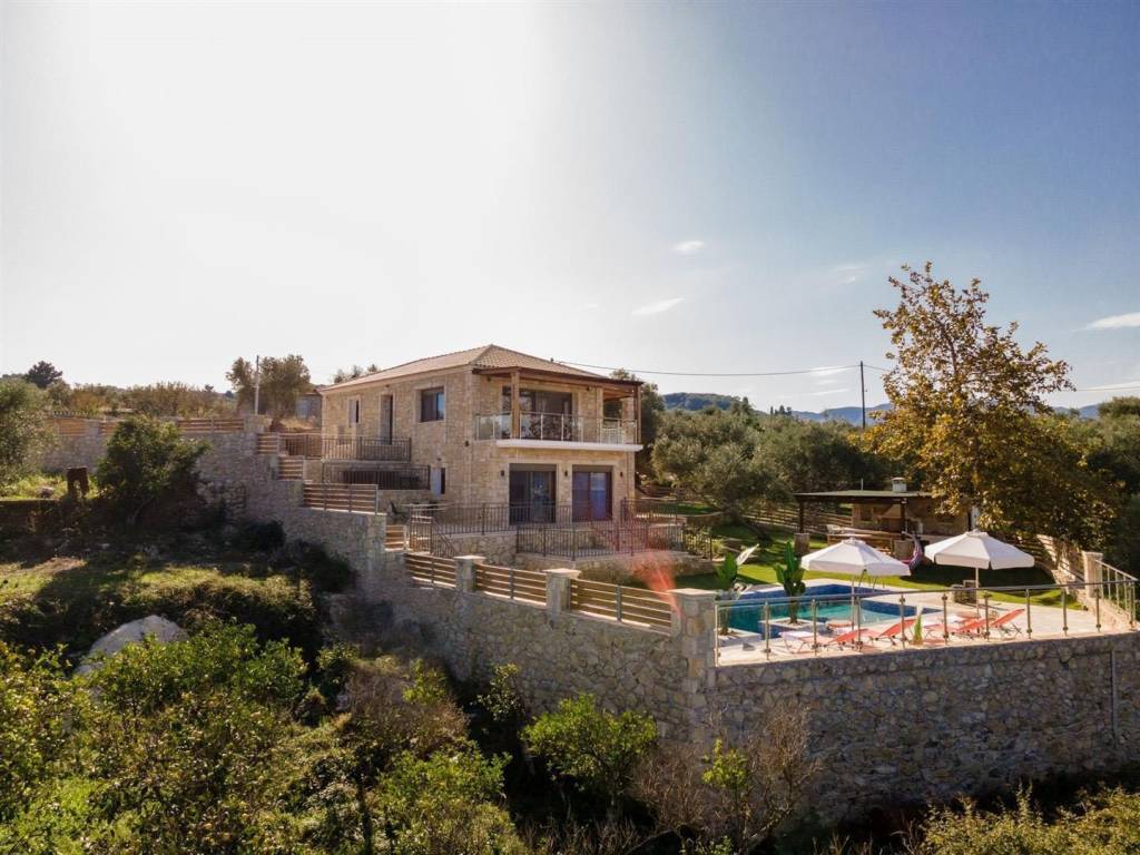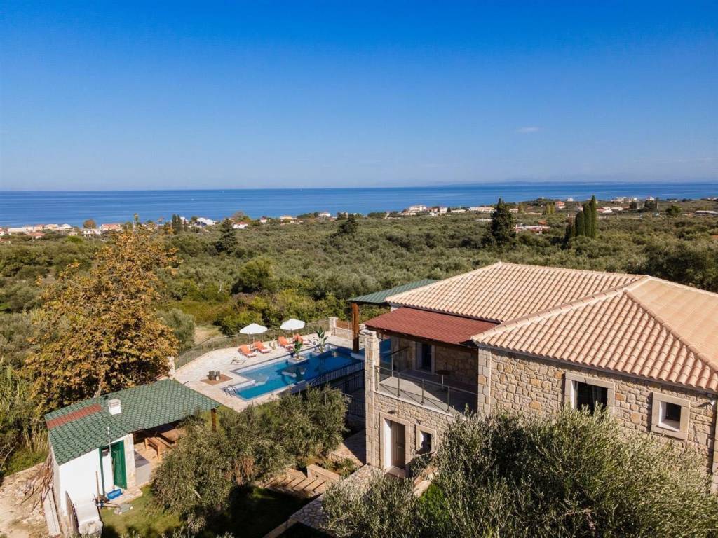4-bedroom, 4-bathroom, 200m2 elevated stone house with all 180 degrees view over the Ionian sea, on 1200m2 plot. INTERIOR Located in the quiet area of Amoudi only 700m away from the closest beach, the villa is sold fully furnished. This fantastic stone house has been recently built on the original ruins of an old farmhouse, surrounded by olive trees and you are spoiled with sea views from each level all the way to the pool and built BBQ area. This property has great rental potential or all the comfort for a permanent home. Or a combination of both as it consists of 2 independent living quarters with separate access to the land and entrances. On the 1st floor you will find the entrance plus parking area of the 130m2 main house which consist of: - 3 bedrooms with each adjacent walk-in shower bathroom - Modern open kitchen with island - WC - Open living room - Panoramic balcony in the front and on the side of the bedrooms Studio on the ground floor 70m2: - Accessible directly by car and parking on that level - Big open bedroom with French doors looking over the pool area and view to the sea. -Kitchenette - Bathroom shower and washing machine EXTERIOR The plot is closed in by a stone wall, has an electric gate and is secured by cameras outside. The pool has a lovely setting and with its island and lower part for children, a unique pool. On the same level as the pool, you have a covered exterior BBQ area with sink and a table. A small bathroom is available for use when outside at the pool area. As part of the lovely sea view, you get a view over the olive groves of the neighborhood and the quiet farmlands of Amoudi. THE AREA The area of Amoudi has not been overrun by tourists, is ideal for walking and comes with several smaller beaches, ready to be explored. Within walking distance there are local tavernas by the sea, coffee shops, the odd bar and minimarkets for your daily needs. Going to Zakynthos town, the airport or bigger resorts like Tsilivi are within a short drive. The back area of Amoudi is agriculture land and hills with olive groves and small villages. FEATURES • All rooms have AC units • Pipes for a future installation of a central heating are in place • Cables fitted for the installation of a house alarm • All aluminum double glazed windows with fly screens • Unique pool with tiled steps and islands • Tiled sundeck around the pool • Covered outside BBQ built area with WC • Electric gate