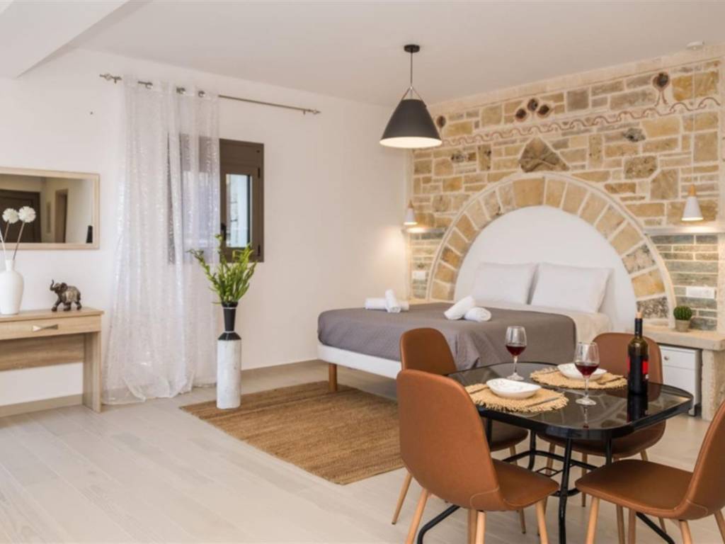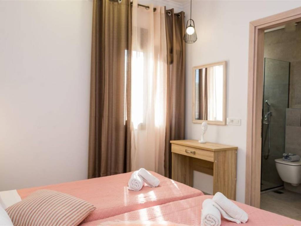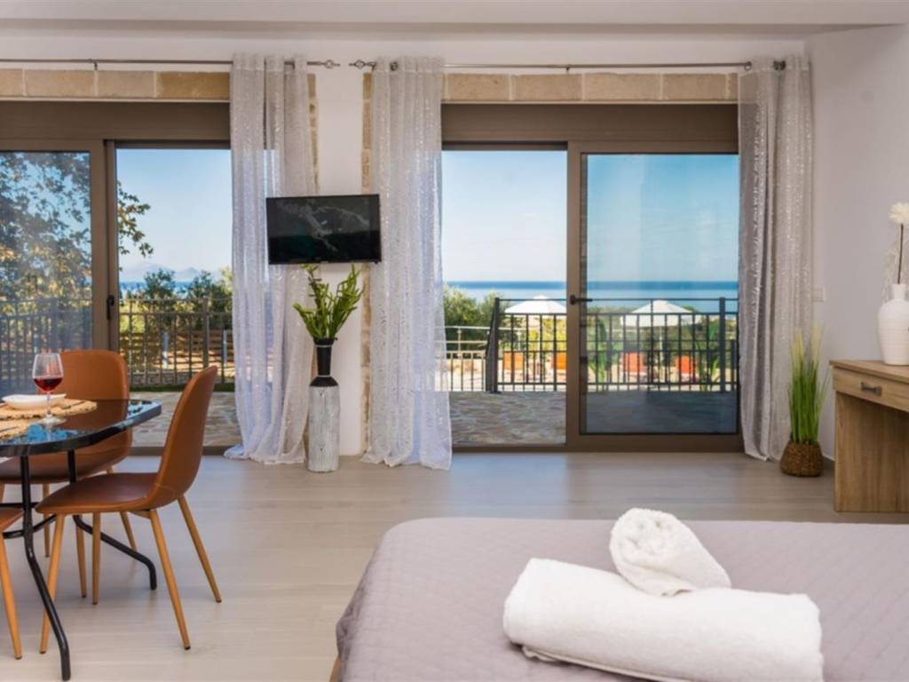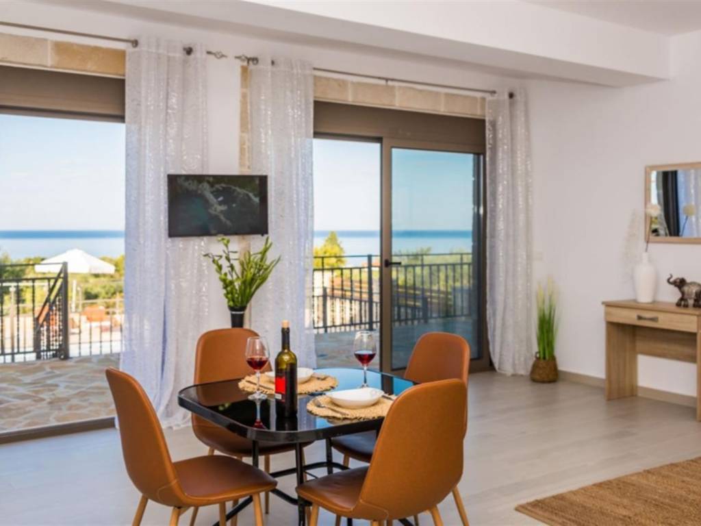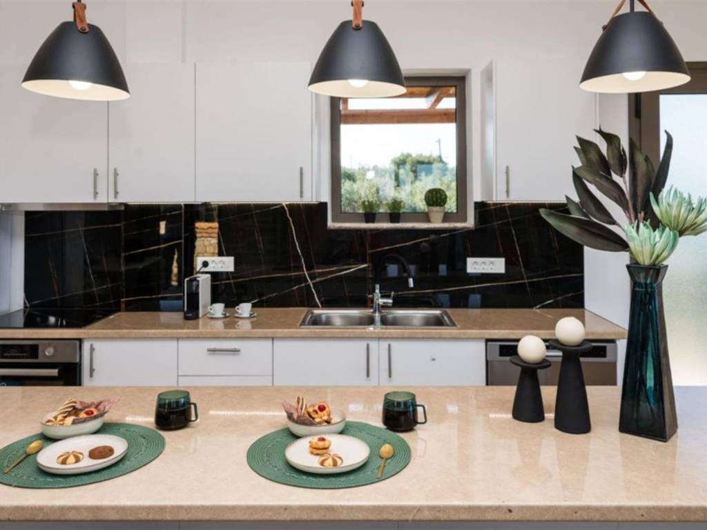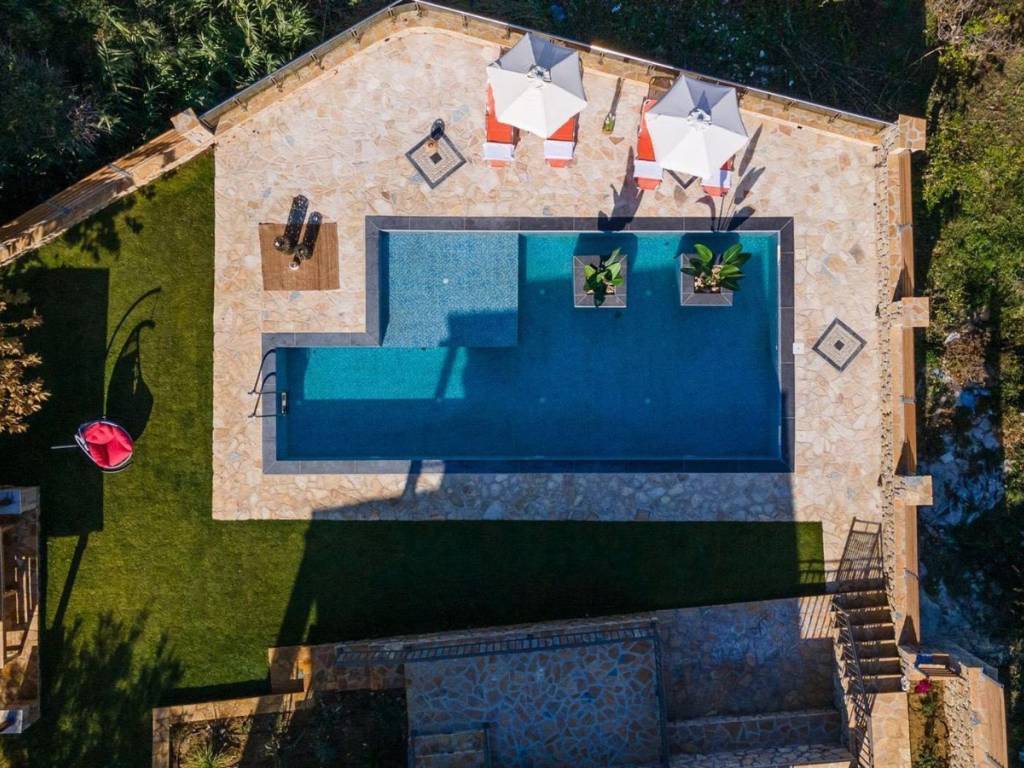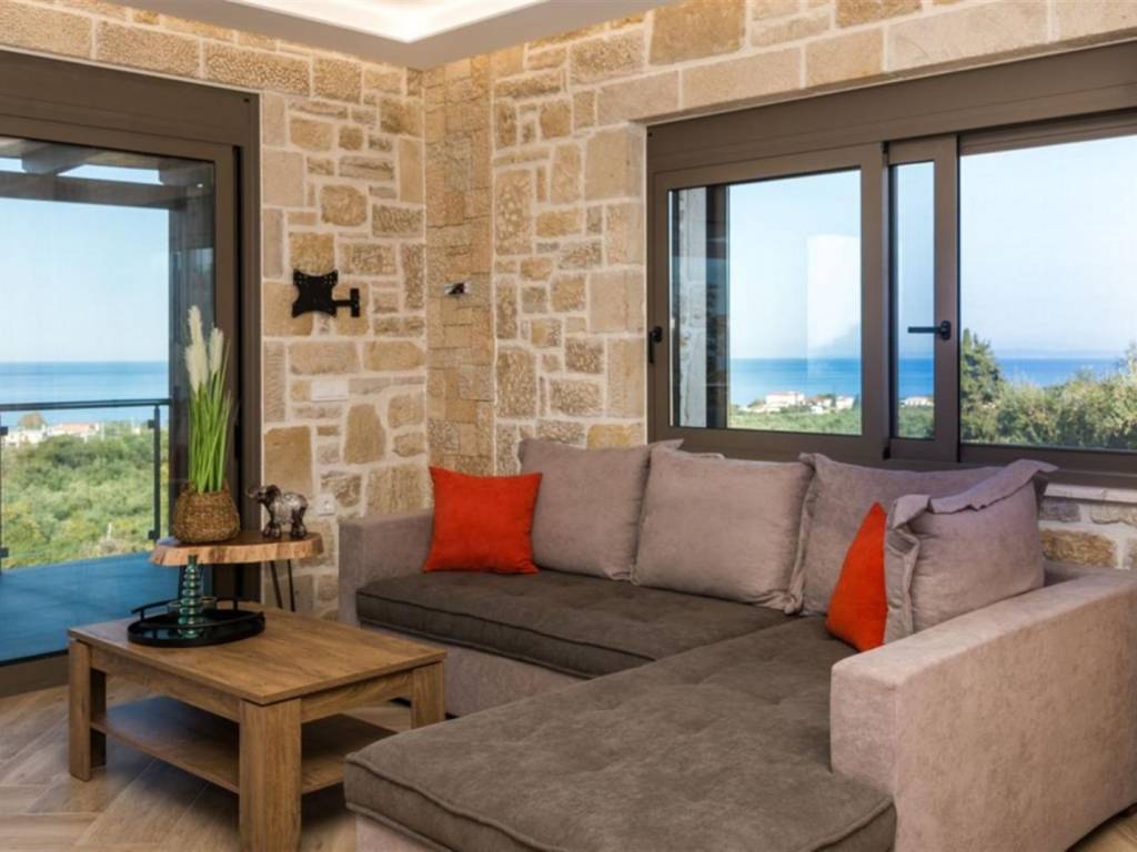 4-bedroom, 4-bathroom, 200m2 elevated stone house with all 180 degrees view over the Ionian sea, on 1200m2 plot. INTERIOR Located in the quiet area of Amoudi only 700m away from the closest beach, the villa is sold fully furnished. This fantastic stone house has been recently built on the original ruins of an old farmhouse, surrounded by olive trees and you are spoiled with sea views from each level all the way to the pool and built BBQ area. This property has great rental potential or all the comfort for a permanent home. Or a combination of both as it consists of 2 independent living quarters with separate access to the land and entrances. On the 1st floor you will find the entrance plus parking area of the 130m2 main house which consist of: - 3 bedrooms with each adjacent walk-in shower bathroom - Modern open kitchen with island - WC - Open living room - Panoramic balcony in the front and on the side of the bedrooms Studio on the ground floor 70m2: - Accessible directly by car and parking on that level - Big open bedroom with French doors looking over the pool area and view to the sea. -Kitchenette - Bathroom shower and washing machine EXTERIOR The plot is closed in by a stone wall, has an electric gate and is secured by cameras outside. The pool has a lovely setting and with its island and lower part for children, a unique pool. On the same level as the pool, you have a covered exterior BBQ area with sink and a table. A small bathroom is available for use when outside at the pool area. As part of the lovely sea view, you get a view over the olive groves of the neighborhood and the quiet farmlands of Amoudi. THE AREA The area of Amoudi has not been overrun by tourists, is ideal for walking and comes with several smaller beaches, ready to be explored. Within walking distance there are local tavernas by the sea, coffee shops, the odd bar and minimarkets for your daily needs. Going to Zakynthos town, the airport or bigger resorts like Tsilivi are within a short drive. The back area of Amoudi is agriculture land and hills with olive groves and small villages. FEATURES • All rooms have AC units • Pipes for a future installation of a central heating are in place • Cables fitted for the installation of a house alarm • All aluminum double glazed windows with fly screens • Unique pool with tiled steps and islands • Tiled sundeck around the pool • Covered outside BBQ built area with WC • Electric gate