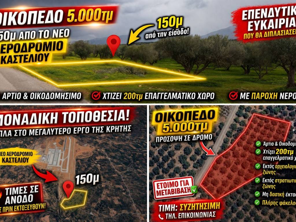 ΕΥΚΑΙΡΙΑ – ΟΙΚΟΠΕΔΟ ΔΙΠΛΑ ΣΤΟ ΝΕΟ ΑΕΡΟΔΡΟΜΙΟ ΚΑΣΤΕΛΙΟΥ (150μ!) Από τα λίγα διαθέσιμα ακίνητα τόσο κοντά στο νέο αεροδρόμιο! Πωλείται επενδυτικό οικόπεδο 5.000 τ.μ. σε στρατηγικό σημείο, μόλις 150 μέτρα από την πρώτη είσοδο του νέου αεροδρομίου Καστελίου – μία περιοχή που ήδη εκτοξεύεται επενδυτικά. ΧΑΡΑΚΤΗΡΙΣΤΙΚΑ: ✔ Άρτιο & οικοδομήσιμο κατά κανόνα ✔ Χτίζει 200 τ.μ. επαγγελματικό χώρο ✔ Επιφάνεια: 5.000 τ.μ. ✔ Παροχή νερού ✔ Εύκολη πρόσβαση – άμεσα αξιοποιήσιμο 100% ΚΑΘΑΡΟ ΑΚΙΝΗΤΟ: ✔ Όχι αρχαιολογική ζώνη ✔ Όχι στρατιωτική επιτήρηση ✔ Όχι δασικό ✔ Έτοιμο για μεταβίβαση – πλήρης φάκελος ΙΔΑΝΙΚΟ ΓΙΑ: ✈ Rent a car Τουριστική μονάδα / Airbnb Parking – επιχειρήσεις γύρω από το αεροδρόμιο Logistics / αποθήκες