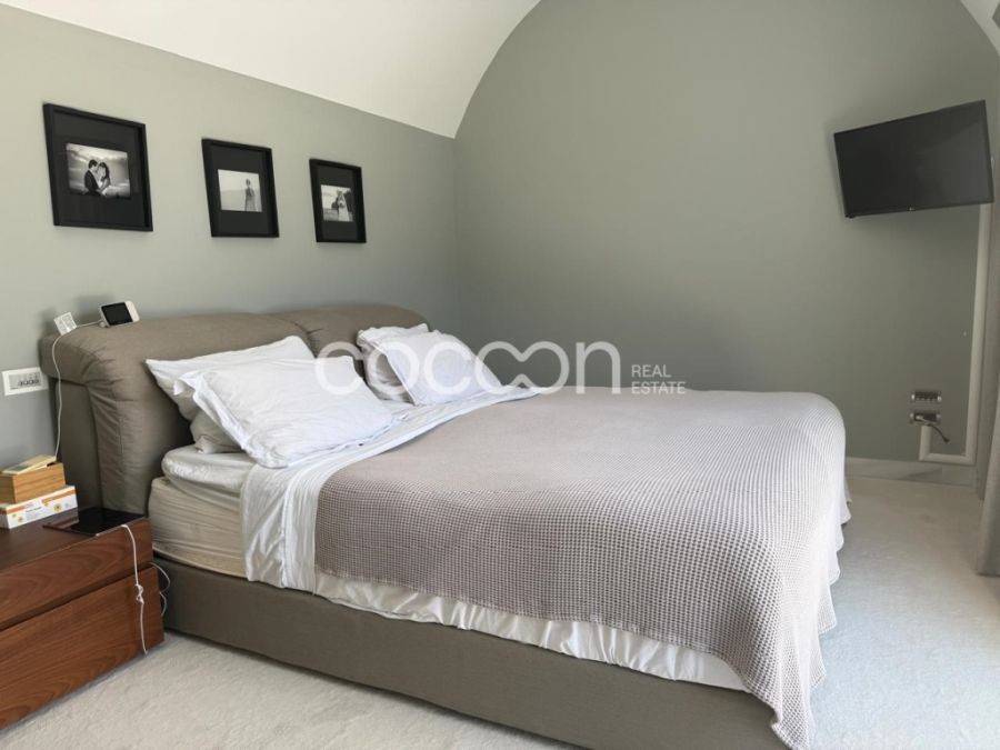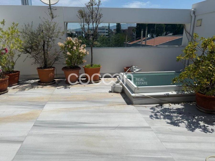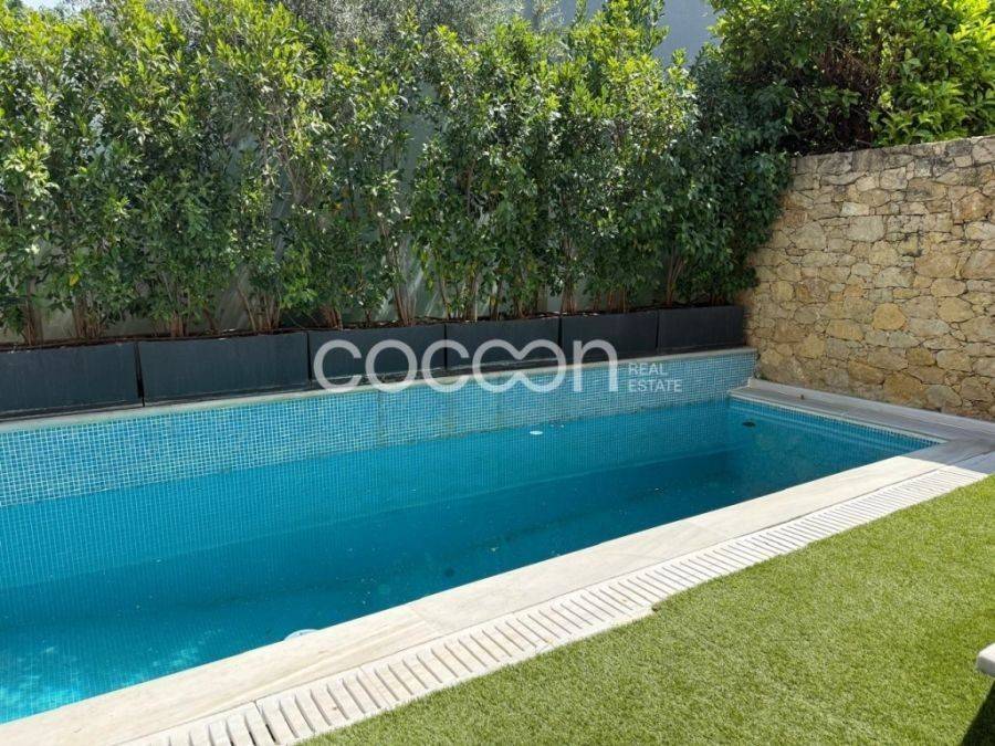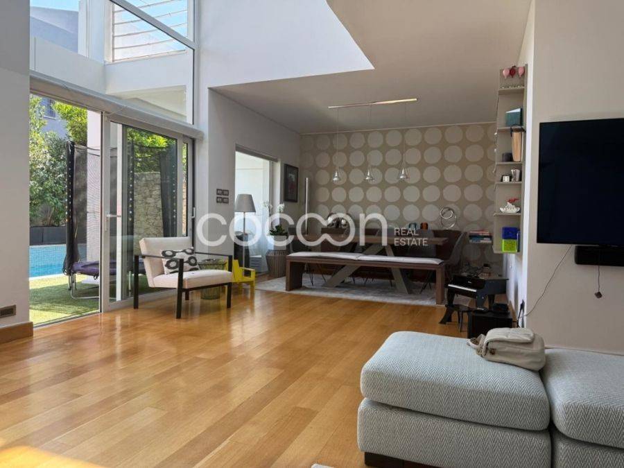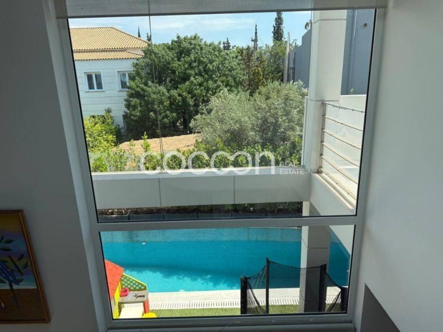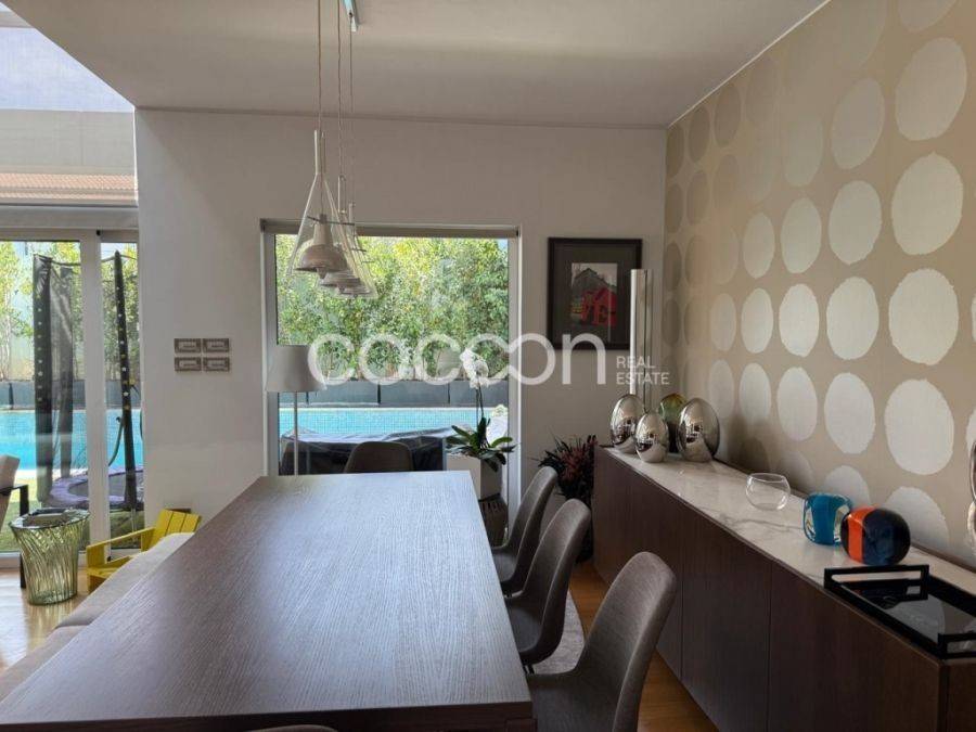 Όμορφη μοντέρνα μεζονέτα, 203 τ.μ. συνολικά με ανεξάρτητη είσοδο και αποκλειστικής χρήσης κήπο και πισίνα (20τ.μ. περίπου). Η κατοικία βρίσκεται σε συγκρότημα 5 συνολικά μεζονετών (ημιεφαπτόμενων- semidetached). Είναι κατασκευής του 2000 και ανακαινισμένη το 2004. Έχει κατασκευαστεί με πολύ υψηλής ποιότητας και αισθητικής υλικά. Το ισόγειο αποτελείται από όμορφο χώρο υποδοχής με τζάκι και διπλό ύψος (mezzanine), τραπεζαρία, ευρύχωρη κουζίνα πλήρως εξοπλισμένη με ηλεκτρικές συσκευές gaggenau και μπάνιο επισκεπτών. Ασανσέρ αλλά και σκάλα οδηγούν στον 1ο όροφο, όπου βρίσκονται 2 παιδικά υπνοδωμάτια. Το ένα διαθέτει επιπλέον walk- in closet κα δικό του μπάνιο ενώ το άλλο διαθέτει 1 εξωτερικό μπάνιο. Η σκάλα οδηγεί στον 2ο όροφο, που αναπτύσσεται το διαμέρισμα των γονιών και αποτελείται από ένα ευρύχωρο υπνοδωμάτιο, μεγάλο dressing, μπάνιο με douche και γραφείο. Το επίπεδο αυτό βγάζει σε μεγάλη βεράντα με απόλυτη ιδιωτικότητα. Η κατοικία διαθέτει ένα ακόμα επίπεδο στο υπόγειο όπου αναπτύσσονται οι βοηθητικοί χώροι: Μεγάλο playroom και home cinema με προδιαγραφές για υψηλής ποιότητας ακουστική, δωμάτιο προσωπικού με μπάνιο, ένα ακόμα μπάνιο και laundry καθώς και μια εσωτερική αποθήκη (20τ.μ.). Το επίπεδο αυτό συνδέεται με το υπόγειο garage που μπορεί να φιλοξενήσει 1 αυτοκίνητο. Λοιπές προδιαγραφές: -Κήπος αποκλειστικής χρήσης (30 τ.μ.) -Πισίνας αποκλειστικής χρήσης -Τριπλά τζάμια -Δρύινα δάπεδα σε όλους τους χώρους -Αυτόνομη θέρμανση με πετρέλαιο -Εσωτερικό ασανσέρ -Συναγερμός -Πόρτα ασφαλείας -Κάμερες ασφαλείας - Boiler -Smart home -Ηλεκτρικά ρολά -Ηλεκτρικές τέντες