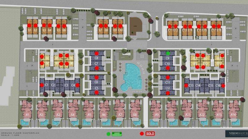 • Α: 14 Διώροφες μονοκατοικίες 152,31 τ.μ. που αποτελούνται από σαλόνι, τραπεζαρία, κουζίνα, 4 υπνοδωμάτια εκ των οποίων το 1 είναι master με μπάνιο, 2 ανεξάρτητα μπάνια, ιδιωτική πισίνα.